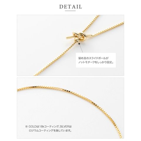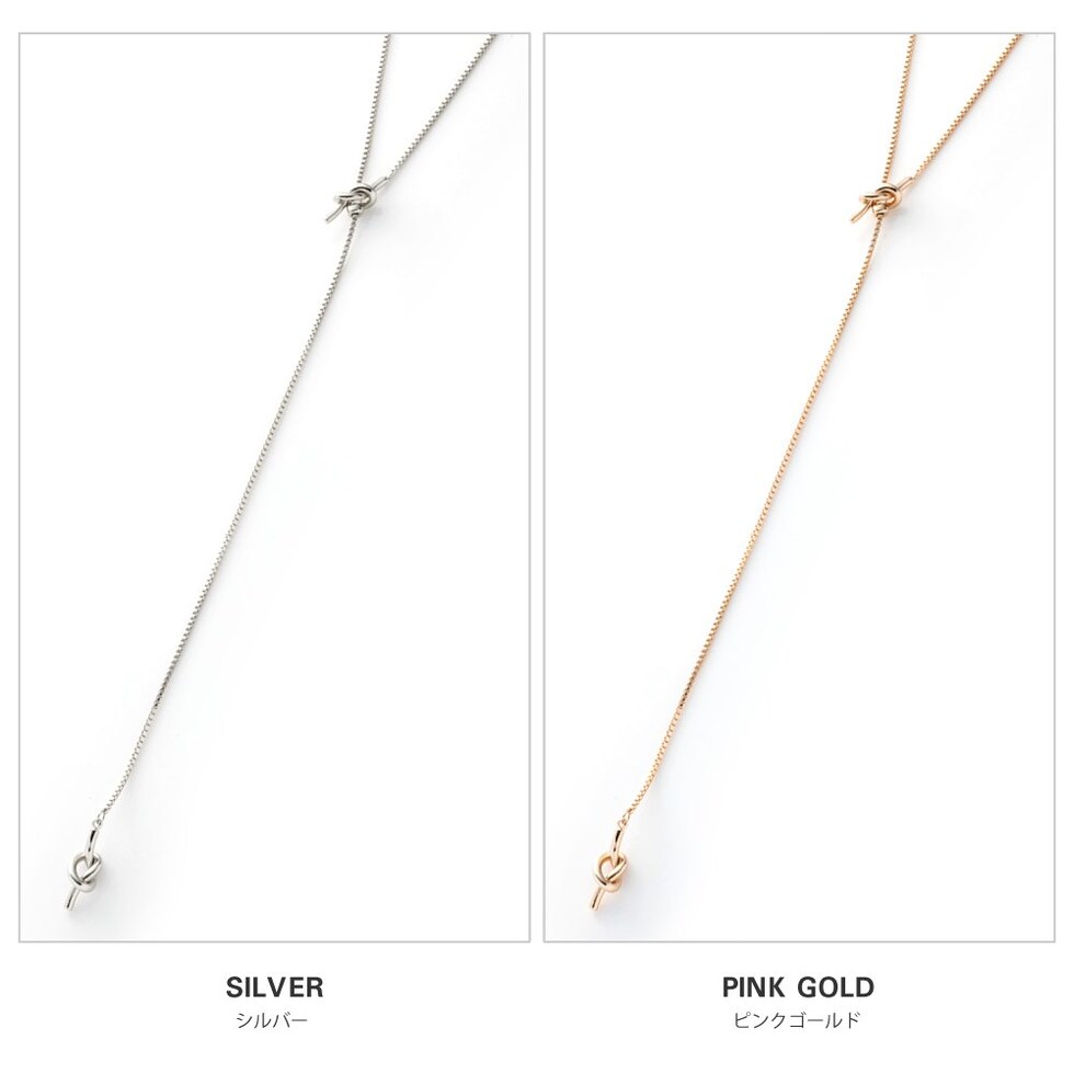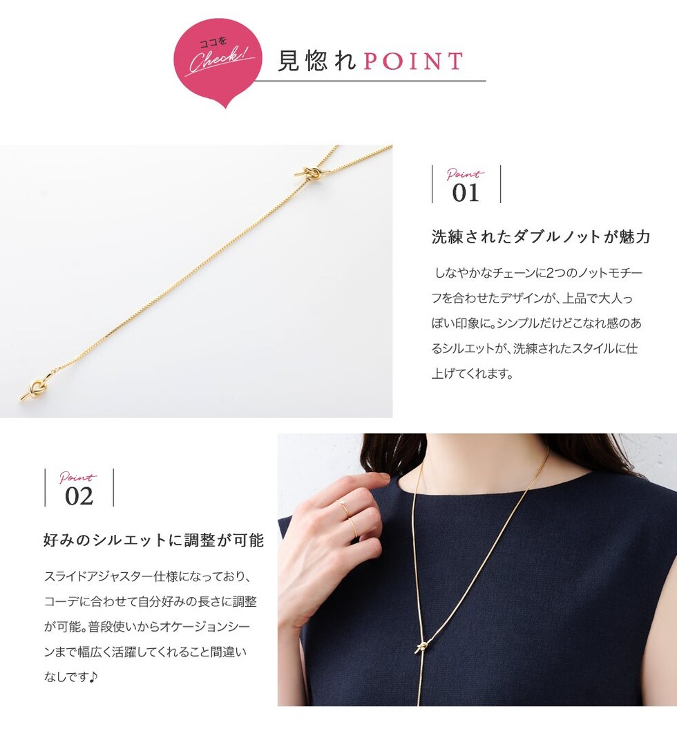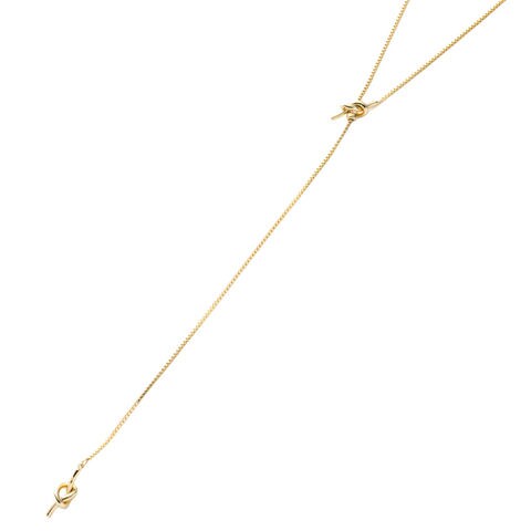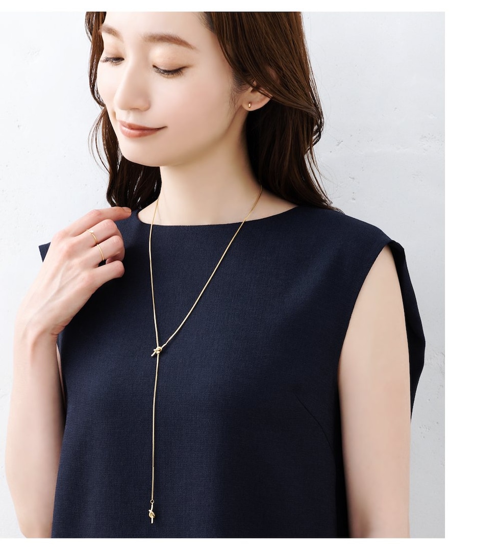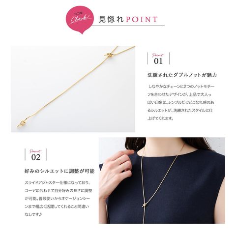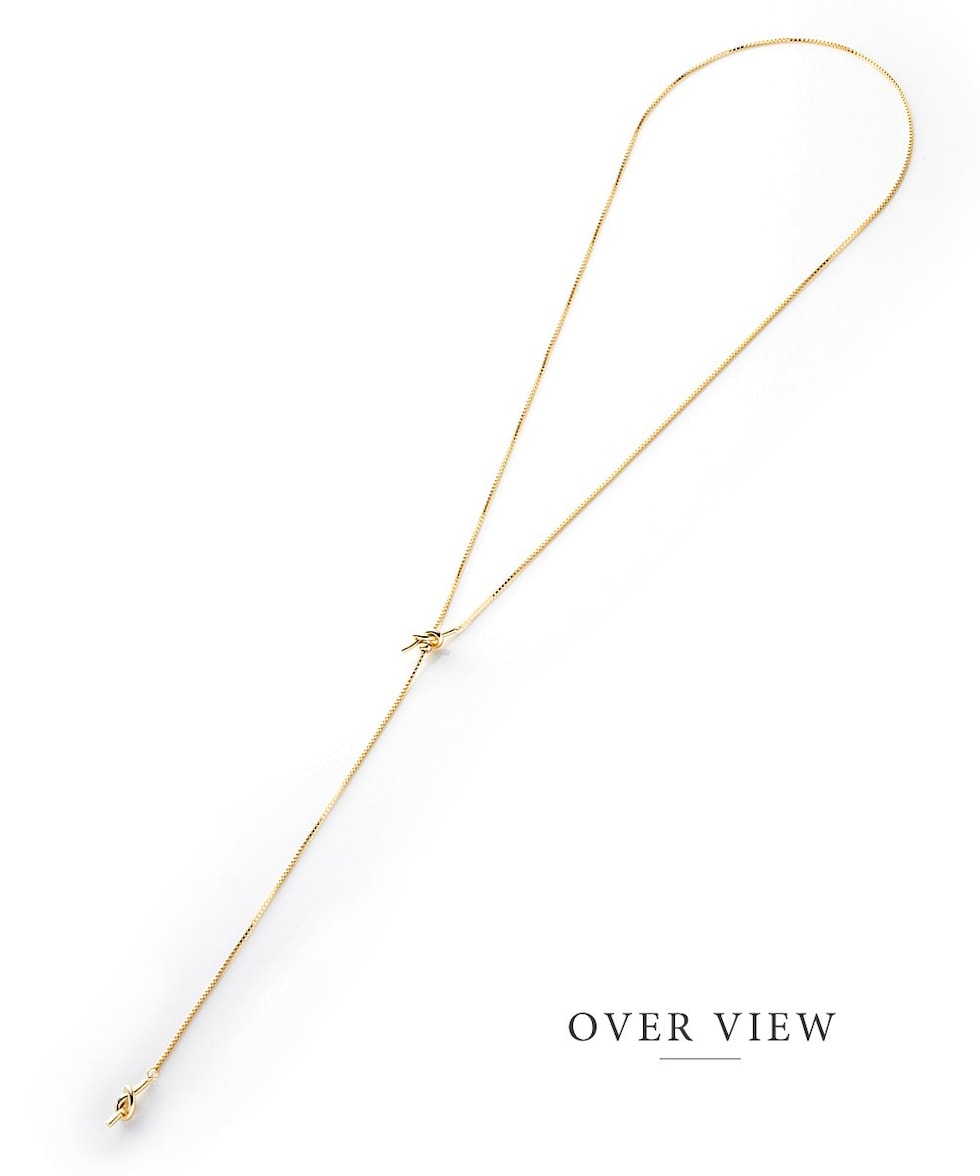 滑らかなベネチアンチェーン×ダブルノットのY字ネックレス。お好みの長さに合わせてスライドボールがしっかりと固定してくれるから、どんなコーデにも合わせやすい優秀アイテムです◎