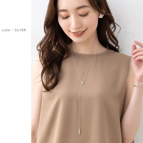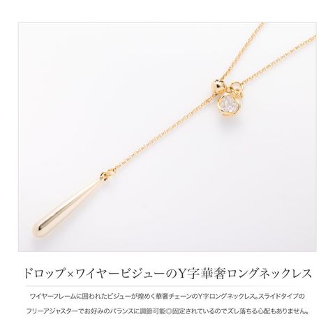 ワイヤーフレームに囲われたビジューが煌めく華奢チェーンのY字ロングネックレス。スライドタイプのフリーアジャスターでお好みのバランスに調節可能◎固定されているのでズレ落ちる心配もありません。