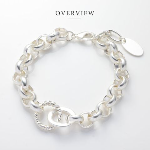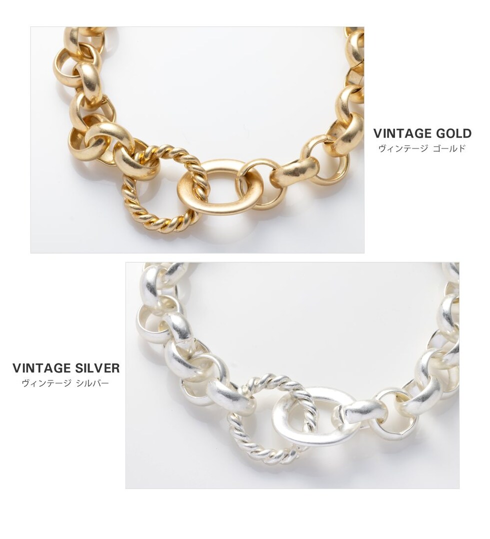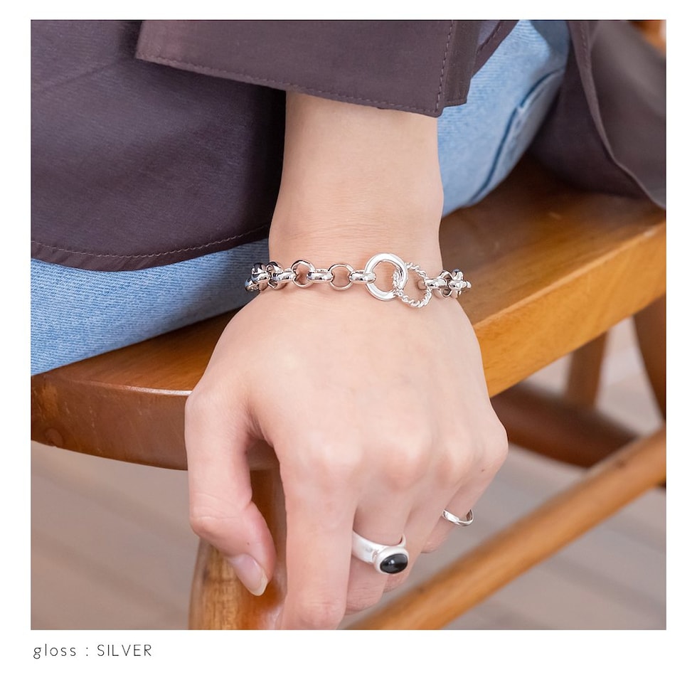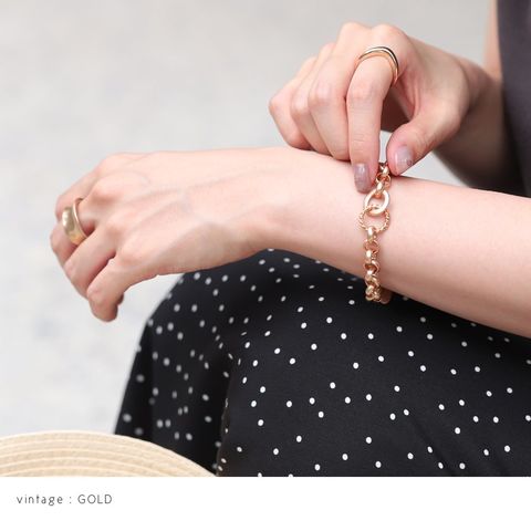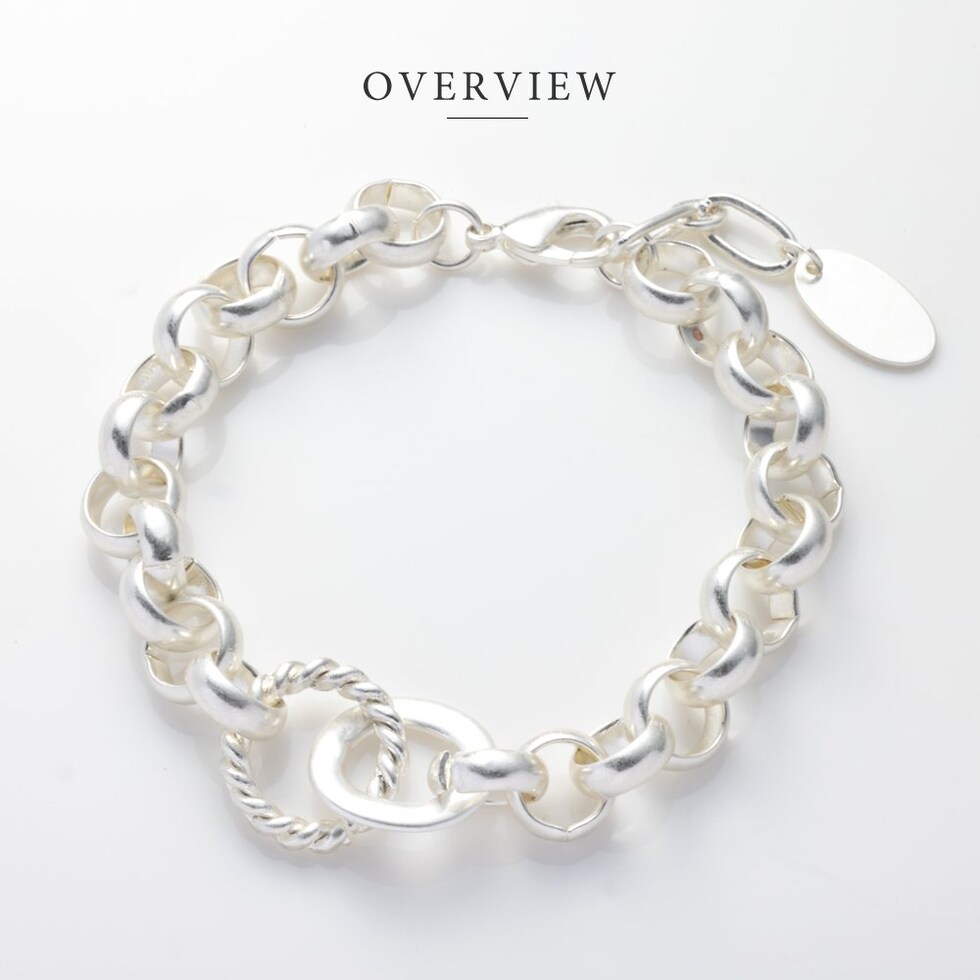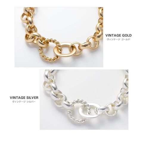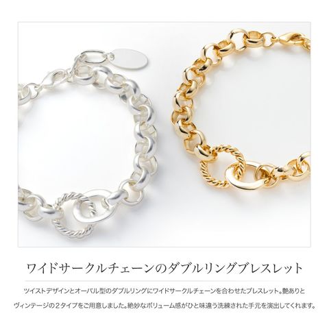 ツイストデザインとオーバル型のダブルリングにワイドサークルチェーンを合わせたブレスレット。艶ありとヴィンテージの2タイプをご用意しました。絶妙なボリューム感がひと味違う洗練された手元を演出してくれます。