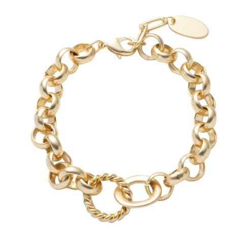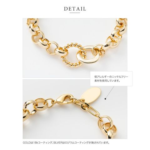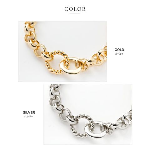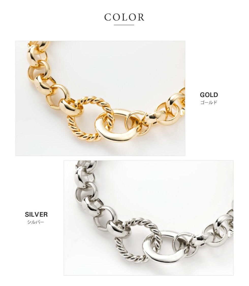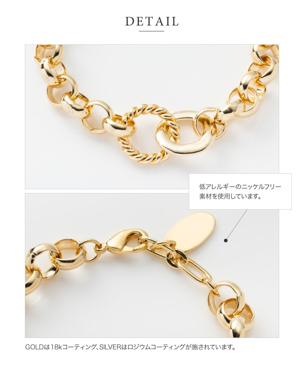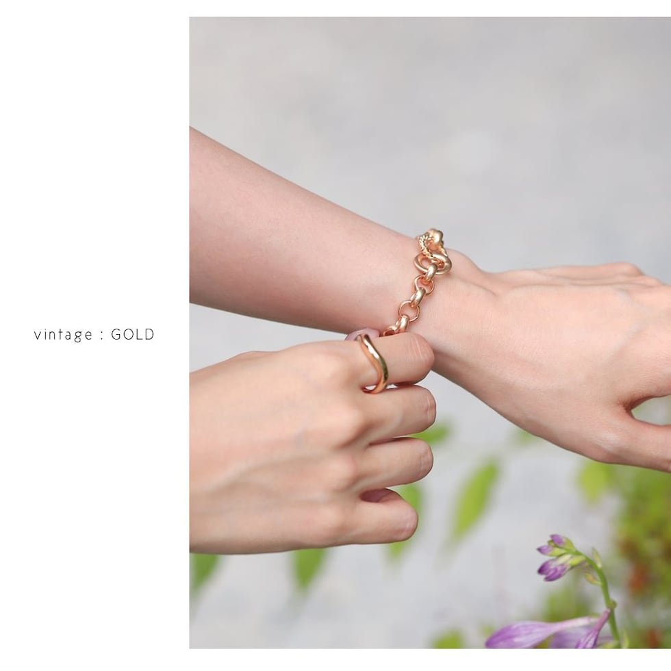 ツイストデザインとオーバル型のダブルリングにワイドサークルチェーンを合わせたブレスレット。艶ありとヴィンテージの2タイプをご用意しました。絶妙なボリューム感がひと味違う洗練された手元を演出してくれます。