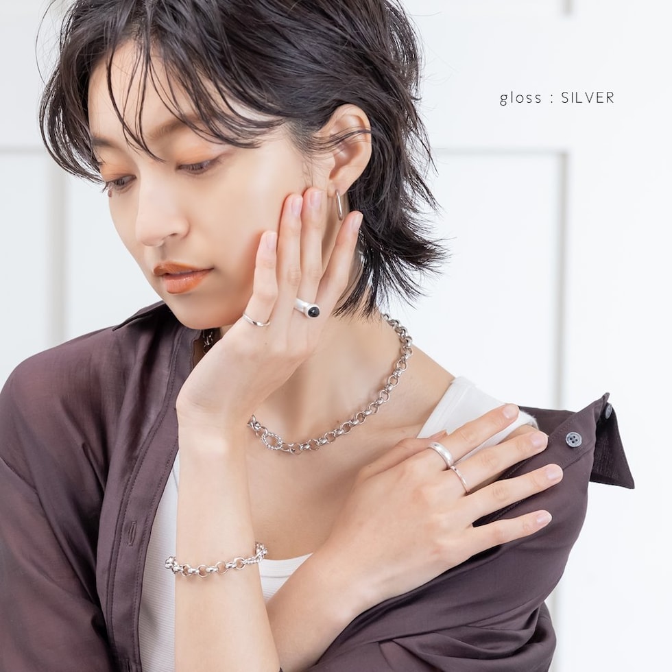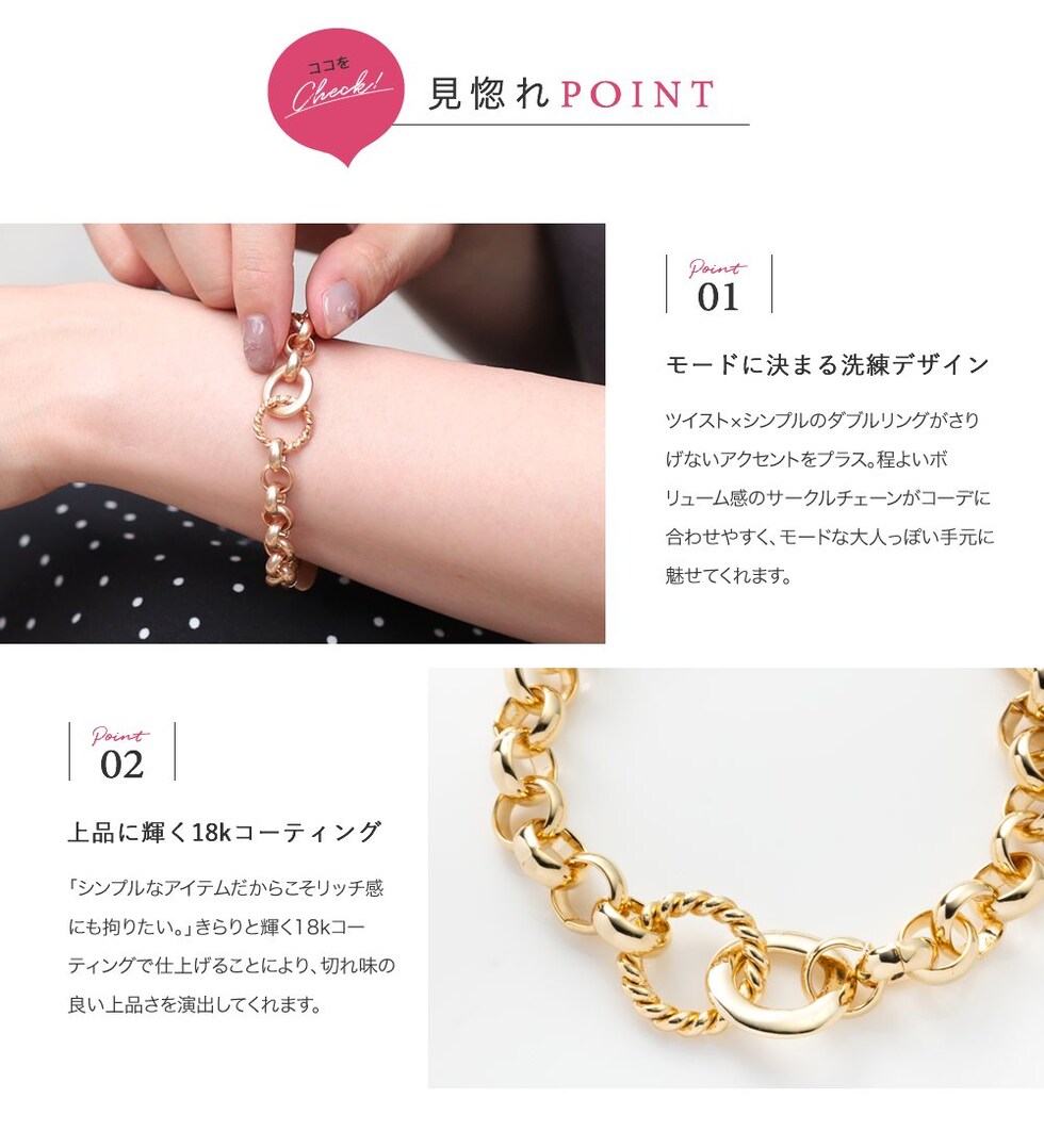 ツイスト×シンプルのダブルリングがさりげないアクセントをプラス。程よいボリューム感のサークルチェーンがコーデに合わせやすく、モードな大人っぽい手元に魅せてくれます。