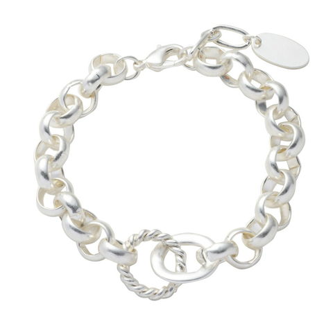 ツイストデザインとオーバル型のダブルリングにワイドサークルチェーンを合わせたブレスレット。艶ありとヴィンテージの2タイプをご用意しました。絶妙なボリューム感がひと味違う洗練された手元を演出してくれます。