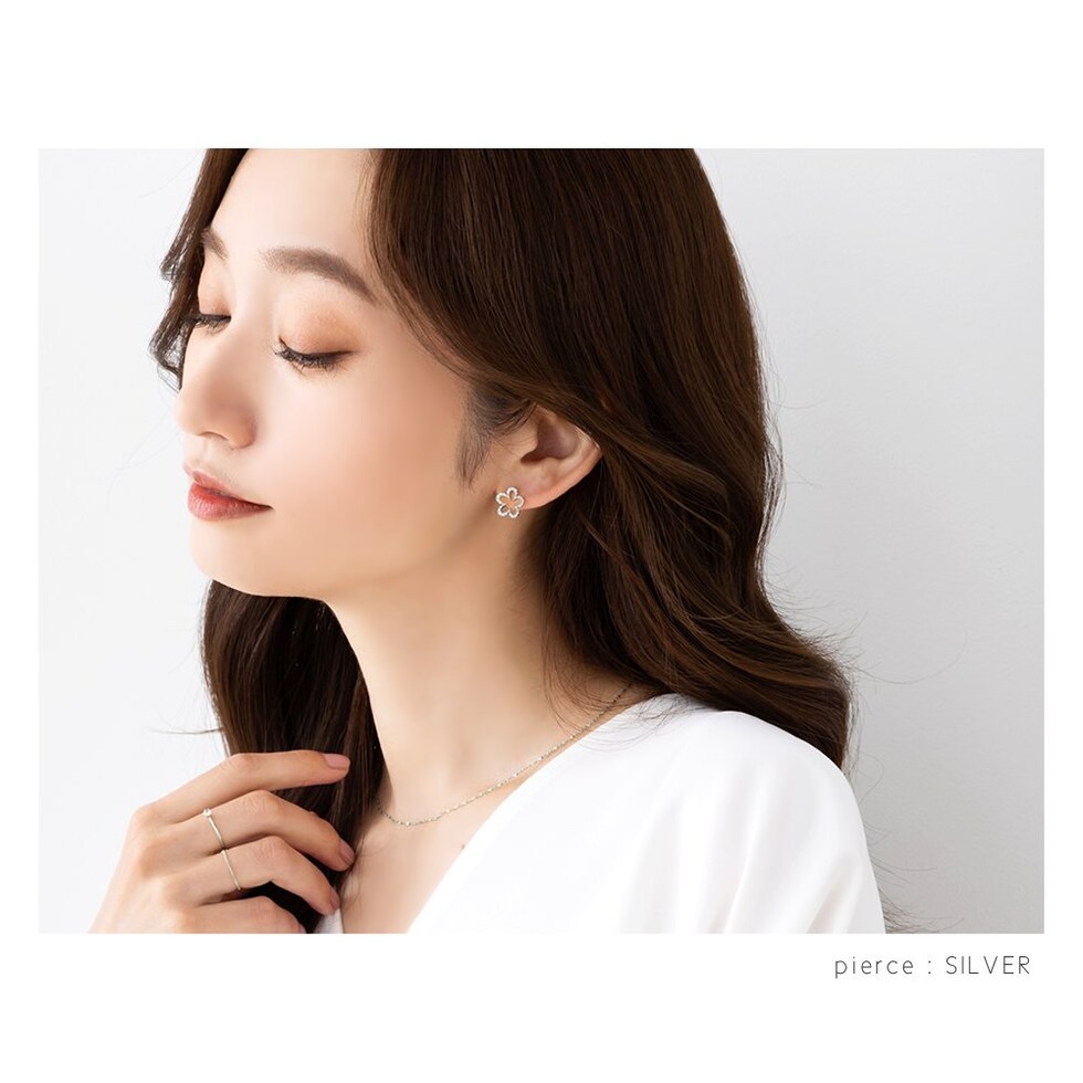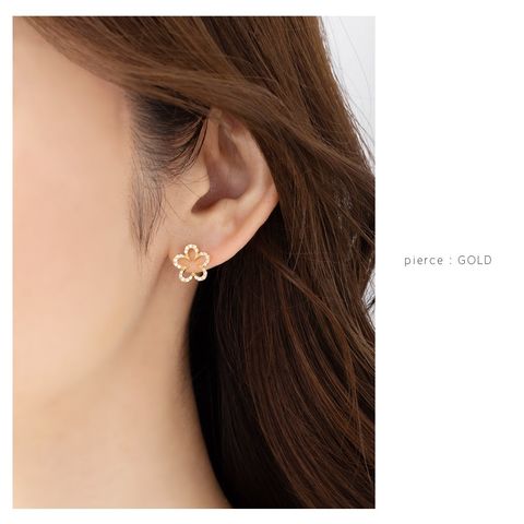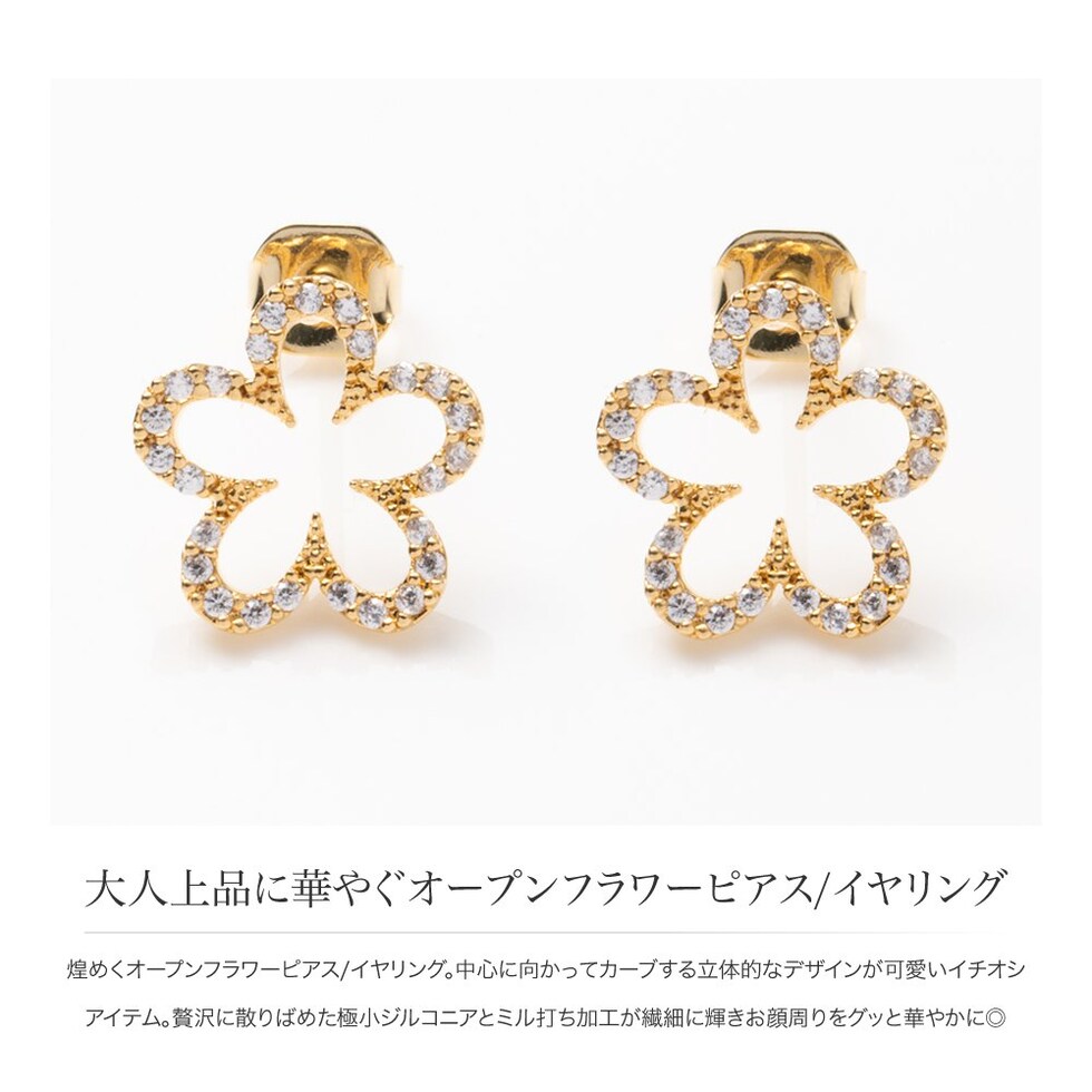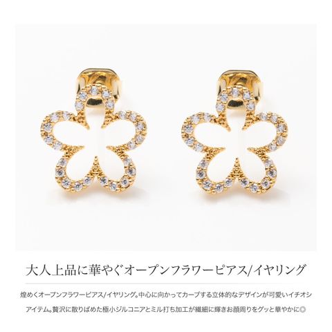 煌めくオープンフラワーピアス/イヤリング。中心に向かってカーブする立体的なデザインが可愛いイチオシアイテム。贅沢に散りばめた極小ジルコニアとミル打ち加工が繊細に輝きお顔周りをグッと華やかに◎