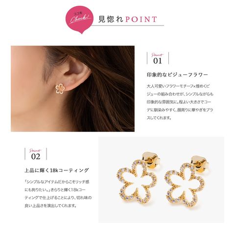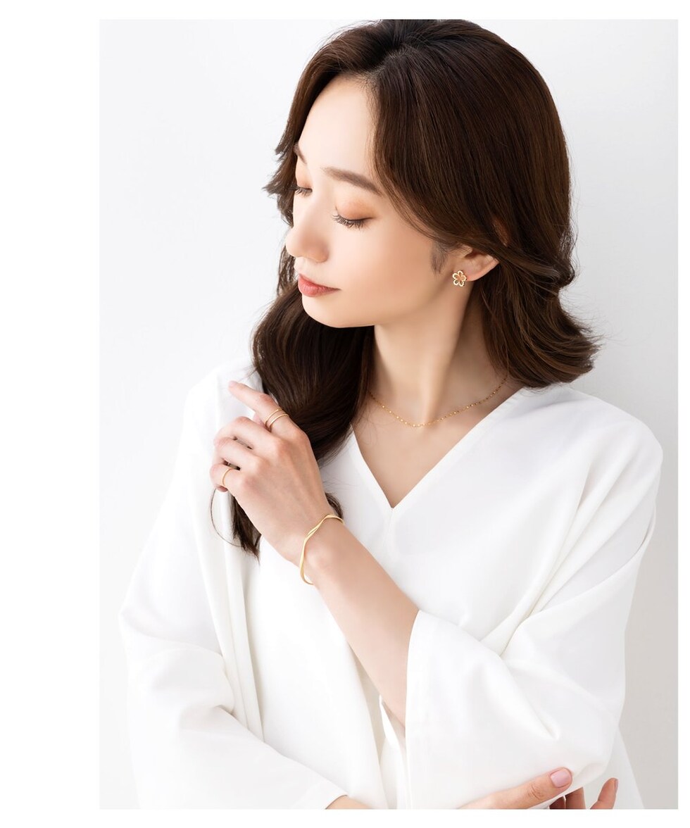 大人可愛いフラワーモチーフ×煌めくビジューの組み合わせが、シンプルながらも印象的な雰囲気に。程よい大きさでコーデに馴染みやすく、顔周りに華やぎをプラスしてくれます。