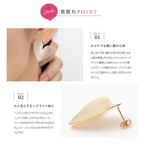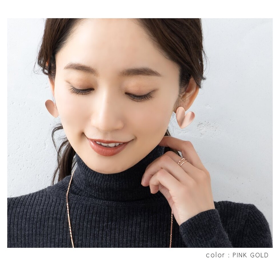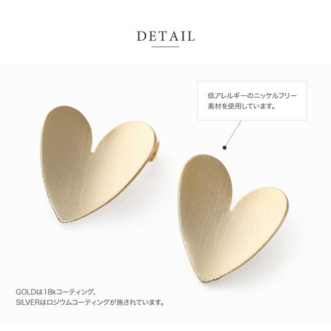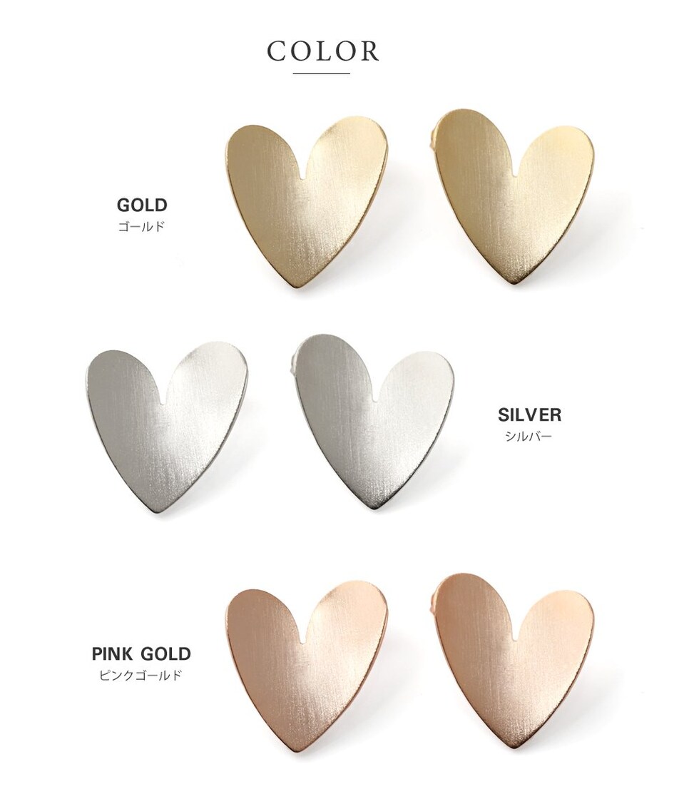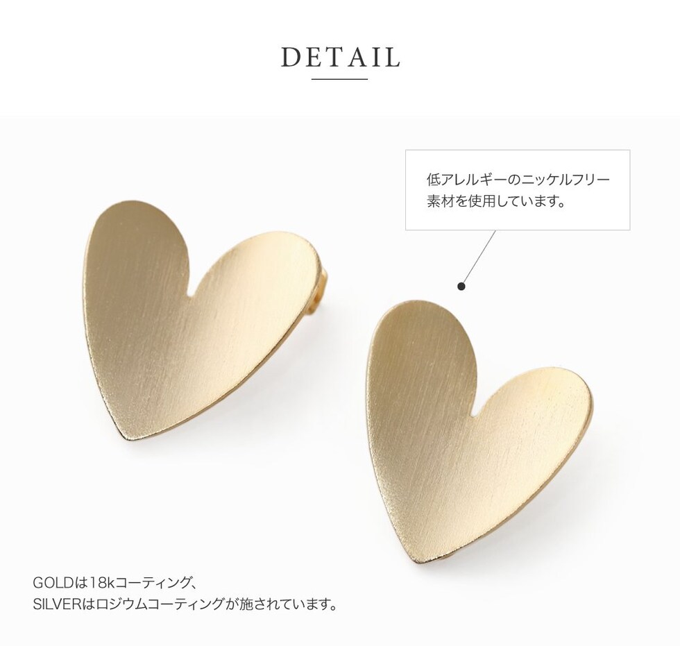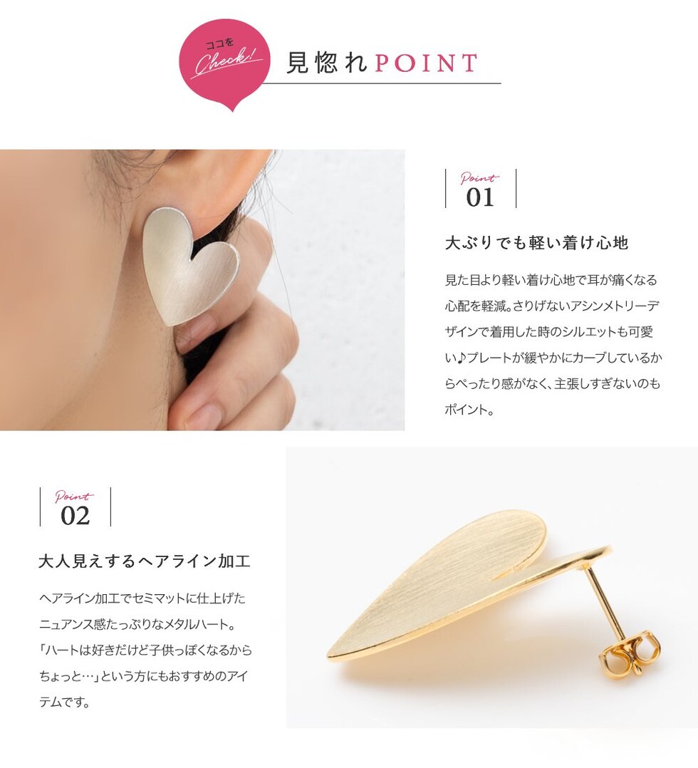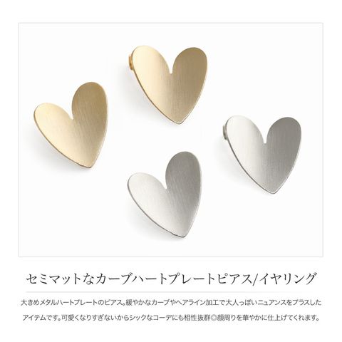 大きめメタルハートプレートのピアス。緩やかなカーブやヘアライン加工で大人っぽいニュアンスをプラスしたアイテムです。可愛くなりすぎないからシックなコーデにも相性抜群◎顔周りを華やかに仕上げてくれます。