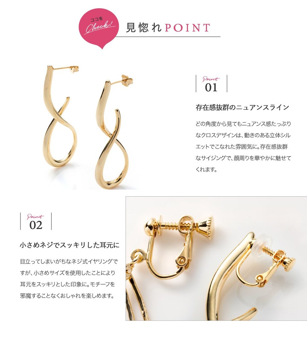 どの角度から見てもニュアンス感たっぷりなクロスデザインは、動きのある立体シルエットでこなれた雰囲気に。存在感抜群なサイジングで、顔周りを華やかに魅せてくれます。