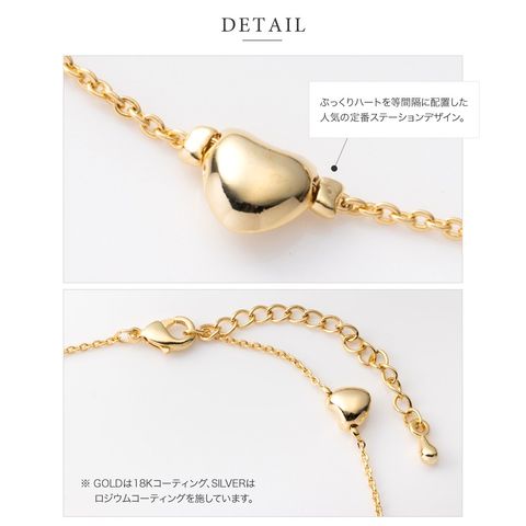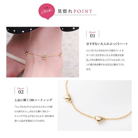 ぷっくりハートを等間隔に配置したステーションアンクレット。どんなアイテムとも合わせやすいから重ね着けにもおすすめ◎これひとつ持ってるとコーデの幅がグッと広がります。
