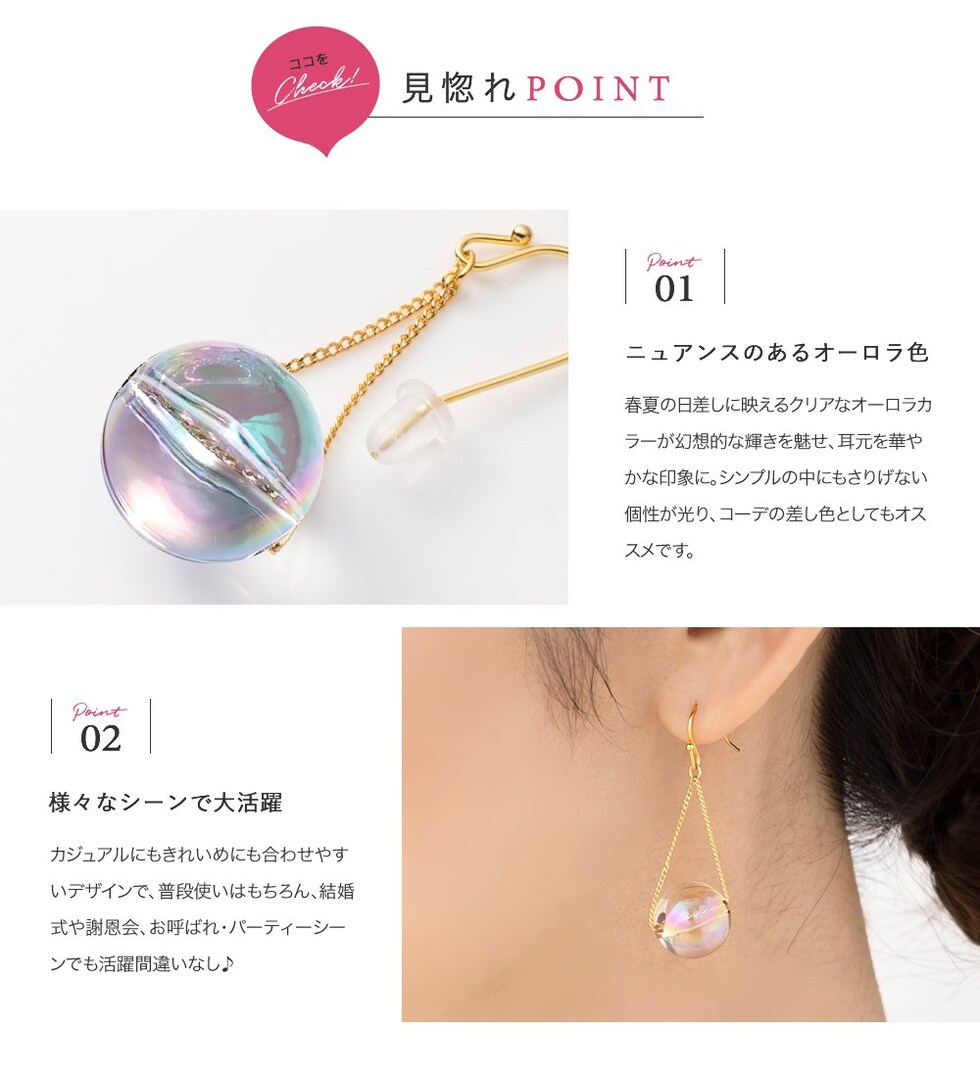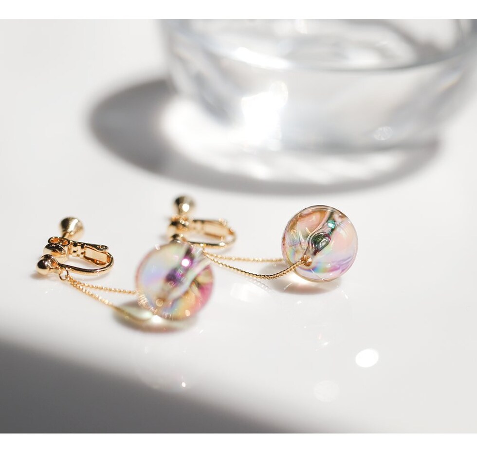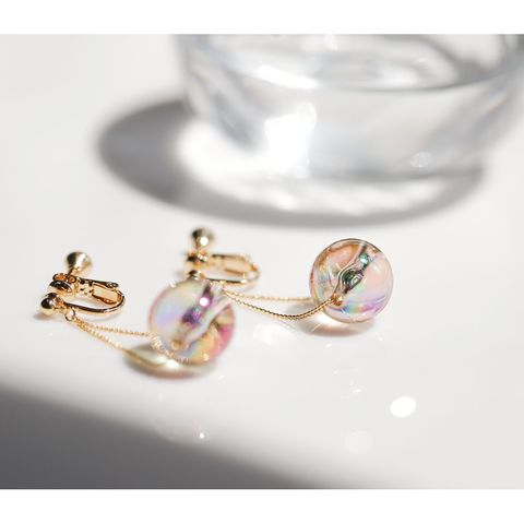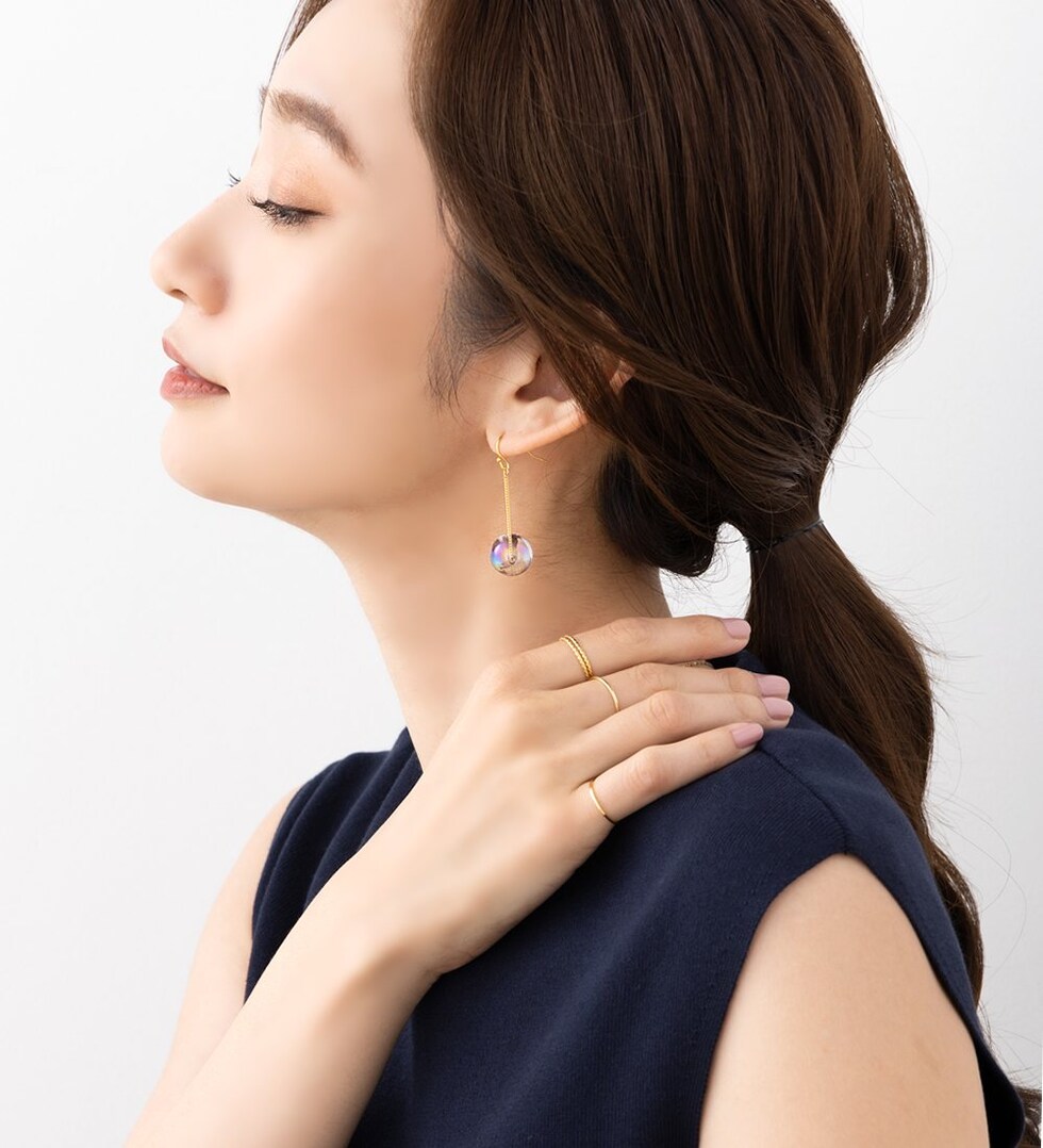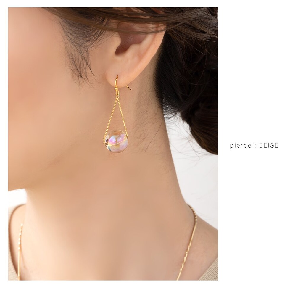春夏の日差しに映えるクリアなオーロラカラーが幻想的な輝きを魅せ、耳元を華やかな印象に。シンプルの中にもさりげない個性が光り、コーデの差し色としてもオススメです。