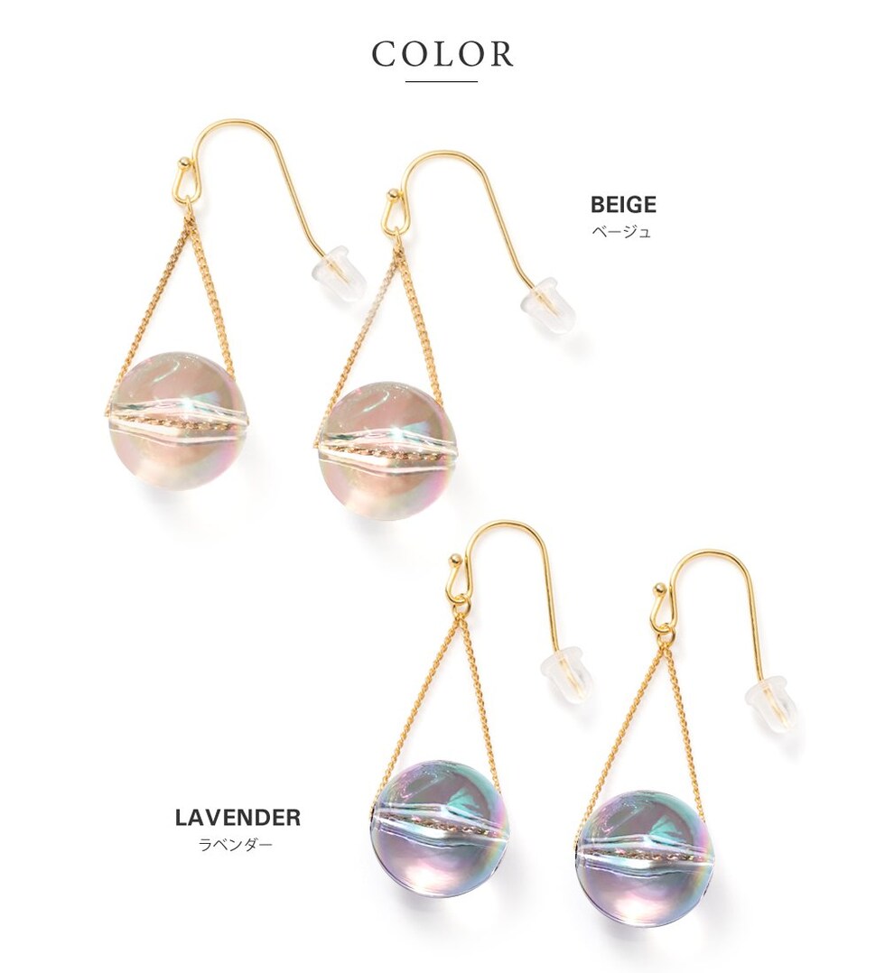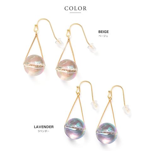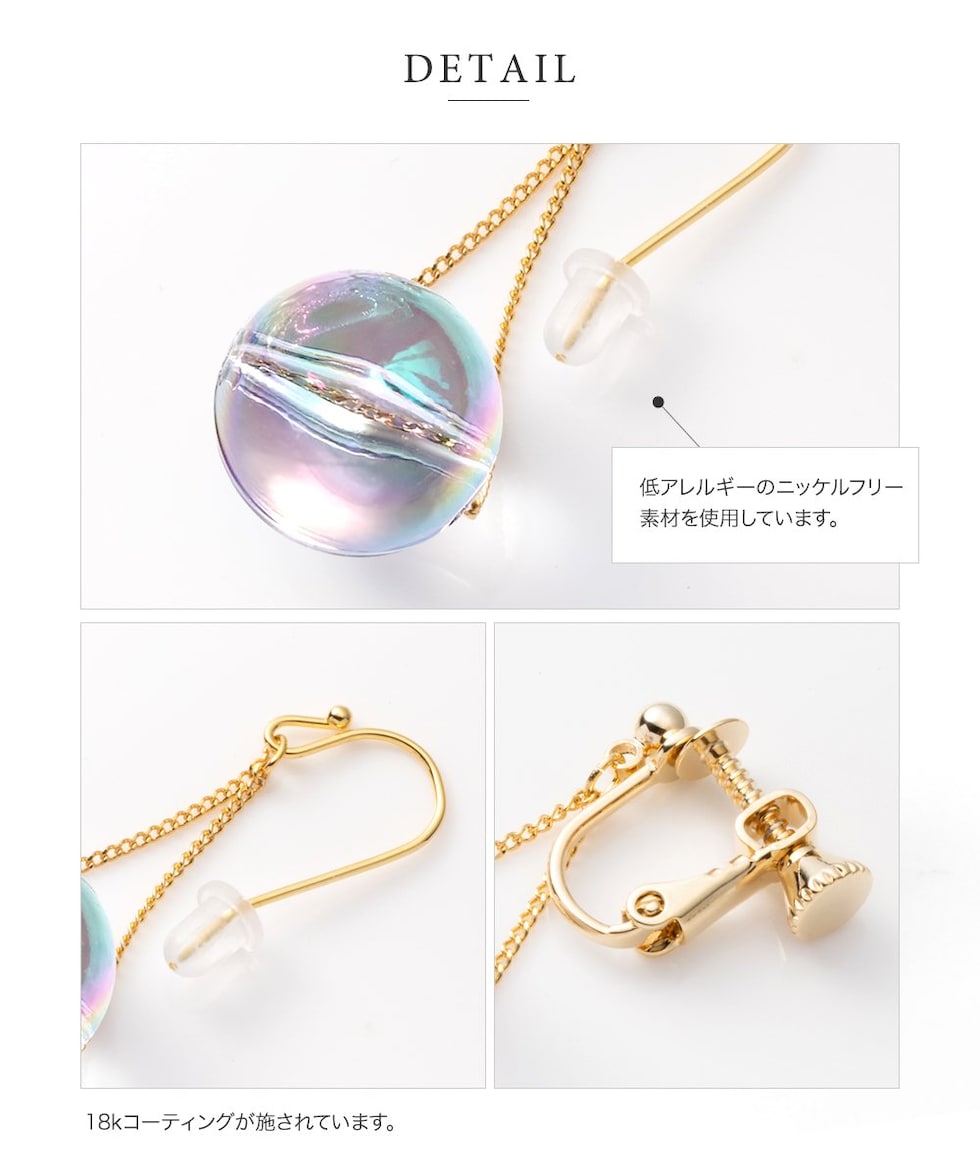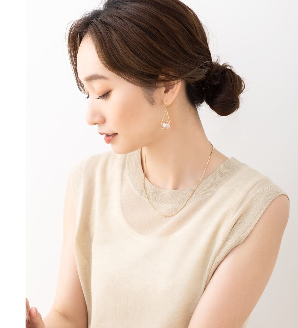 春夏の日差しに映えるクリアなオーロラカラーが幻想的な輝きを魅せ、耳元を華やかな印象に。シンプルの中にもさりげない個性が光り、コーデの差し色としてもオススメです。
