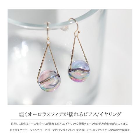 日差しに映えるオーロラボールが揺れるピアス/イヤリング。華奢チェーンとの組み合わせが大人っぽく、目を惹くグラデーションカラーでコーデのワンポイントとして活躍しそう。ニュアンスたっぷりな2色展開♪