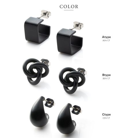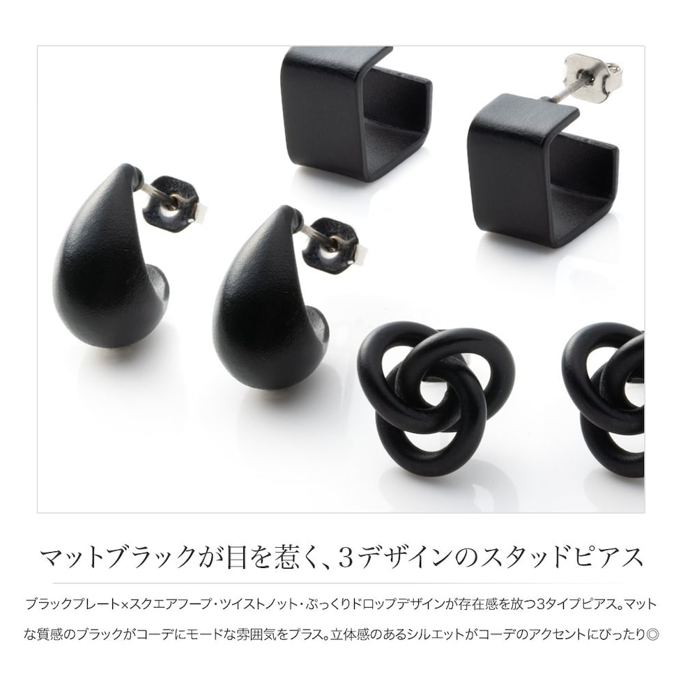 ブラックプレート×スクエアフープ・ツイストノット・ぷっくりドロップデザインが存在感を放つ3タイプピアス。マットな質感のブラックがコーデにモードな雰囲気をプラス。立体感のあるシルエットがコーデのアクセントにぴったり◎