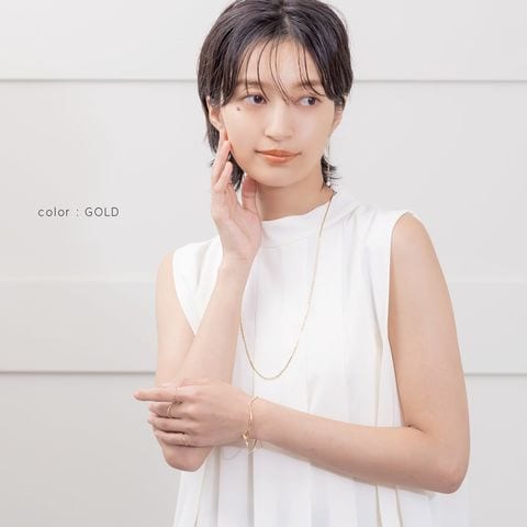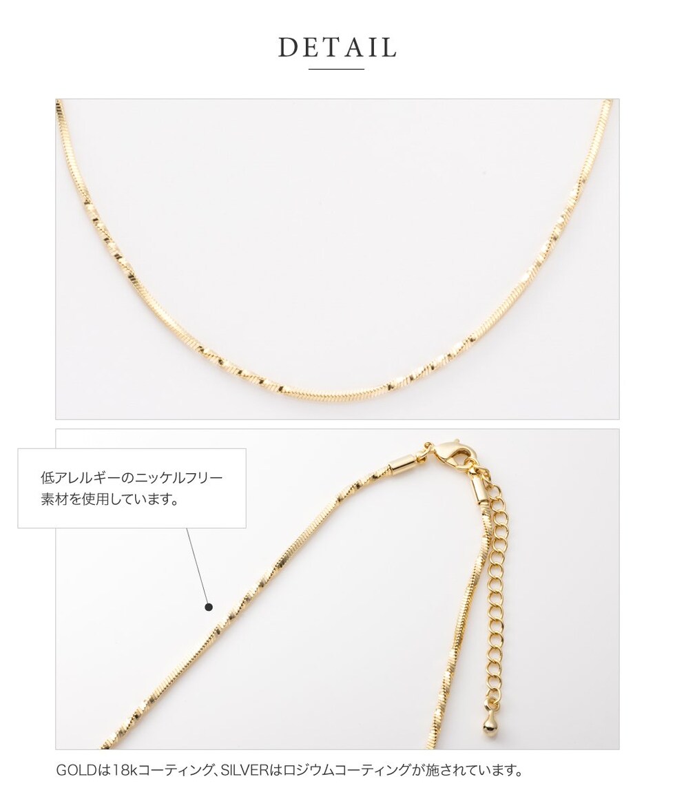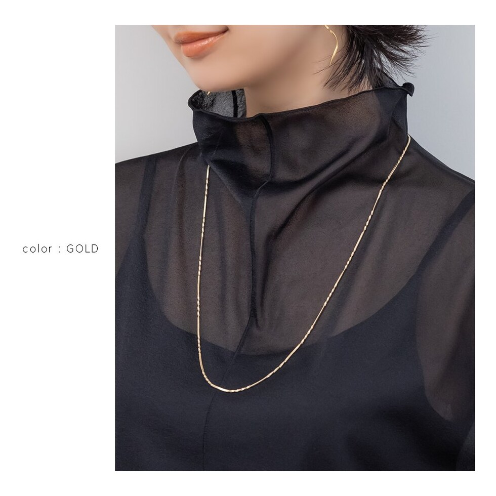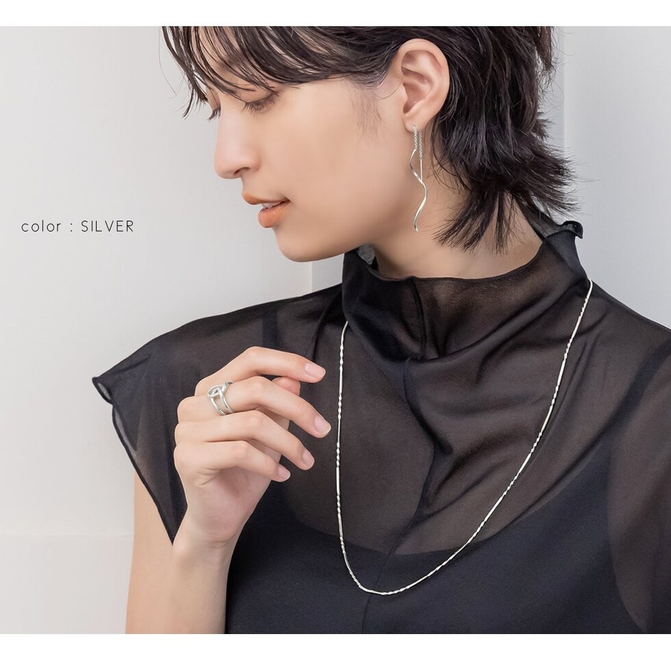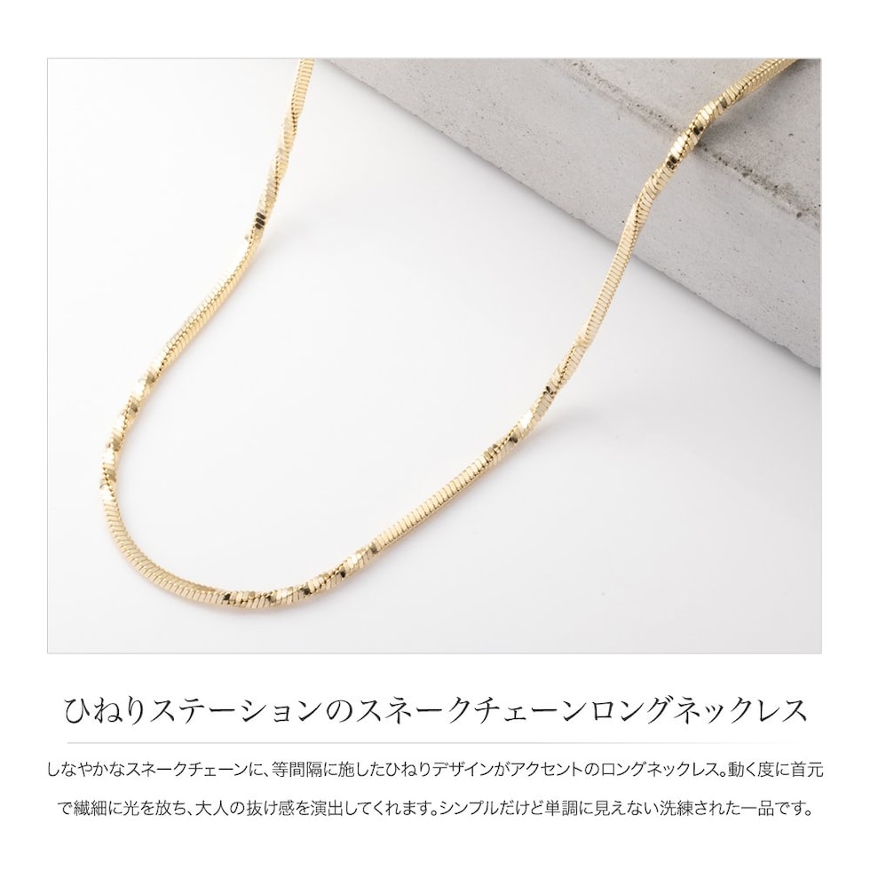 しなやかなスネークチェーンに、等間隔に施したひねりデザインがアクセントのロングネックレス。動く度に首元で繊細に光を放ち、大人の抜け感を演出してくれます。シンプルだけど単調に見えない洗練された一品です。