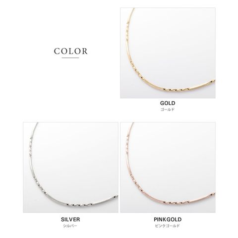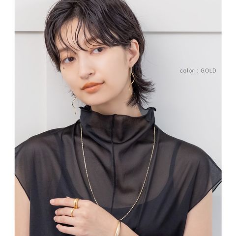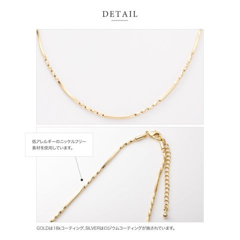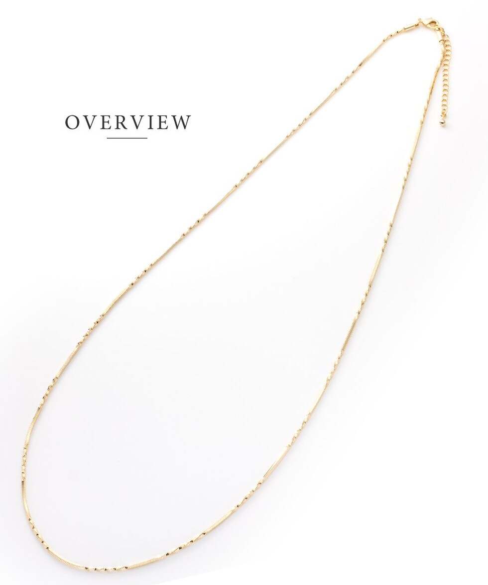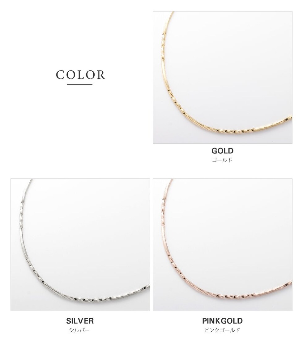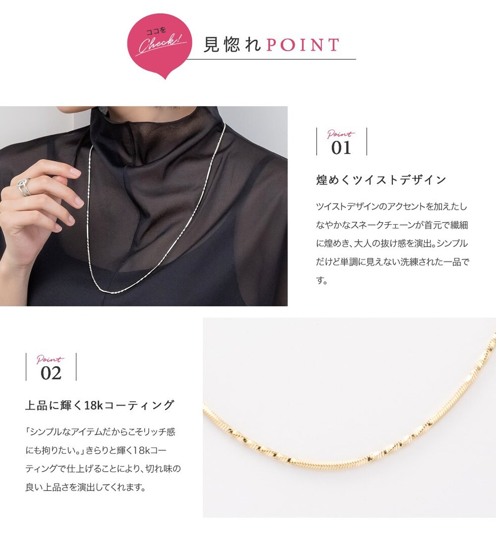 しなやかなスネークチェーンに、等間隔に施したひねりデザインがアクセントのロングネックレス。動く度に首元で繊細に光を放ち、大人の抜け感を演出してくれます。シンプルだけど単調に見えない洗練された一品です。