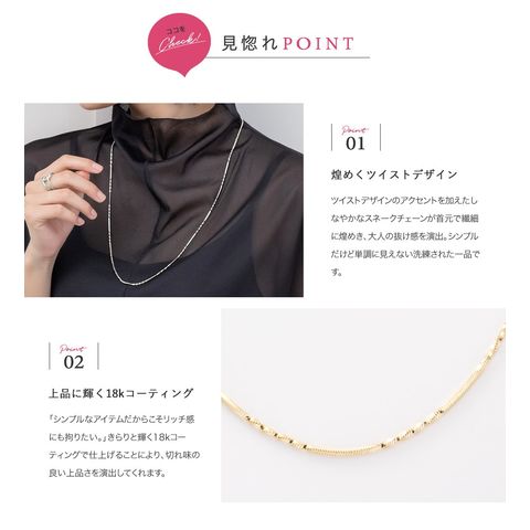 ツイストデザインのアクセントを加えたしなやかなスネークチェーンが首元で繊細に煌めき、大人の抜け感を演出。シンプルだけど単調に見えない洗練された一品です。