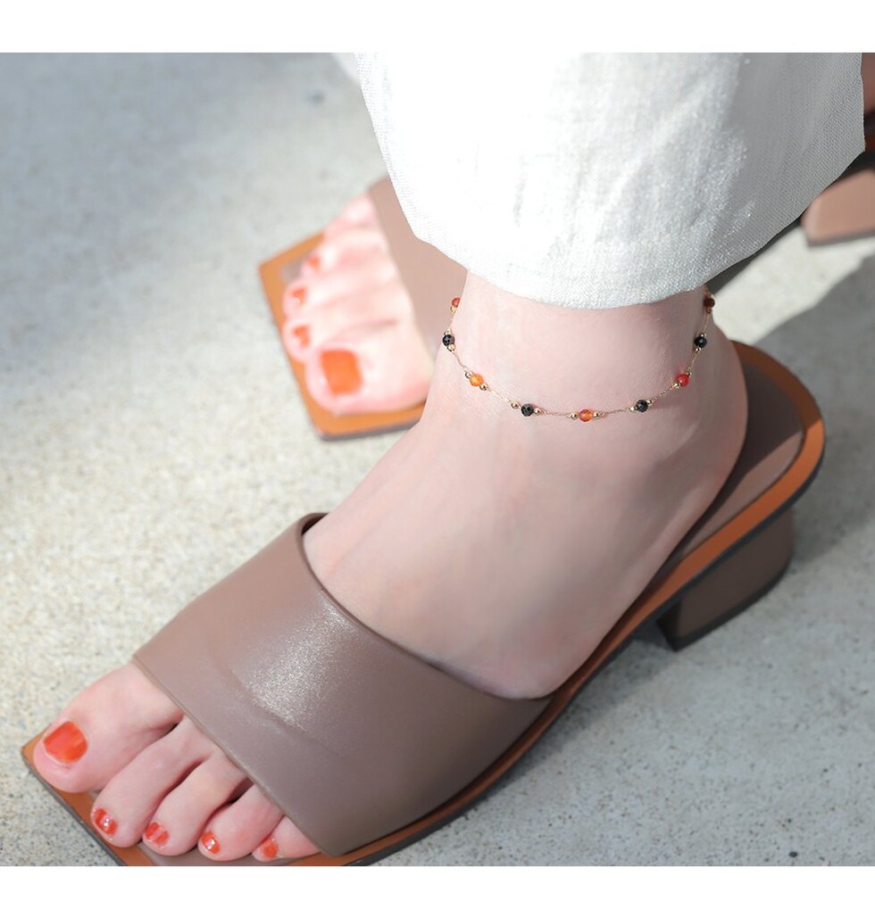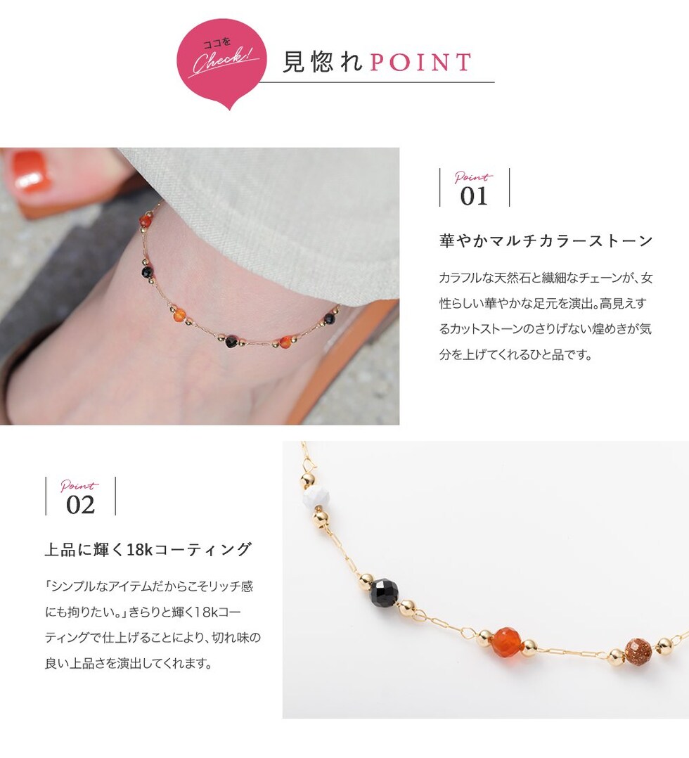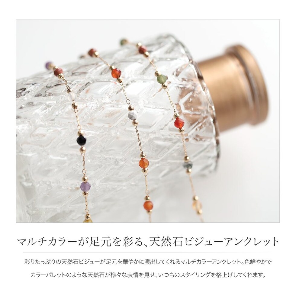カラフルな天然石と繊細なチェーンが、女性らしい華やかな足元を演出。高見えするカットストーンのさりげない煌めきが気分を上げてくれるひと品です。