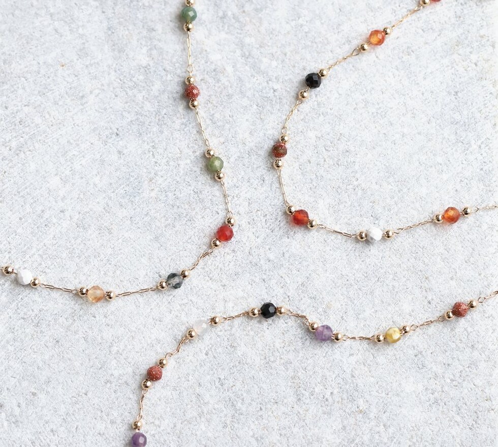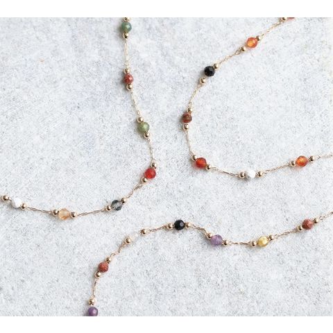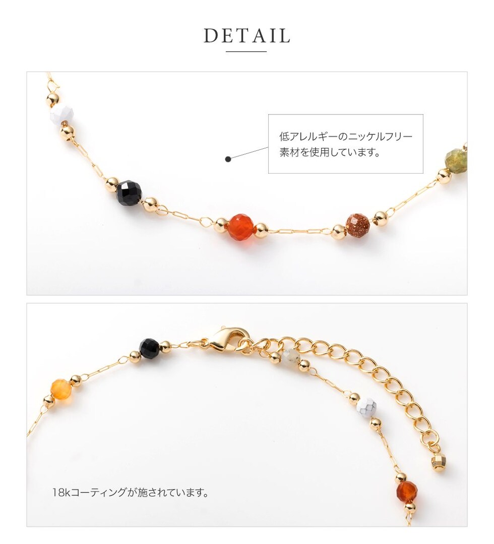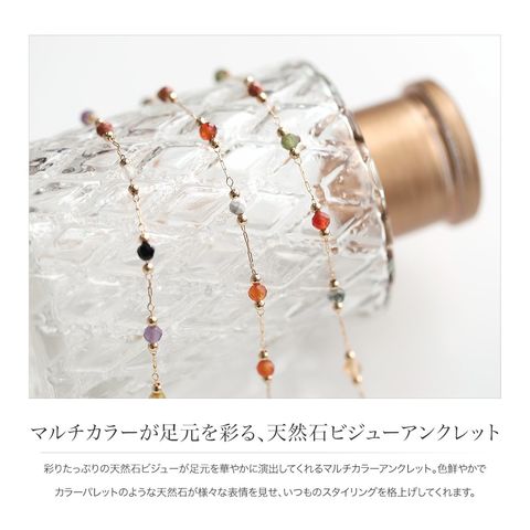彩りたっぷりの天然石ビジューが足元を華やかに演出してくれるマルチカラーアンクレット。色鮮やかでカラーパレットのような天然石が様々な表情を見せ、いつものスタイリングを格上げしてくれます。
