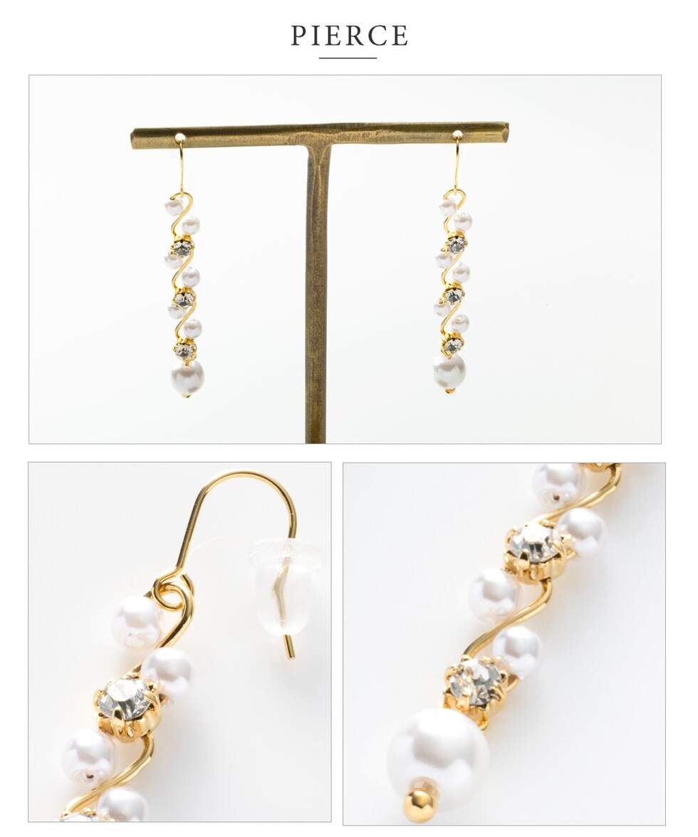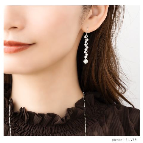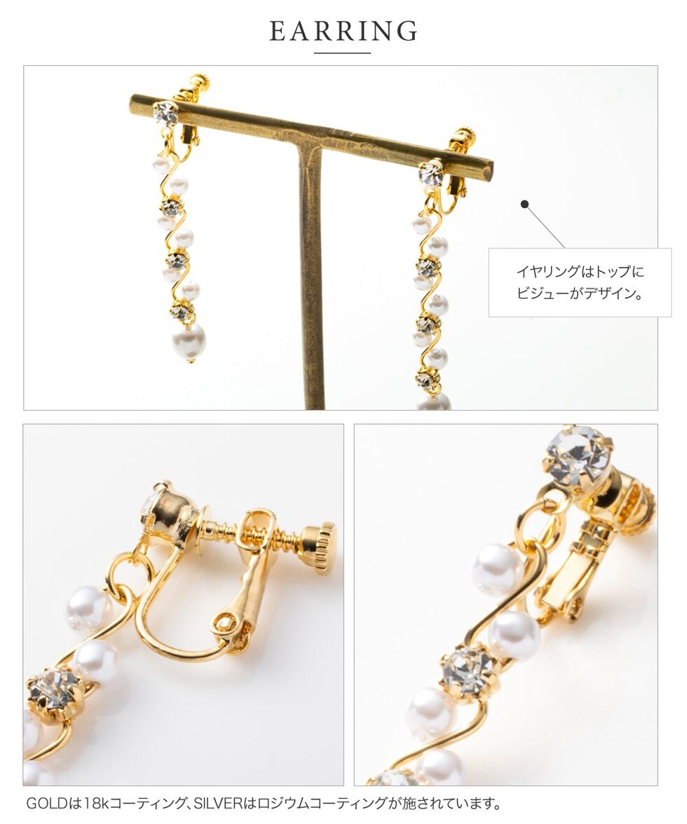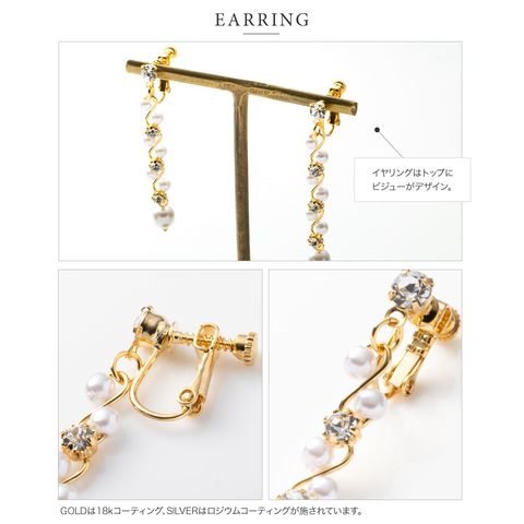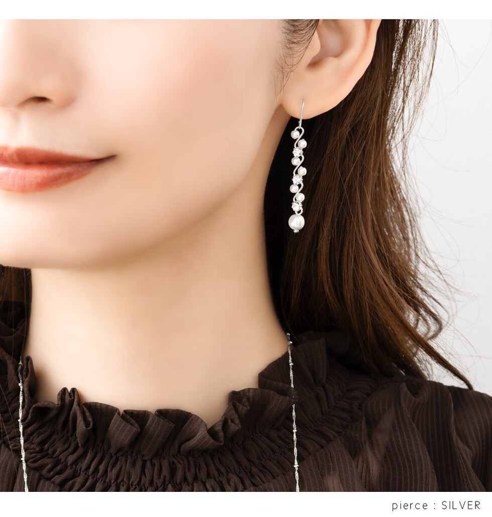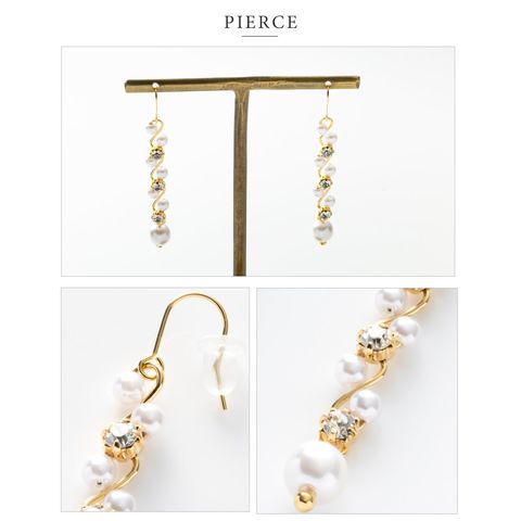華奢ウェーブラインにパール、ビジューをあしらったラインピアス/イヤリング。繊細な煌めきと、揺れるデザインが視線を惹きつけ上品で華やかな印象に。デイリーから、華やかな場まで幅広く活躍してくれるアイテムです。