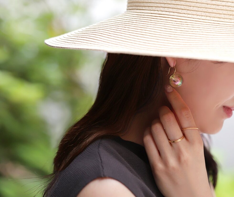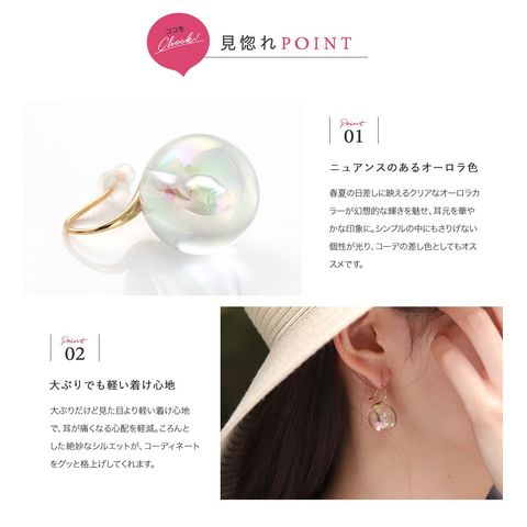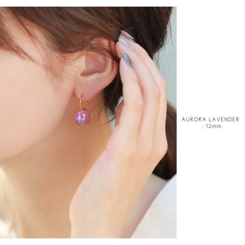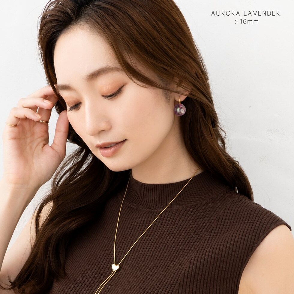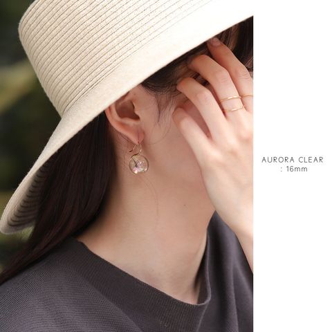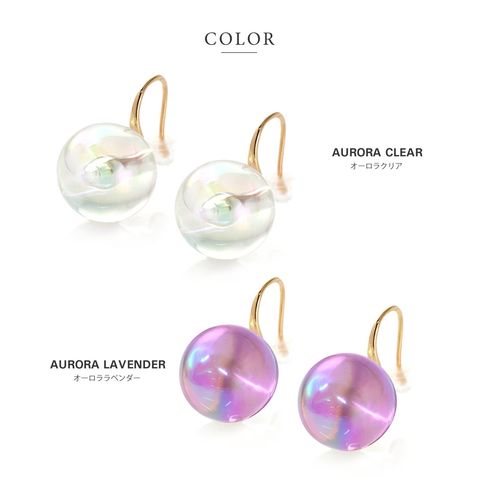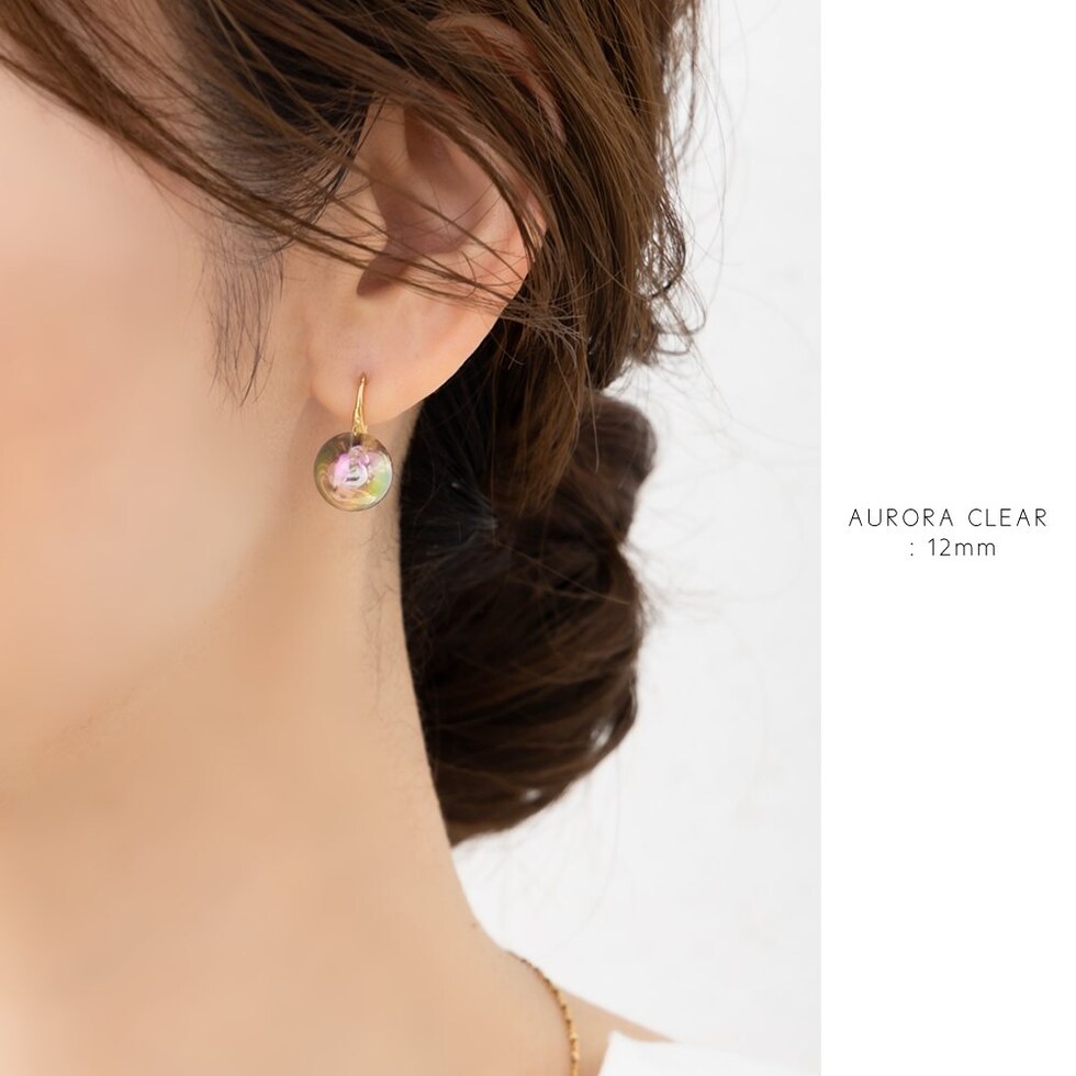 春夏の日差しに映えるクリアなオーロラカラーが幻想的な輝きを魅せ、耳元を華やかな印象に。シンプルの中にもさりげない個性が光り、コーデの差し色としてもオススメです。
