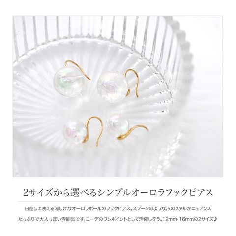 日差しに映える涼しげなオーロラボールのフックピアス。スプーンのような形のメタルがニュアンスたっぷりで大人っぽい雰囲気です。コーデのワンポイントとして活躍しそう。12mm・16mmの2サイズ♪