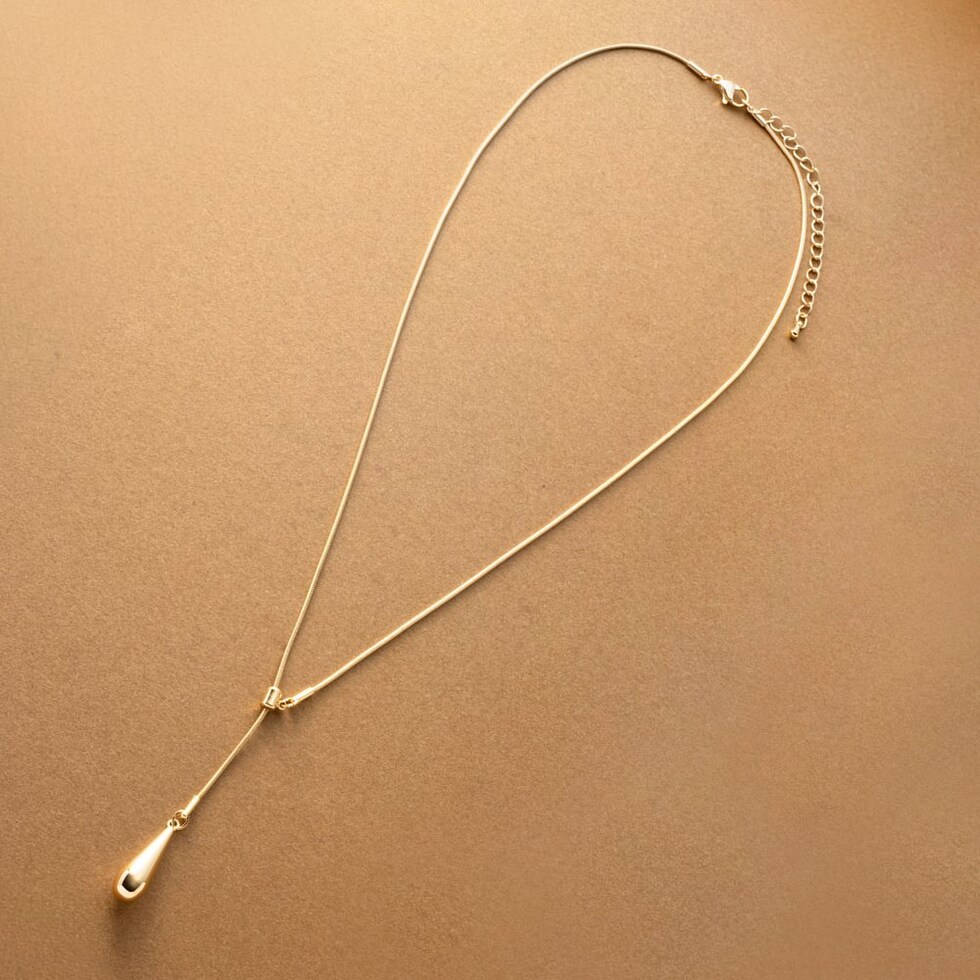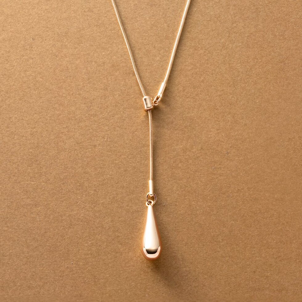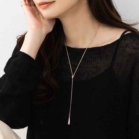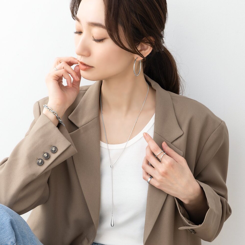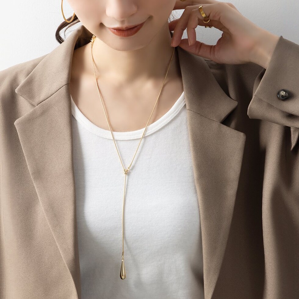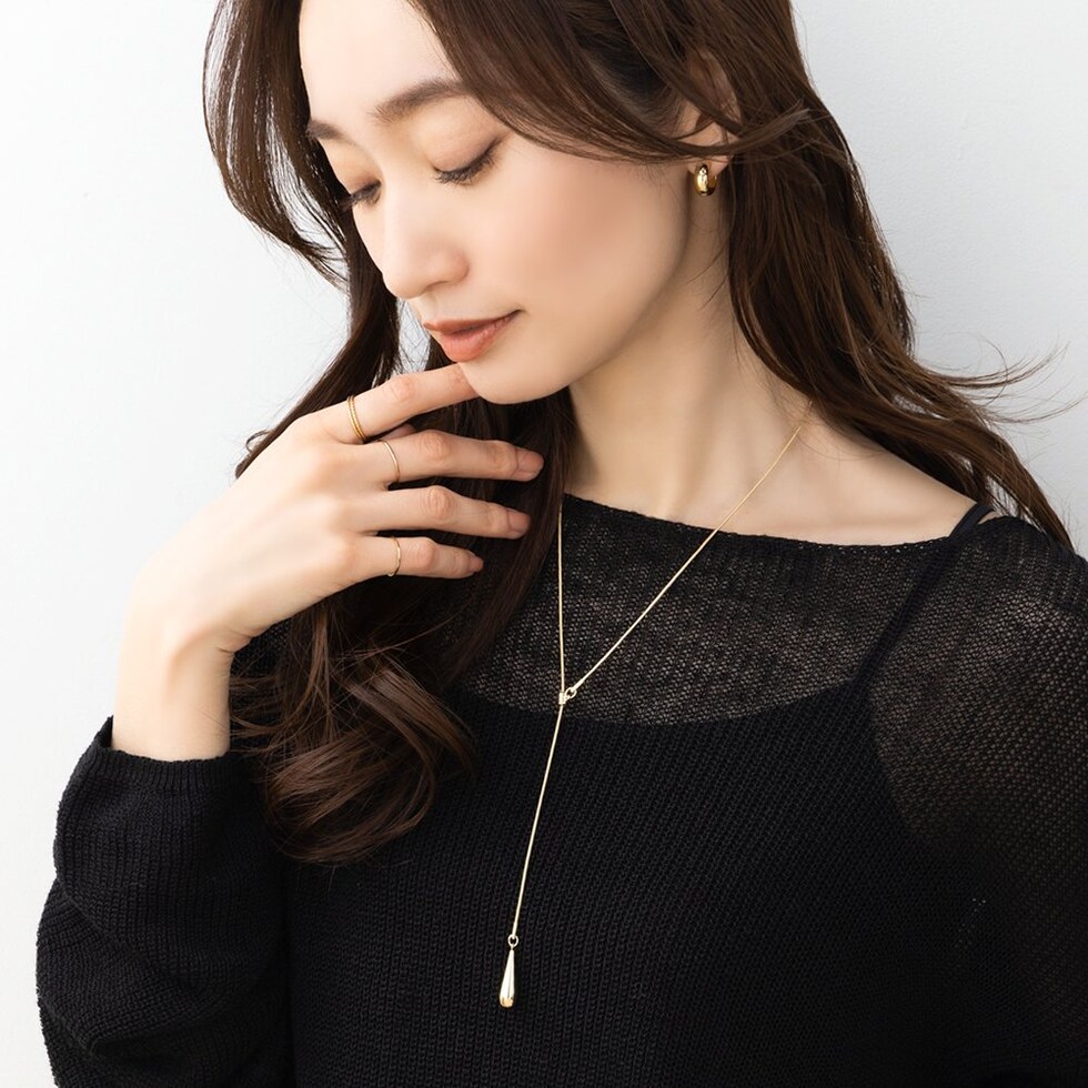 艶感メタルドロップモチーフのY字ネックレス。Y字の部分はフリーアジャスターでお好みのバランスに調節可能◎程よいボリューム感とシンプルながらも洗練されたデザインで、いつものコーデにリッチ感をプラスしてくれます。錆びにくく傷に強いステンレス製で毎日のスタイリングのアクセントに活躍間違いナシ。