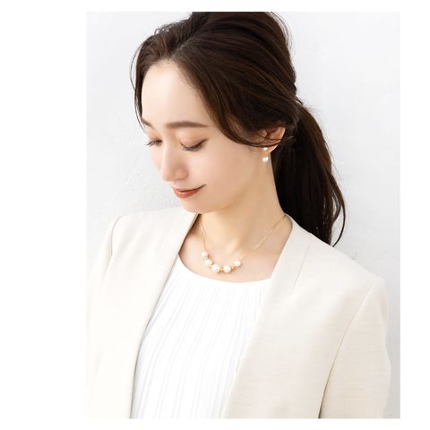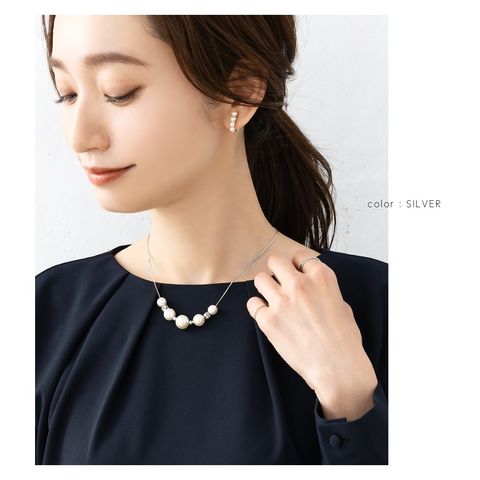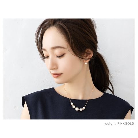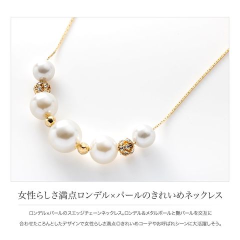 パールとロンデルにメタルボールのアクセントが、視線を引き付けるデザイン。さりげなくも上品に艶めくスエッジチェーンがノーブルで華やかな胸元を演出してくれます。
