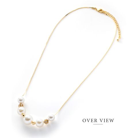 ロンデル×パールのスエッジチェーンネックレス。ロンデル&メタルボールと艶パールを交互に合わせたころんとしたデザインで女性らしさ満点◎きれいめコーデやお呼ばれシーンに大活躍しそう。