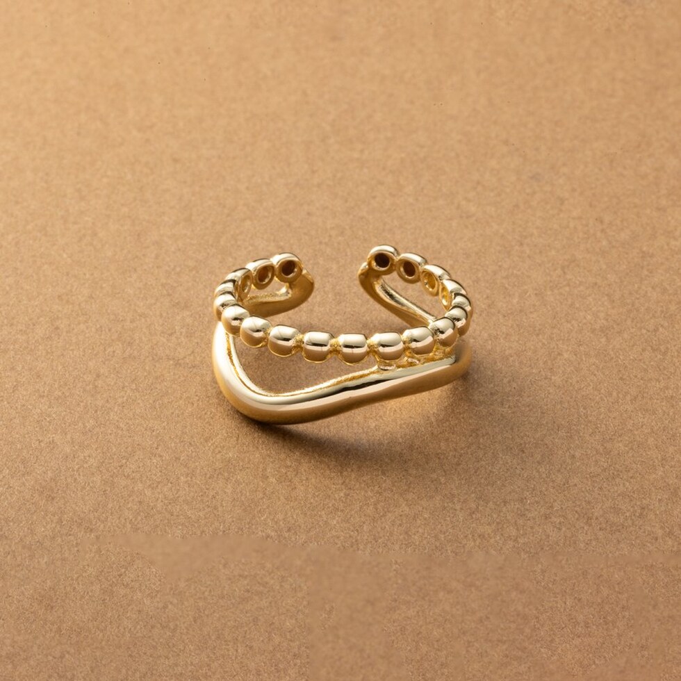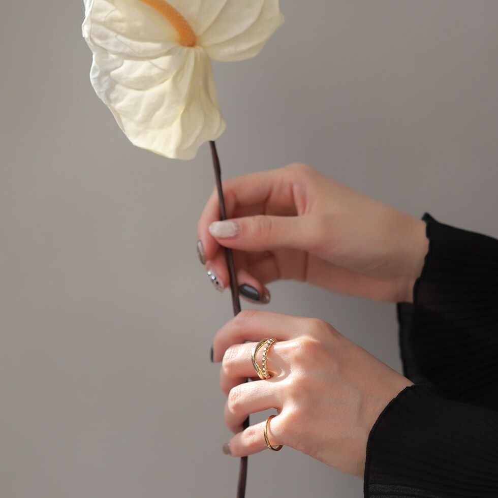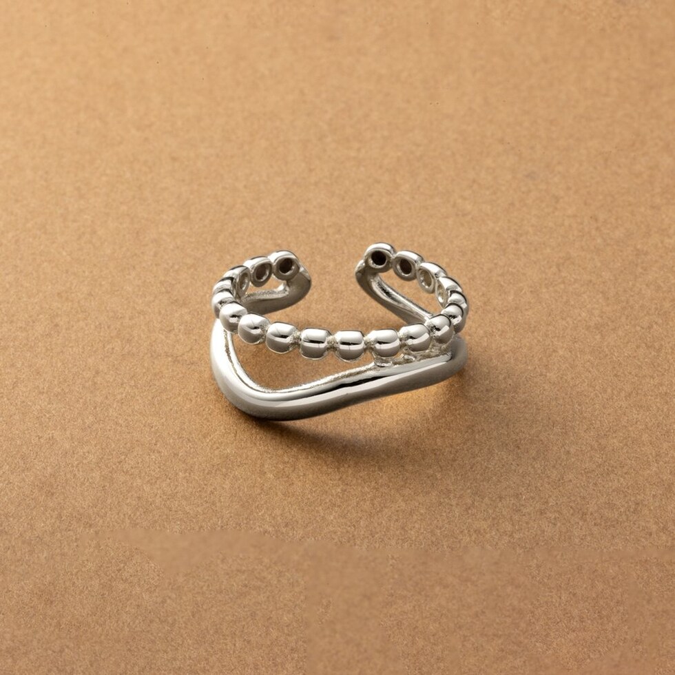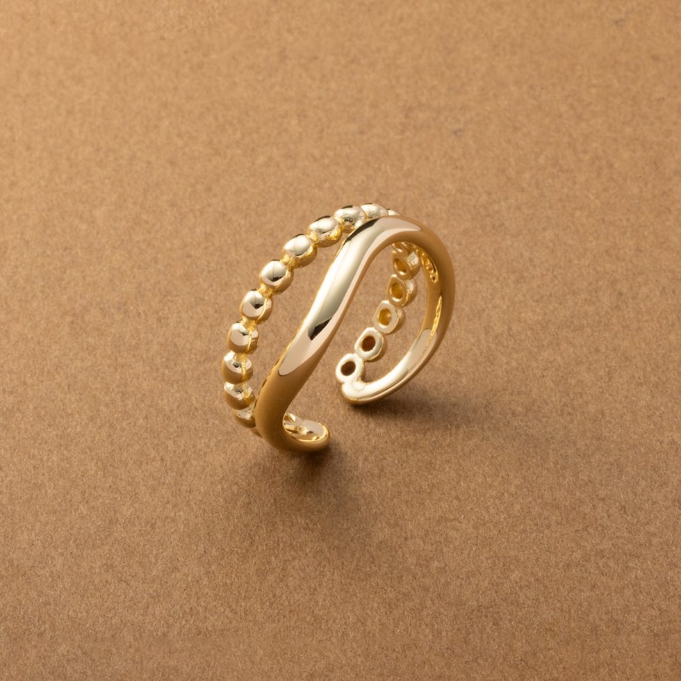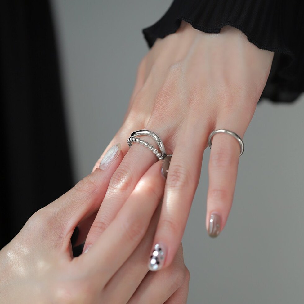 つぶつぶとした連なりボールとウェーブメタルラインのレイヤード風2連リング。ありそうでないデザインがニュアンスたっぷりな印象で、手元を華やかに魅せてくれます。フリーサイズのオープンリングだから、どの指にも幅広く使えそう◎錆びにくく傷に強いステンレス製で、デイリーに活躍してくれます。長時間の着用も安心の低アレルギー素材です。