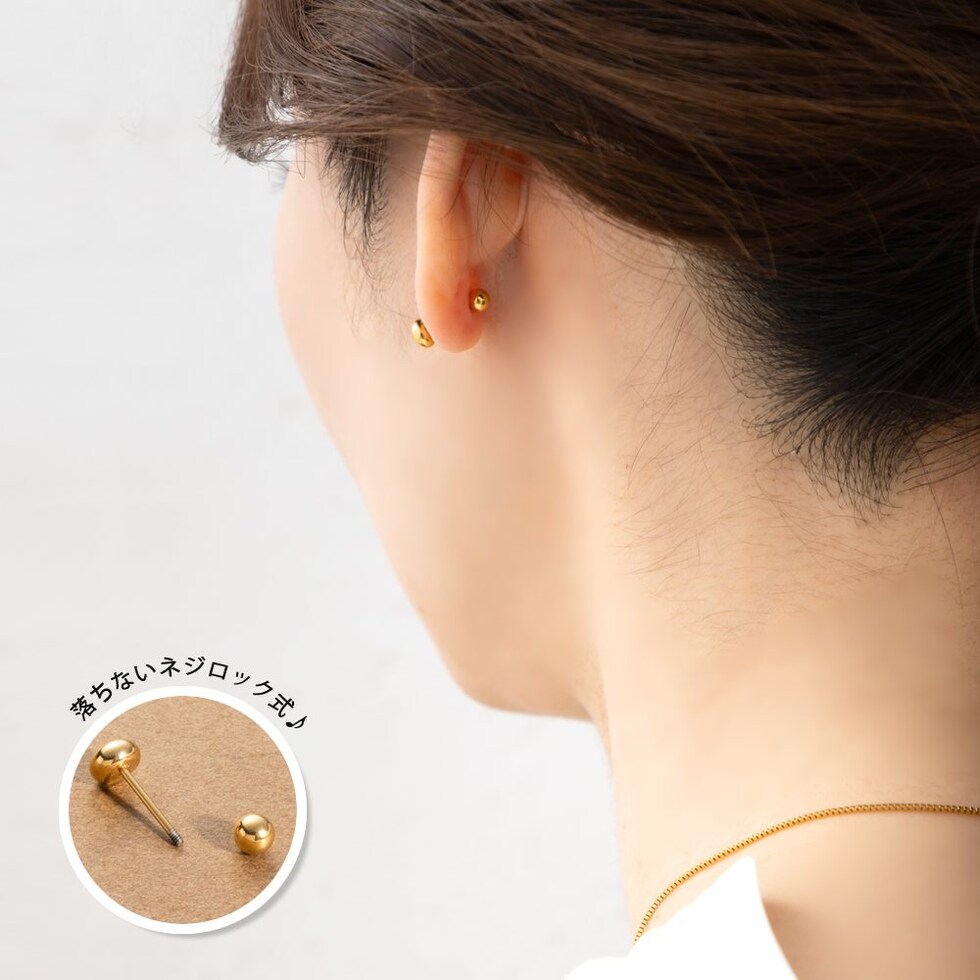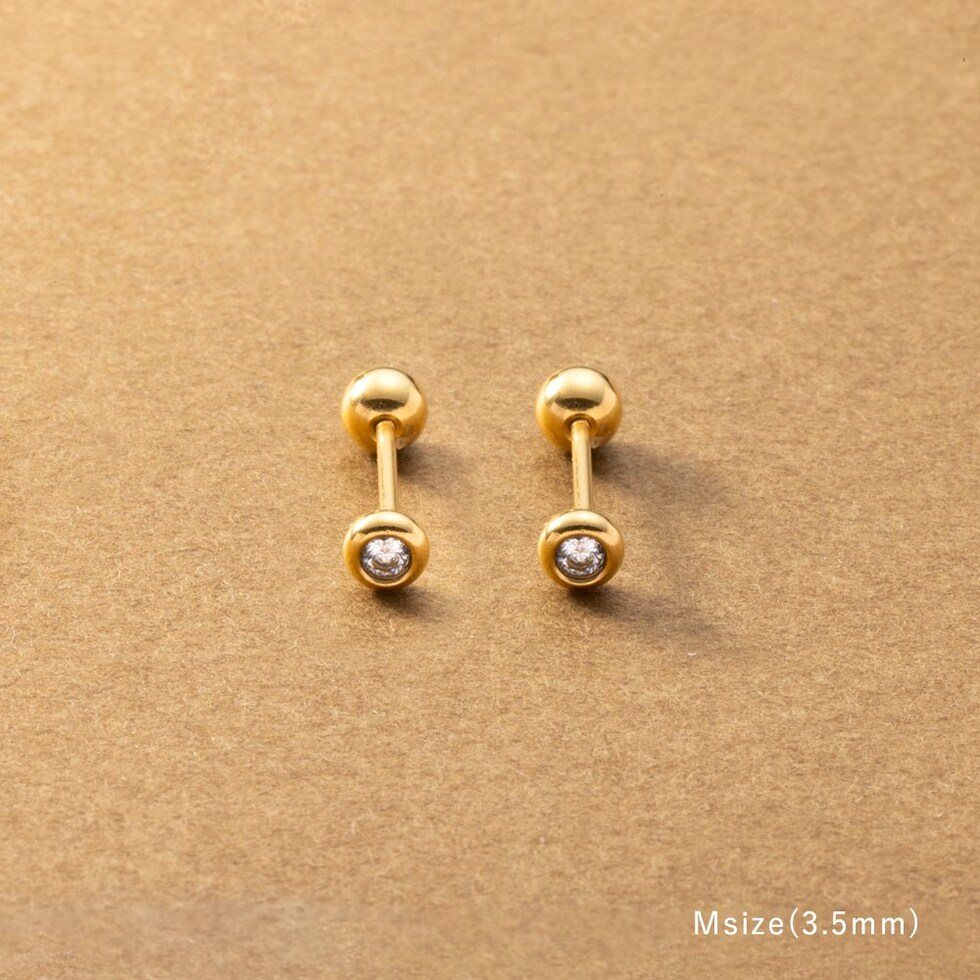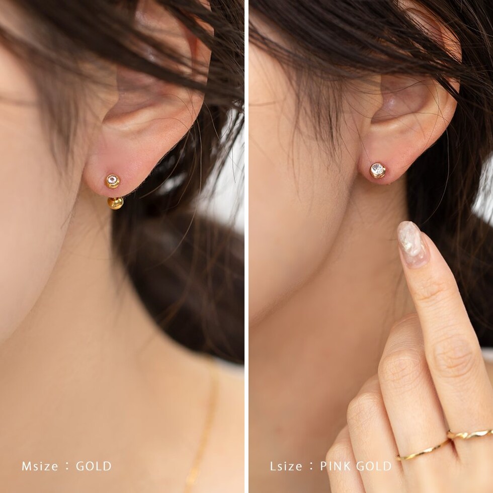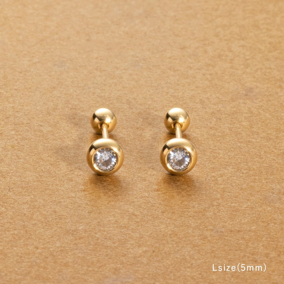 ぷっくりとしたメタルフレームでビジューを包んだネジロック式ピアス。MとLの2サイズをご用意しました。キャッチは後ろから見ても可愛いスフィアモチーフで、ネジのようにしっかりと留められるから落ちる心配もないのが◎錆びにくく傷に強いステンレス製で、長時間の着用も安心の低アレルギー素材です。
