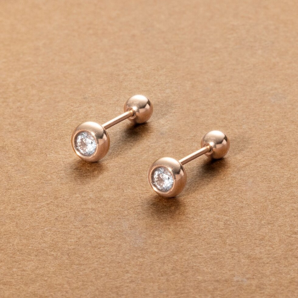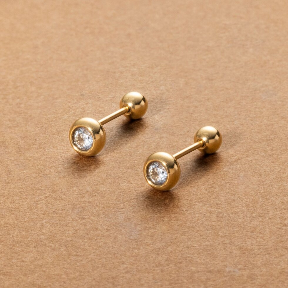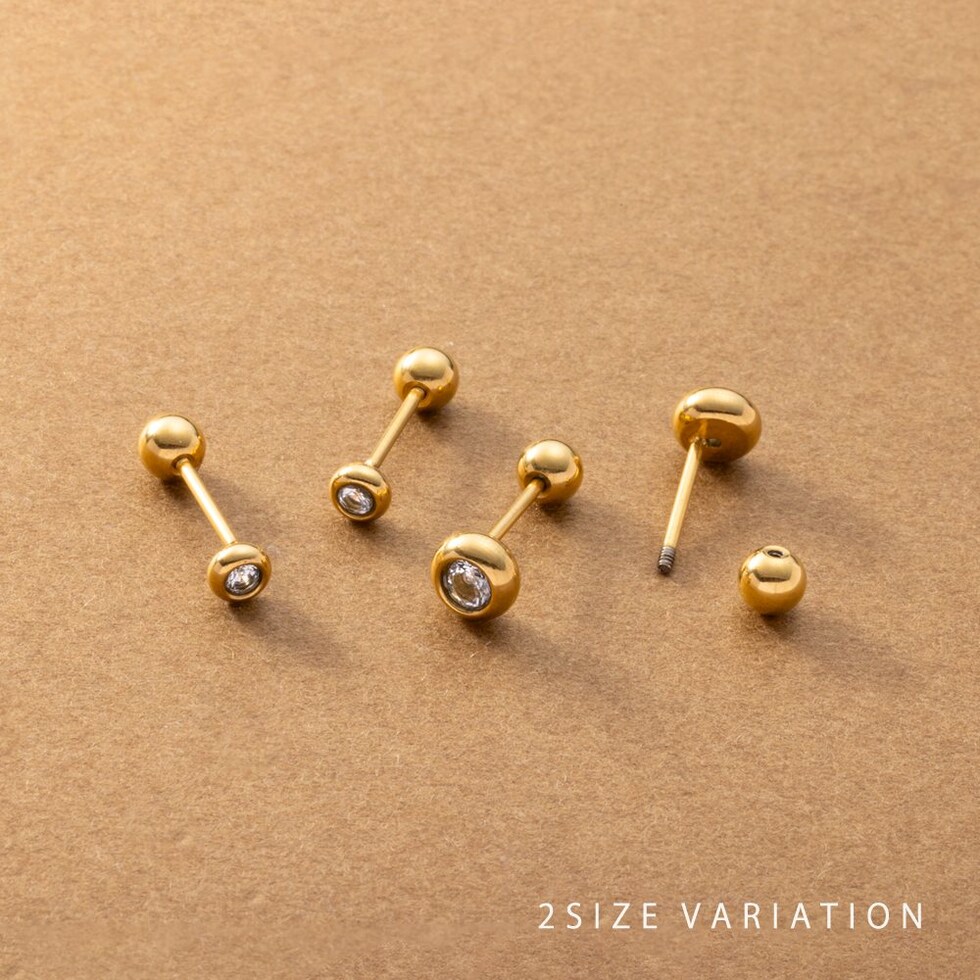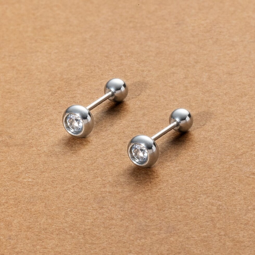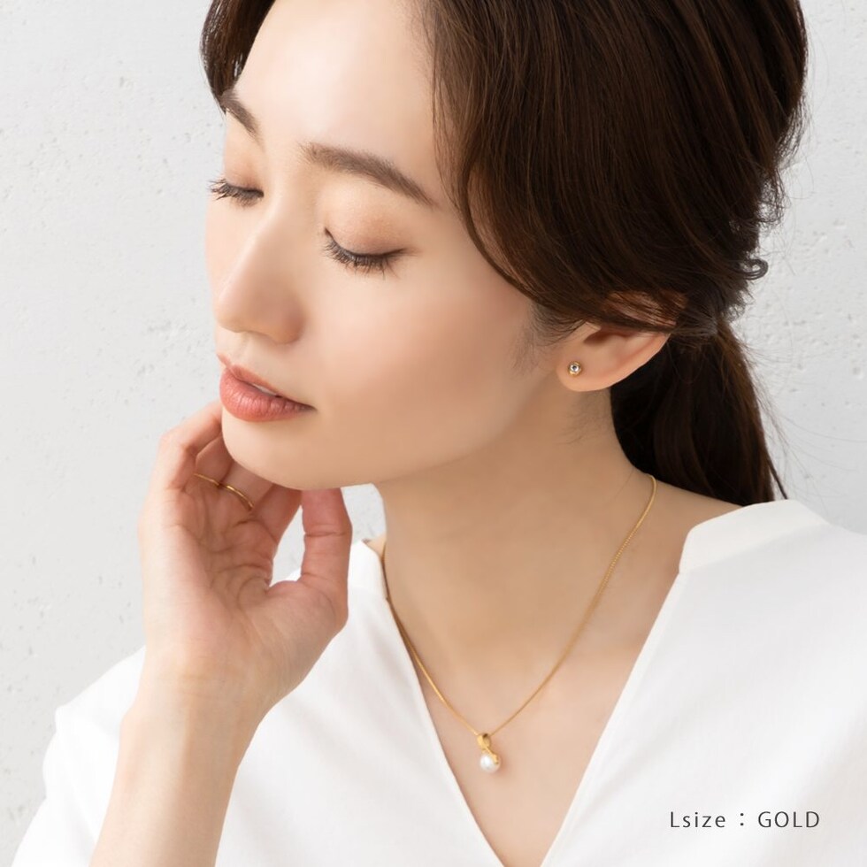 ぷっくりとしたメタルフレームでビジューを包んだネジロック式ピアス。MとLの2サイズをご用意しました。キャッチは後ろから見ても可愛いスフィアモチーフで、ネジのようにしっかりと留められるから落ちる心配もないのが◎錆びにくく傷に強いステンレス製で、長時間の着用も安心の低アレルギー素材です。