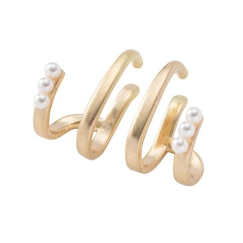 3粒パールとカーブラインメタルのレイヤードデザインがお洒落な両耳用イヤーカフ。艶ありとヴィンテージの2タイプをご用意しました。品良く見える洗練されたデザインで、デイリーからオフィスまで幅広く活躍しそう◎