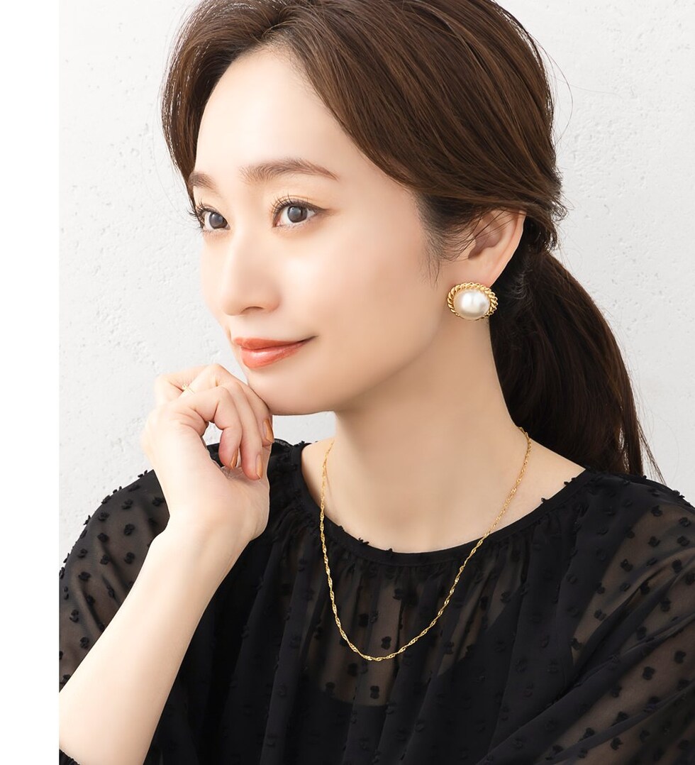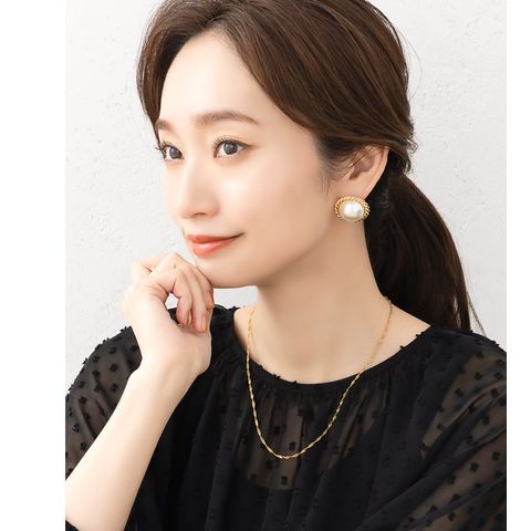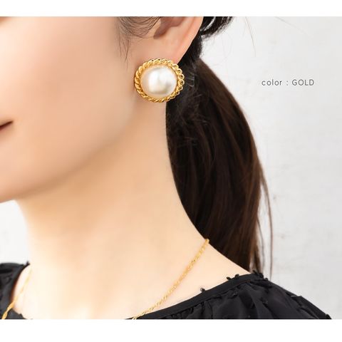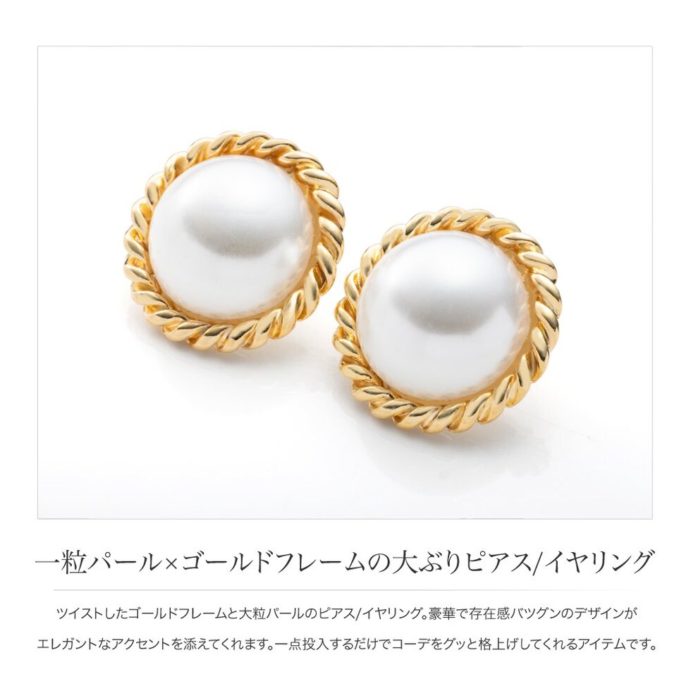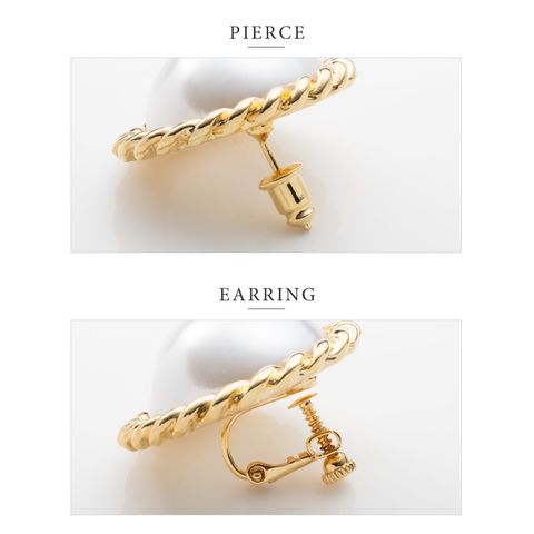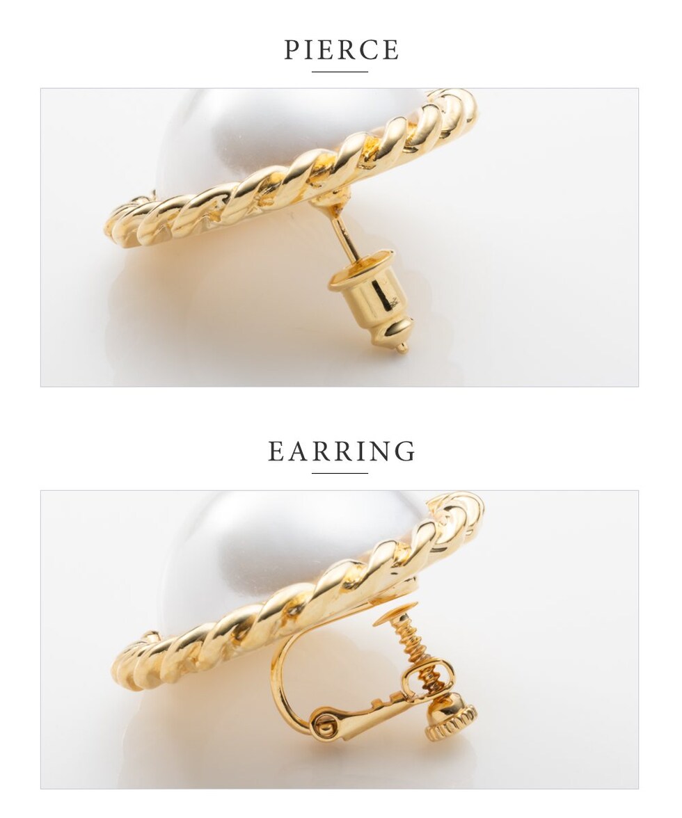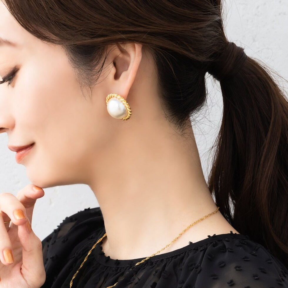 ツイストしたゴールドフレームと大粒パールのピアス/イヤリング。豪華で存在感バツグンのデザインがエレガントなアクセントを添えてくれます。一点投入するだけでコーデをグッと格上げしてくれるアイテムです。