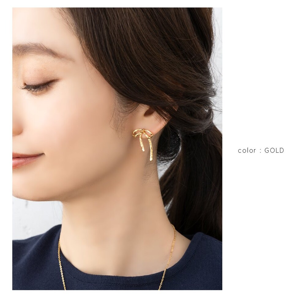 ピアス イヤリング 金属アレルギー ニッケルフリー レディース リボン アシンメトリー 凹凸 メタル ネジ式 cream dot ゆうパケット [ゴールド_イヤリング]