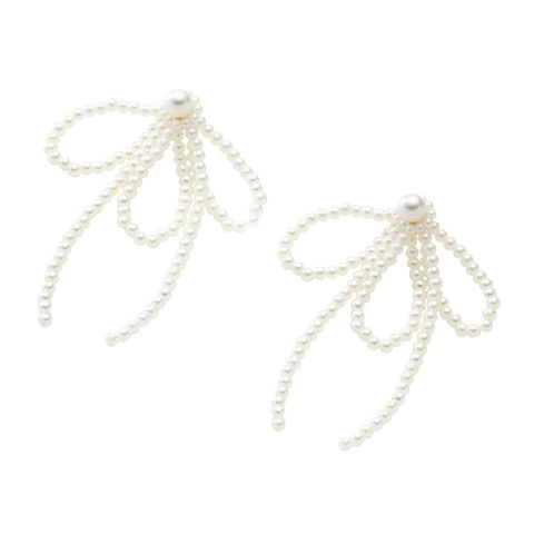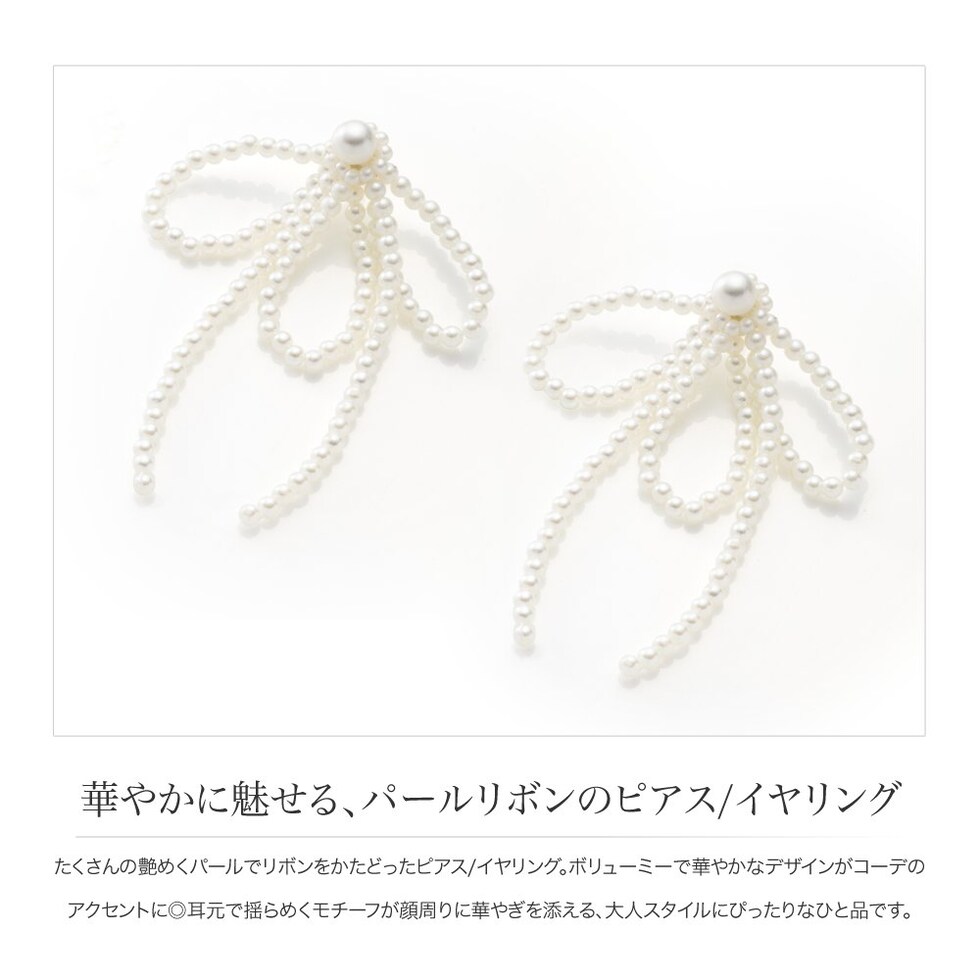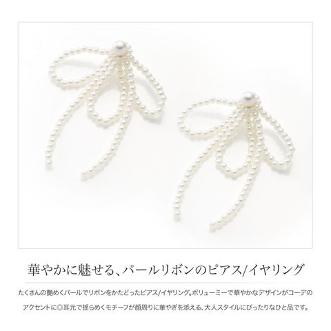 たくさんの艶めくパールでリボンをかたどったピアス/イヤリング。ボリューミーで華やかなデザインがコーデのアクセントに◎耳元で揺らめくモチーフが顔周りに華やぎを添える、大人スタイルにぴったりなひと品です。