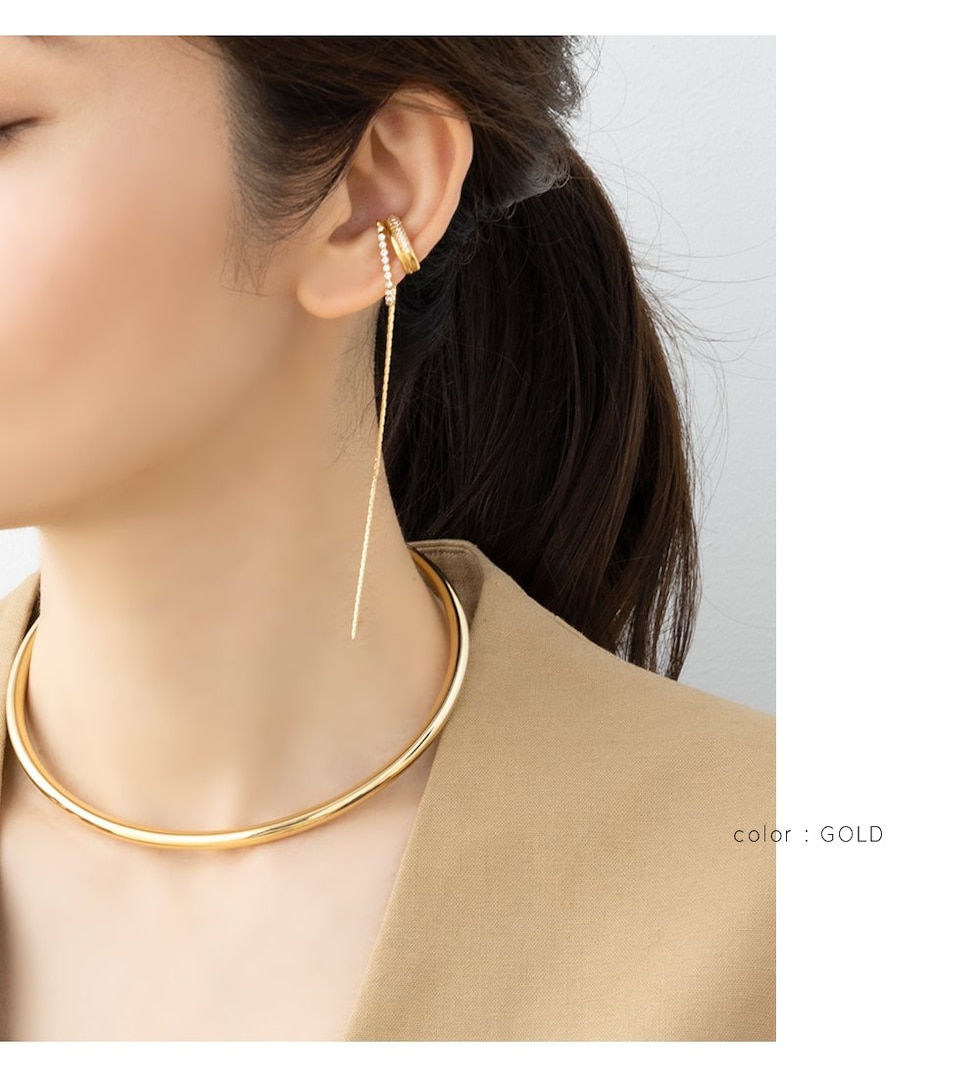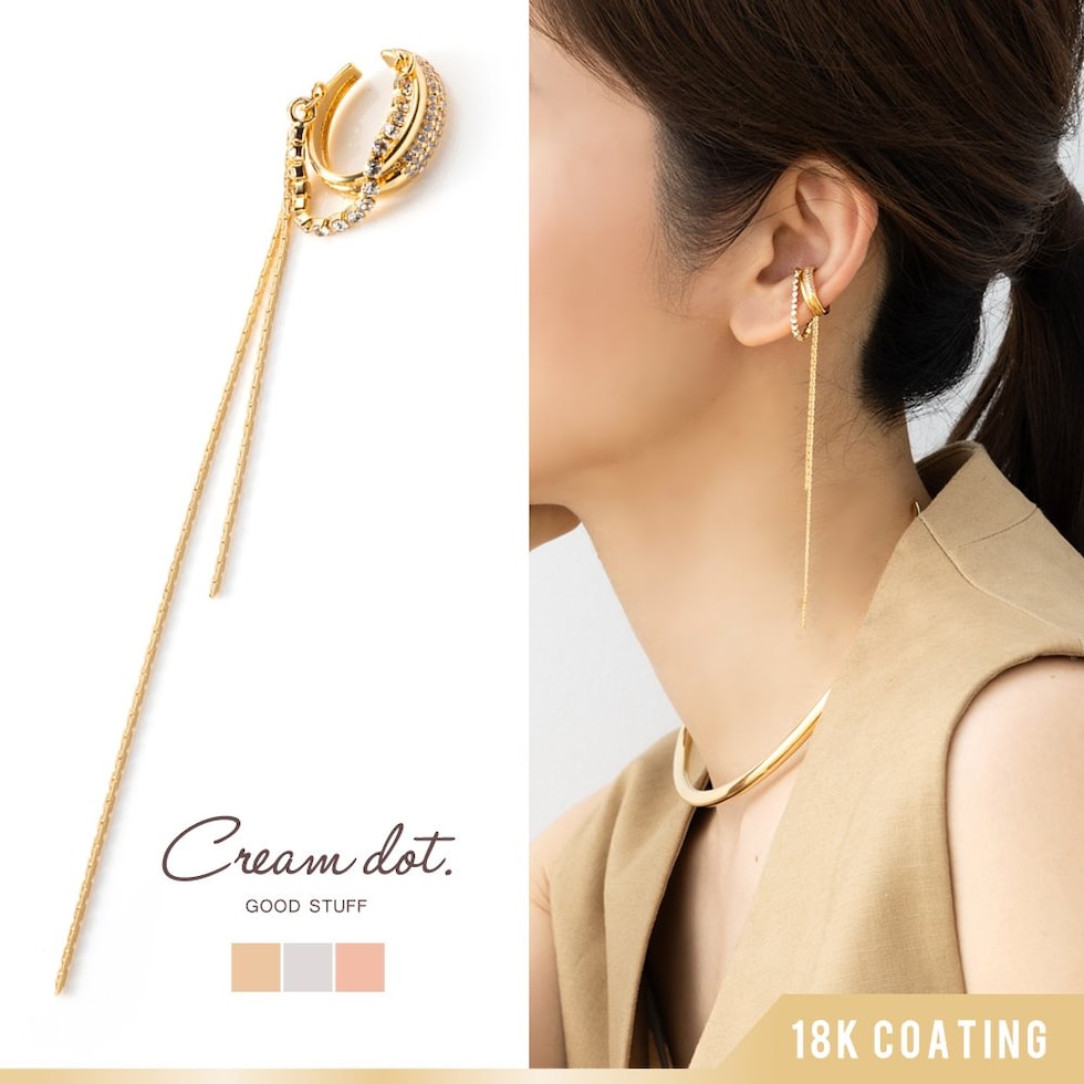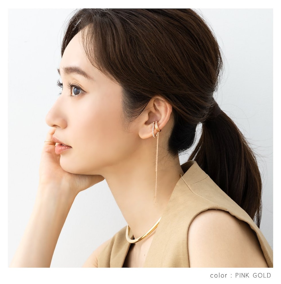 ロングスエッジチェーンが軽やかに揺れる片耳用イヤーカフ。煌く小粒ビジューを飾ったモチーフで品よく身につけられます。レイヤードしているように見える技ありデザインで周りと差のつくアイテム◎