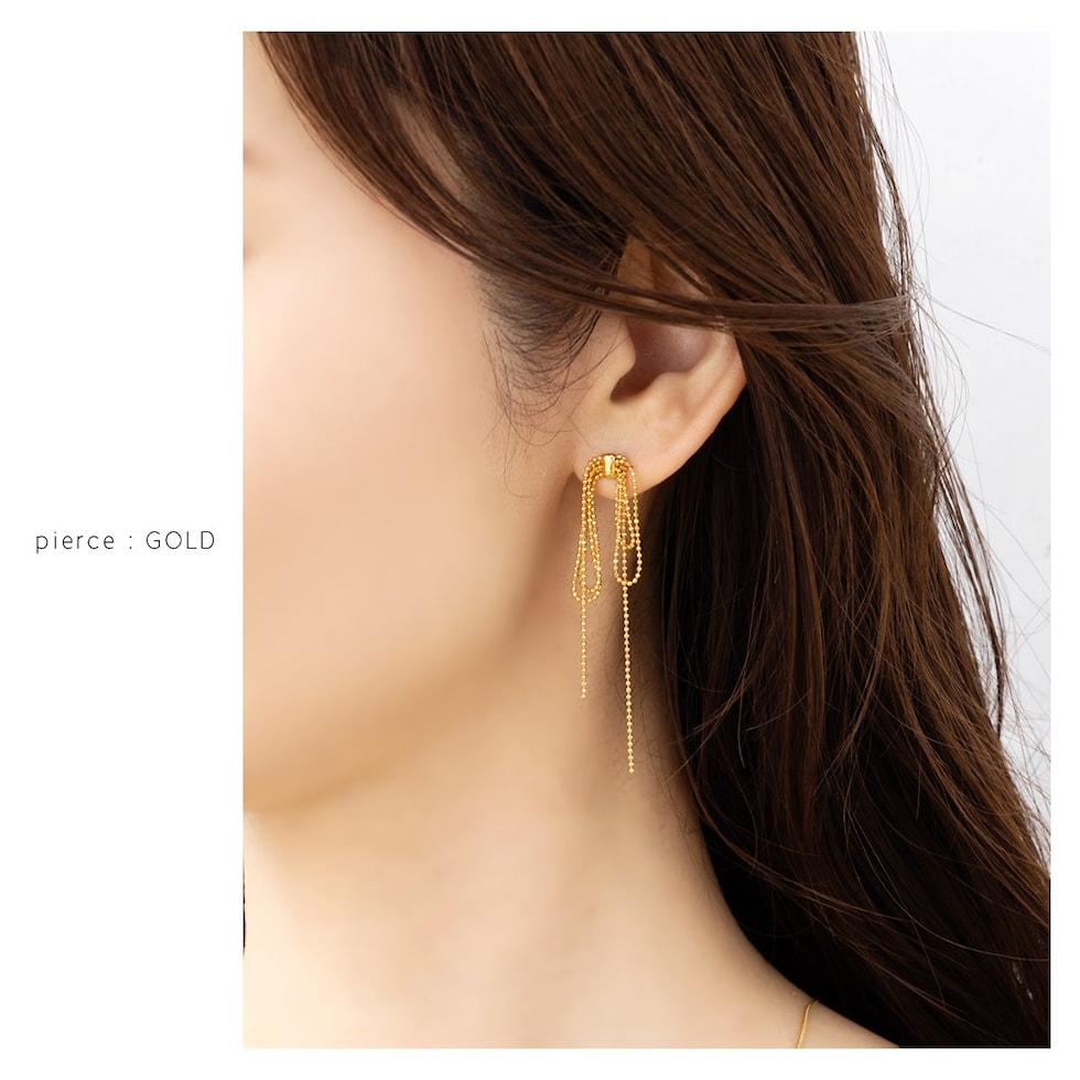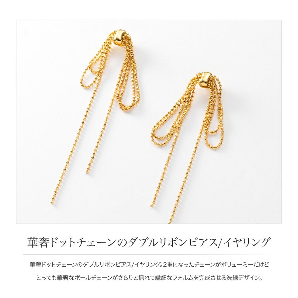 華奢ドットチェーンのダブルリボンピアス/イヤリング。2重になったチェーンがボリューミーだけどとっても華奢なボールチェーンがさらりと揺れて繊細なフォルムを完成させる洗練デザイン。