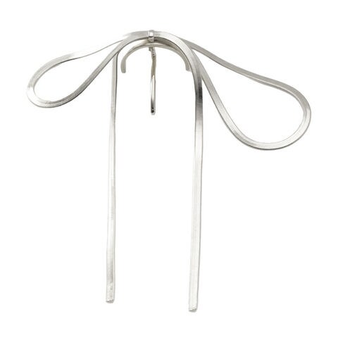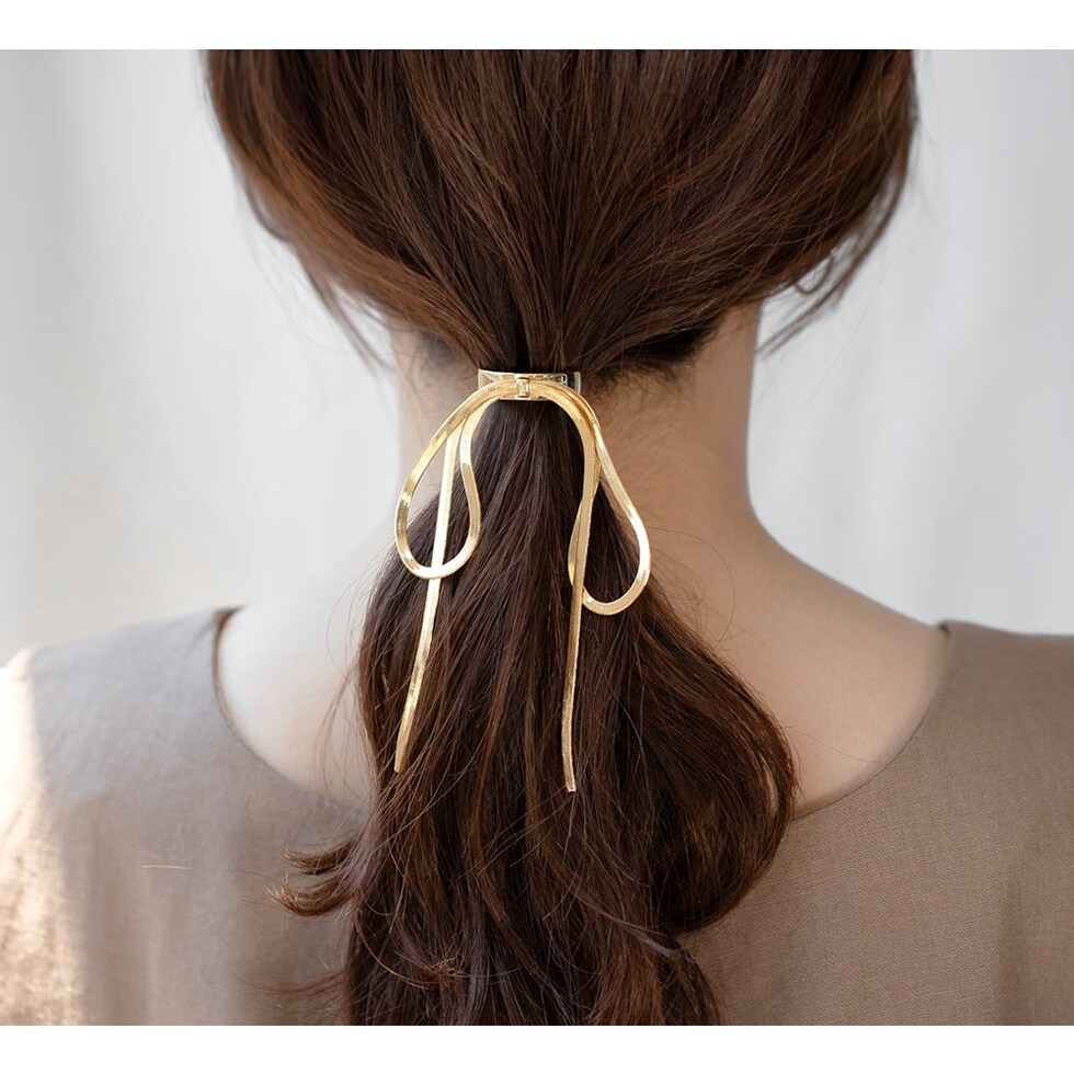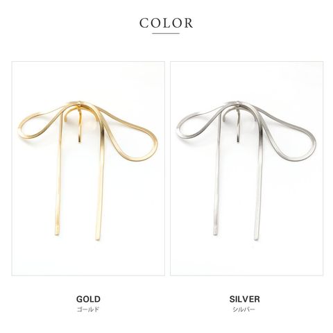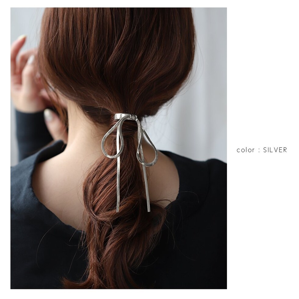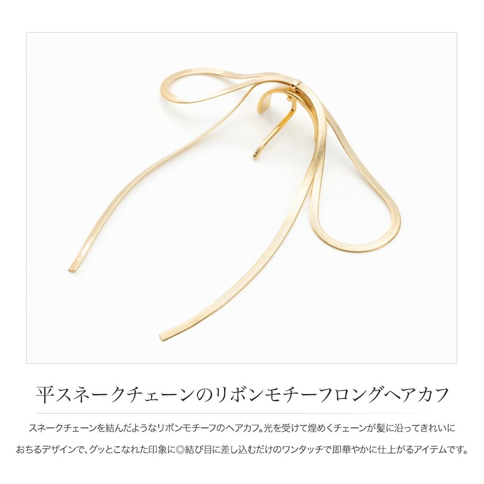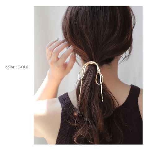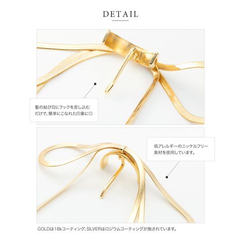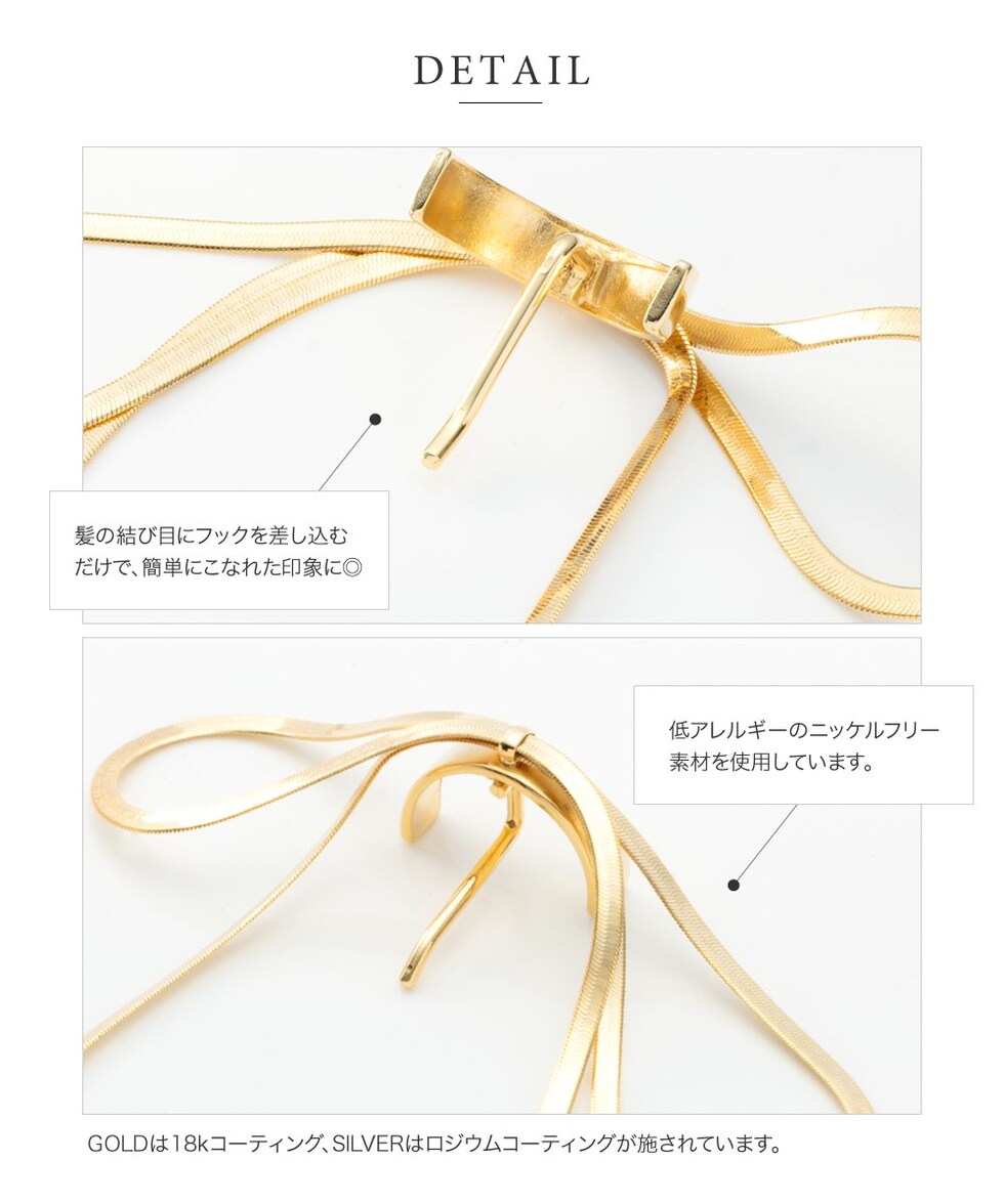 スネークチェーンを結んだようなリボンモチーフのヘアカフ。光を受けて煌めくチェーンが髪に沿ってきれいにおちるデザインで、グッとこなれた印象に◎結び目に差し込むだけのワンタッチで即華やかに仕上がるアイテムです。