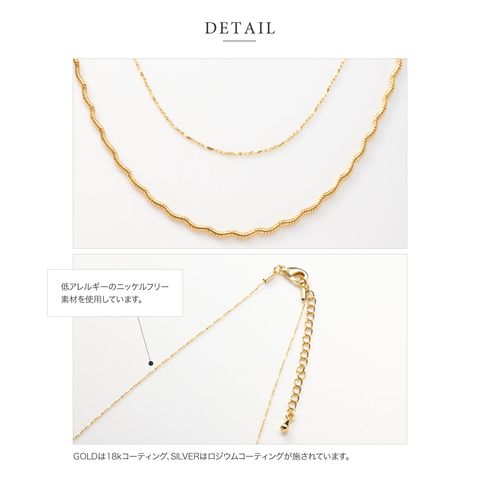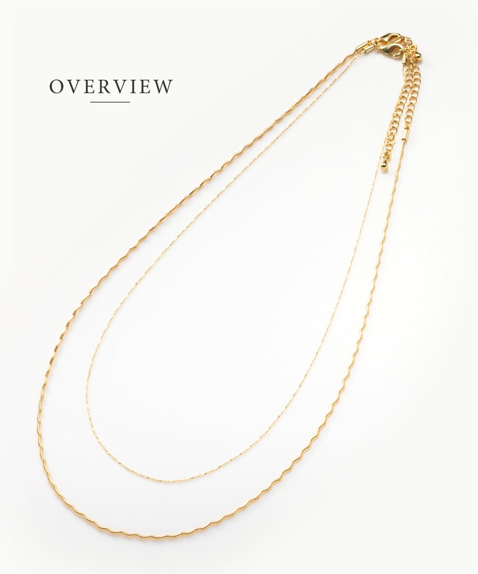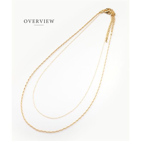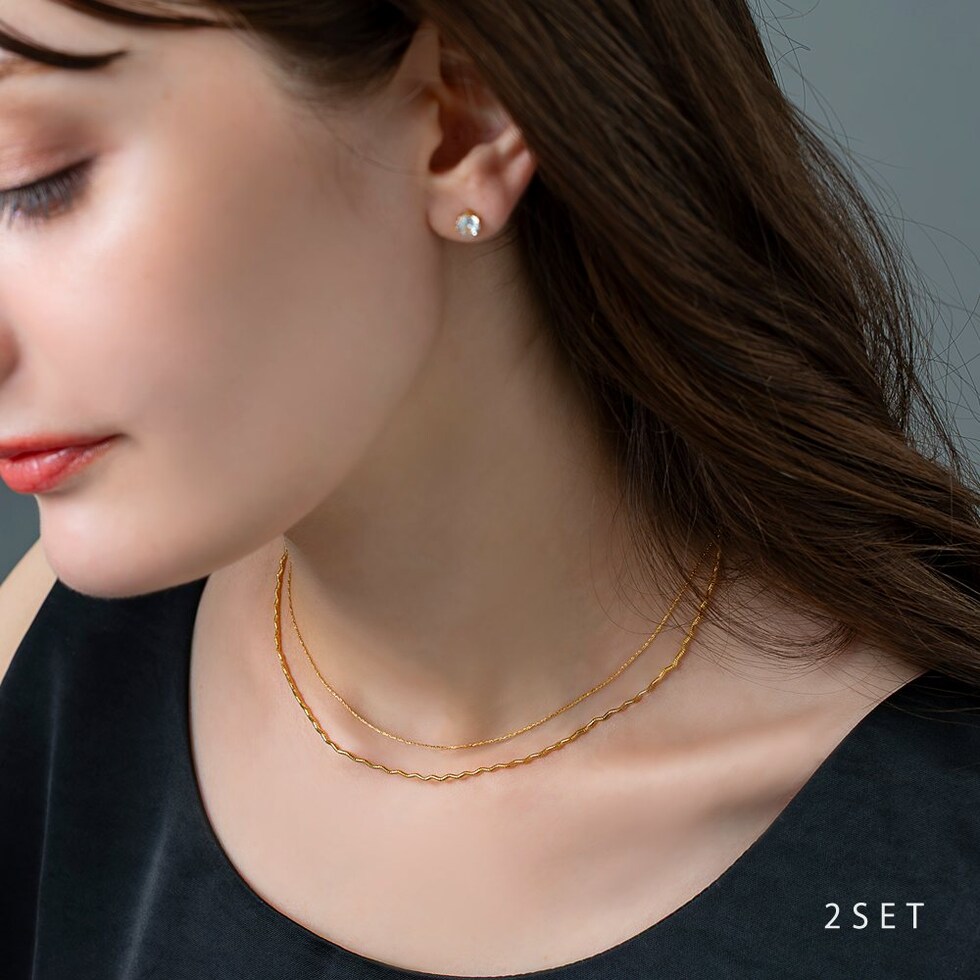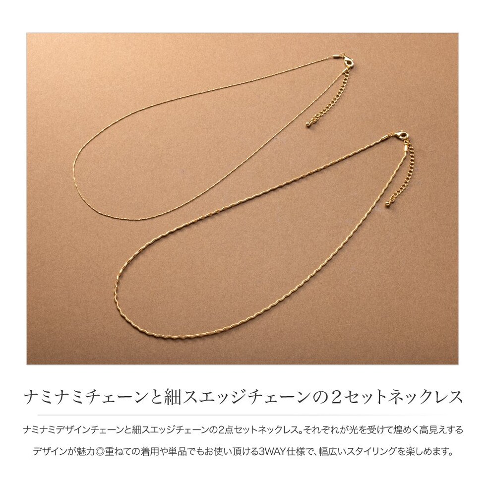 ナミナミデザインチェーンと細スエッジチェーンの2点セットネックレス。それぞれが光を受けて煌めく高見えするデザインが魅力◎重ねての着用や単品でもお使い頂ける3WAY仕様で、幅広いスタイリングを楽しめます。