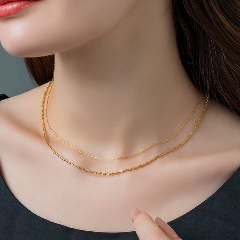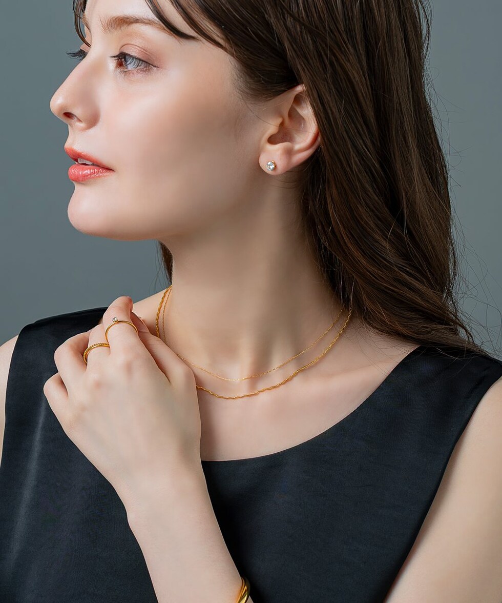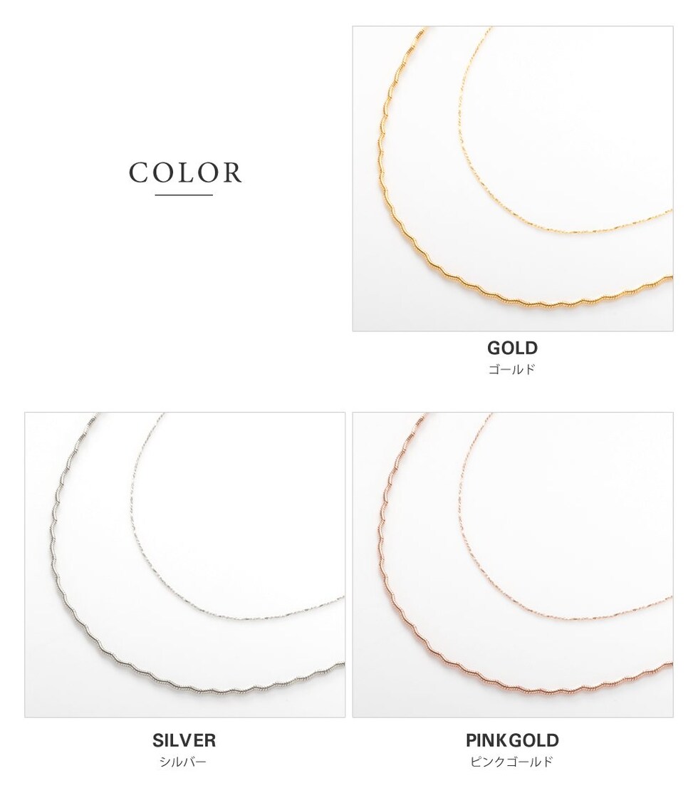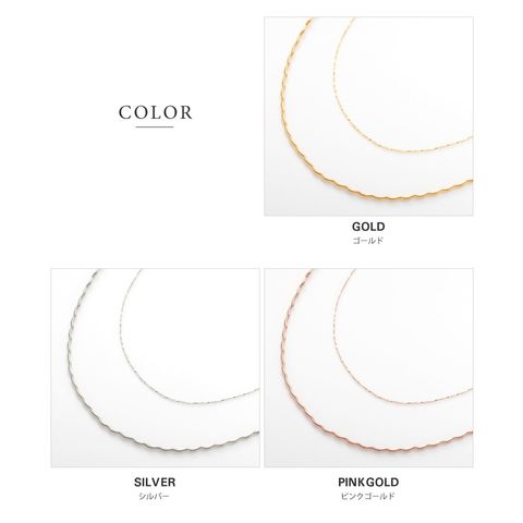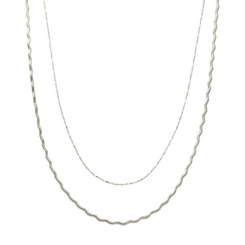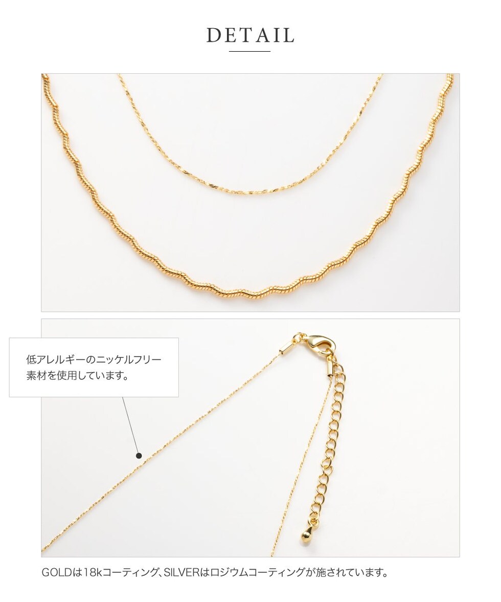ナミナミデザインチェーンと細スエッジチェーンの2点セットネックレス。それぞれが光を受けて煌めく高見えするデザインが魅力◎重ねての着用や単品でもお使い頂ける3WAY仕様で、幅広いスタイリングを楽しめます。