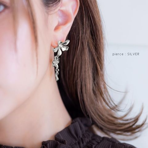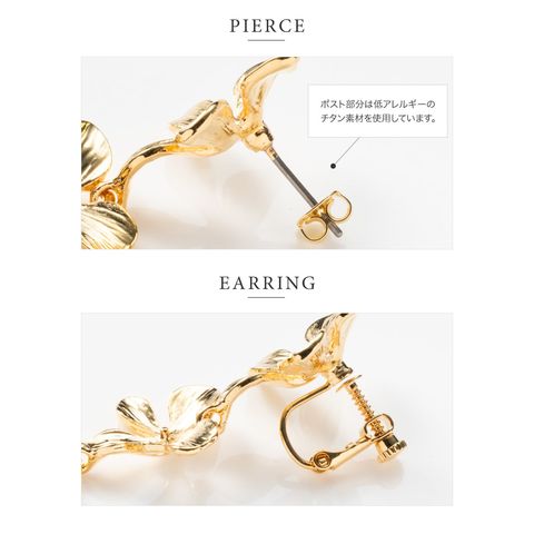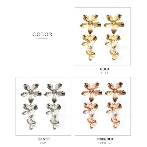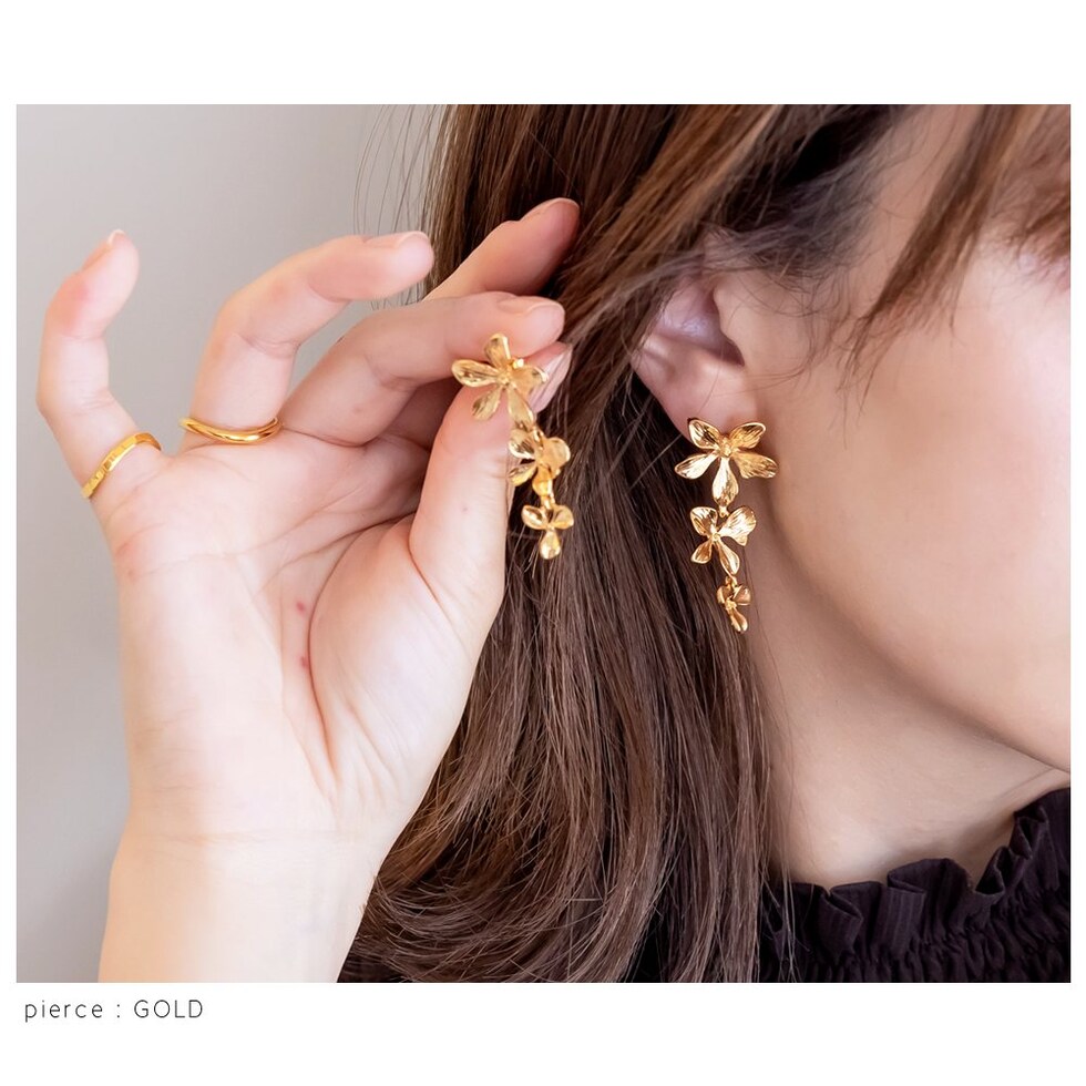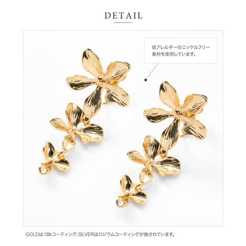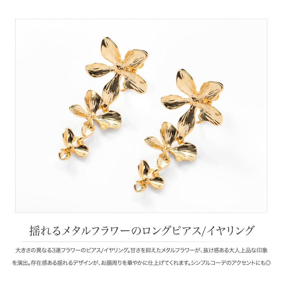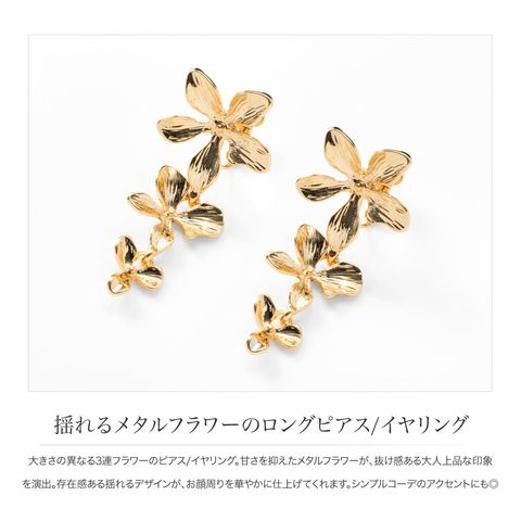 大きさの異なる3連フラワーのピアス/イヤリング。甘さを抑えたメタルフラワーが、抜け感ある大人上品な印象を演出。存在感ある揺れるデザインが、お顔周りを華やかに仕上げてくれます。シンプルコーデのアクセントにも◎