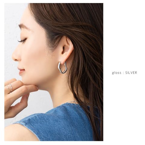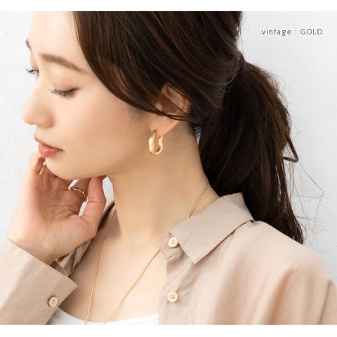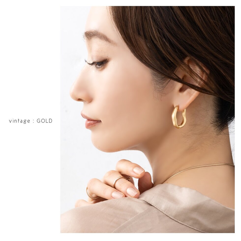 見る角度で表情が変化するニュアンスラインの変形キャッチレスピアス。ヴィンテージと艶ありの2タイプをご用意しました。抜け感のあるサイジングと技あり変形ラインが、いつものコーデを格上げしてくれるアイテムです。
