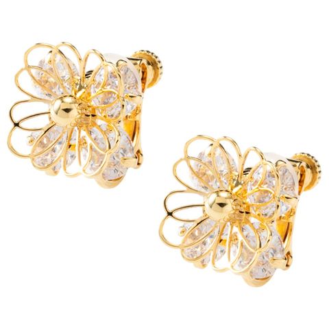 透かしフラワーのビジューイヤリング/ピアス。ワイヤーフラワーの奥に隠した4粒のジルコニアがさりげなく煌めき、絶妙なサイズ感でお顔周りを程よく飾ります。ちょっとした贈り物にも◎