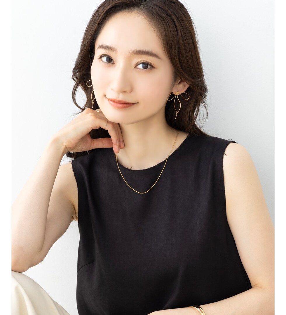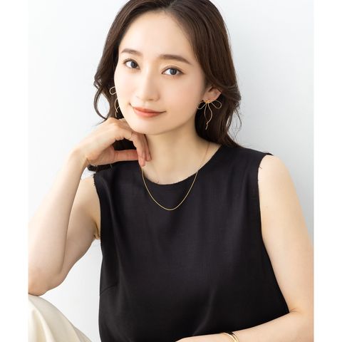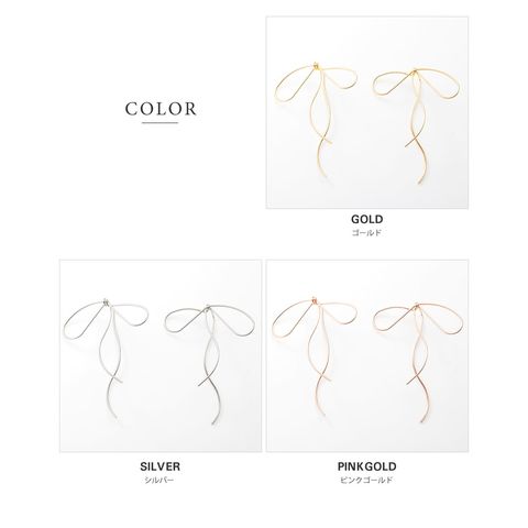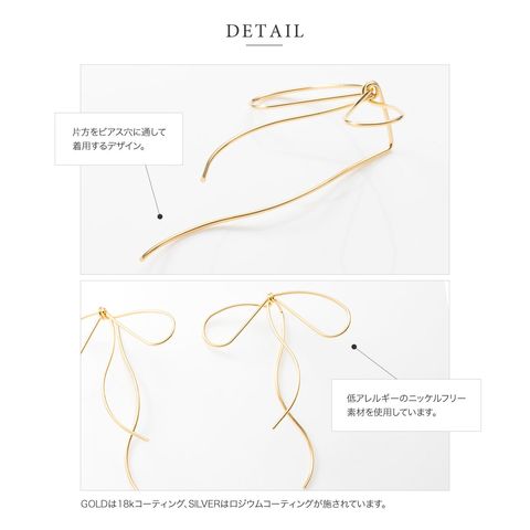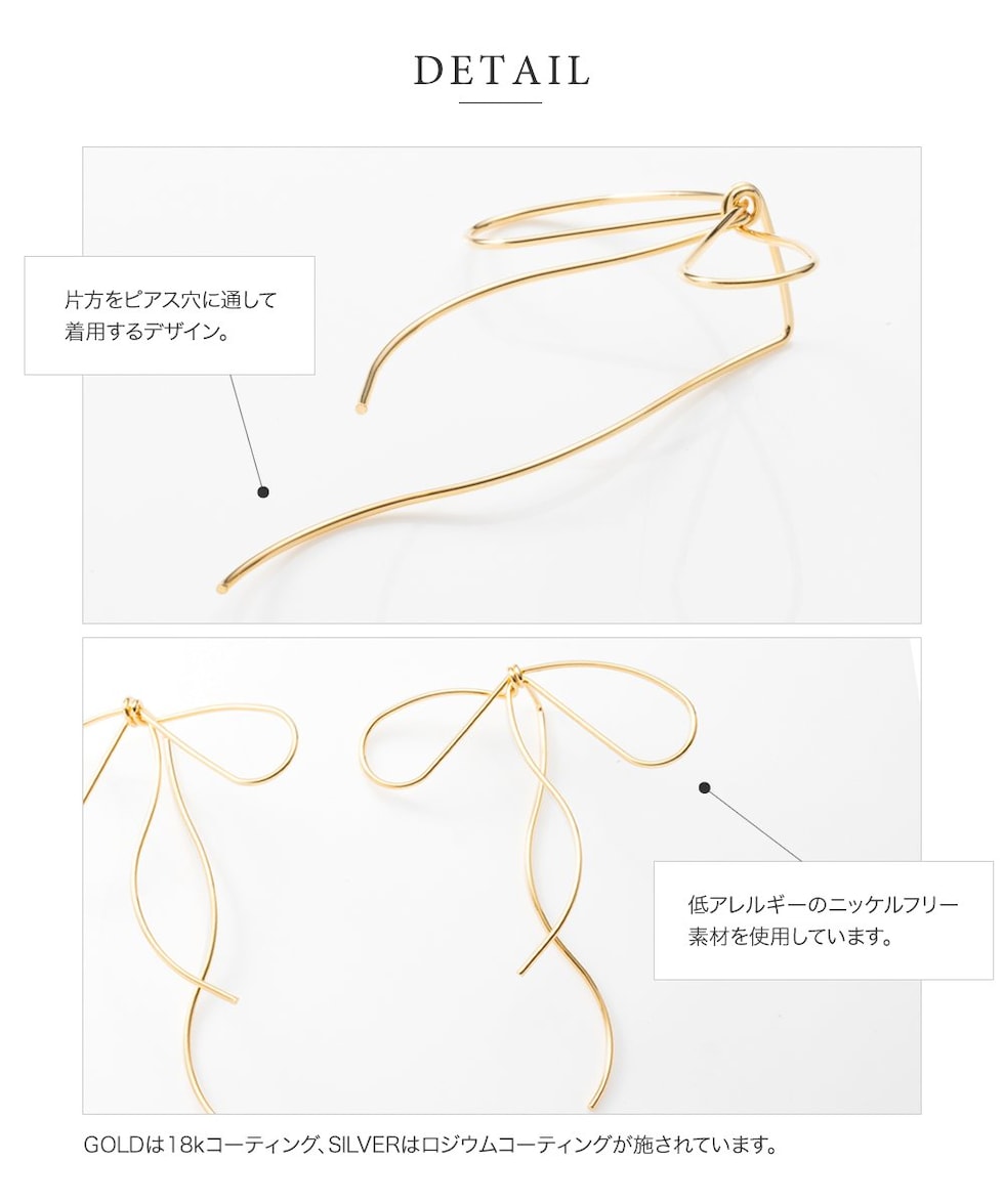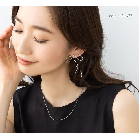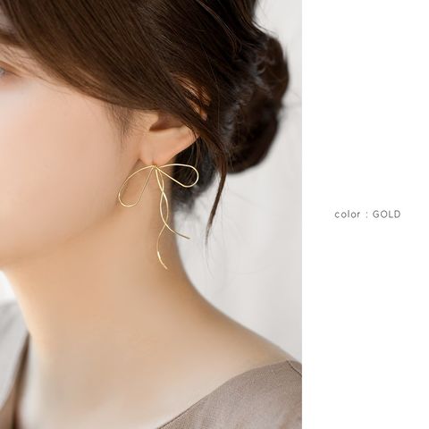 耳元でゆるりと結んでいる様なワイヤーリボンモチーフのピアス。先端を通して着用するから、リボンの片方が耳の後ろ側にある個性的なデザイン。華奢ラインの流れるようなリボンモチーフで、トレンドライクなスタイリングに◎