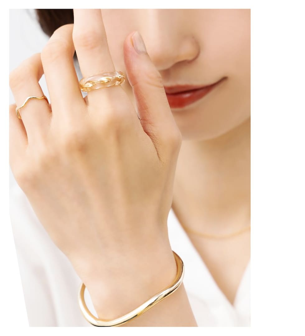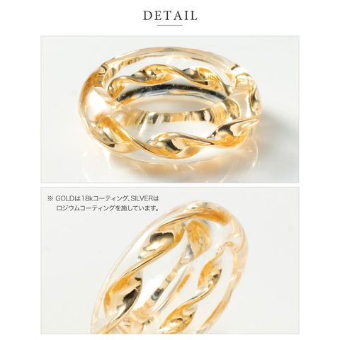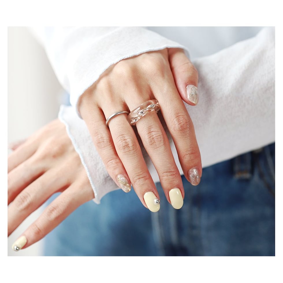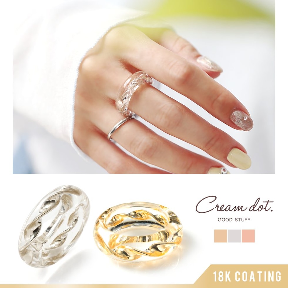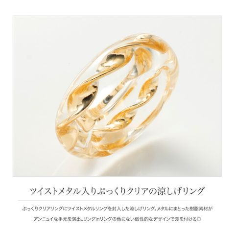 ぷっくりクリアリングにツイストメタルリングを封入した涼しげリング。メタルにまとった樹脂素材がアンニュイな手元を演出。リングinリングの他にない個性的なデザインで差を付ける◎