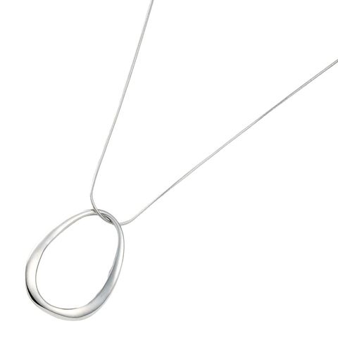 “ひねり”の効いたドロップフレームが揺れるステンレス製ロングネックレス。滑らかなスネークチェーンとの組み合わせが大人っぽさ満点で高見えしそう◎錆びにくいステンレス製でデイリーに活躍間違いナシ。