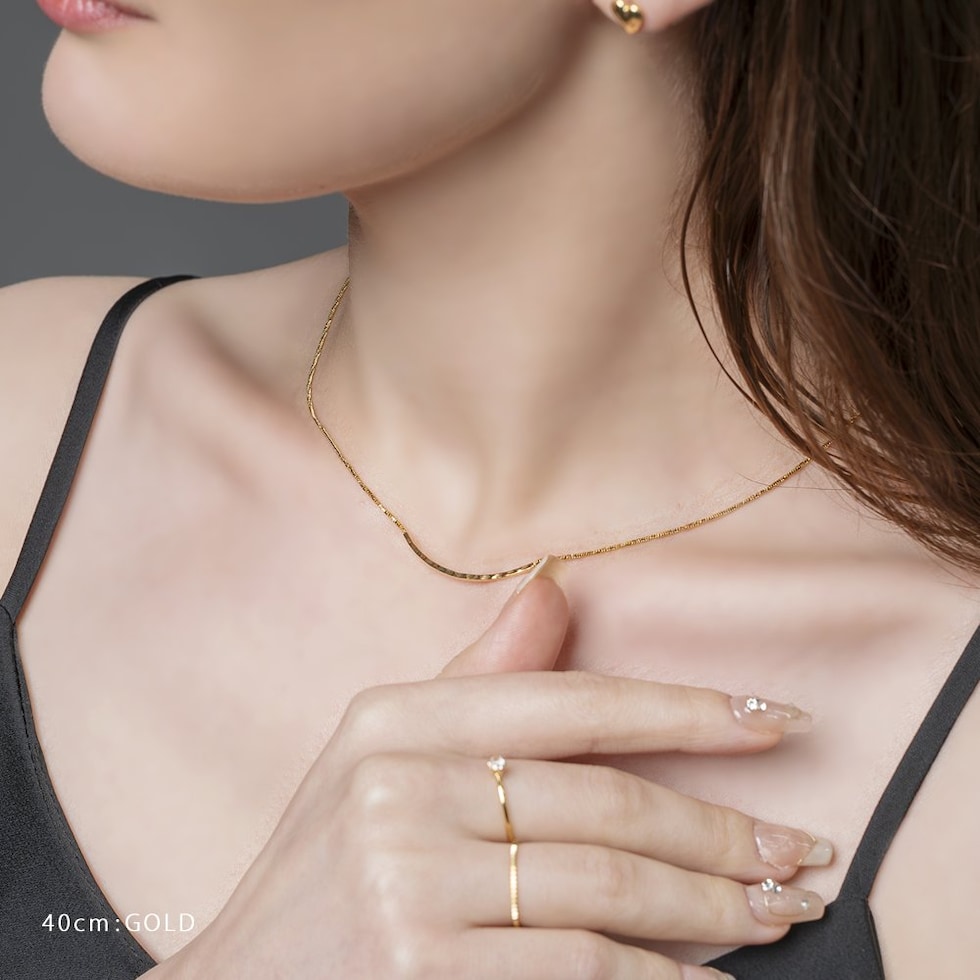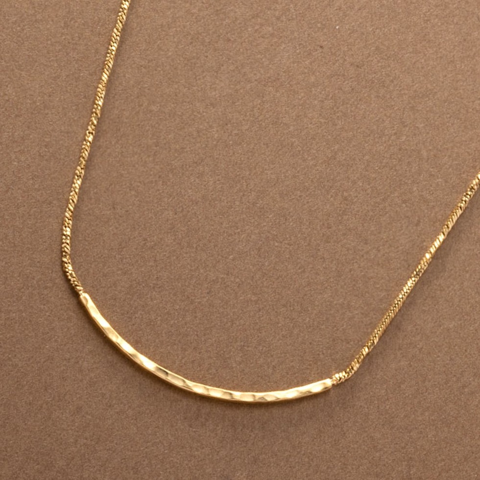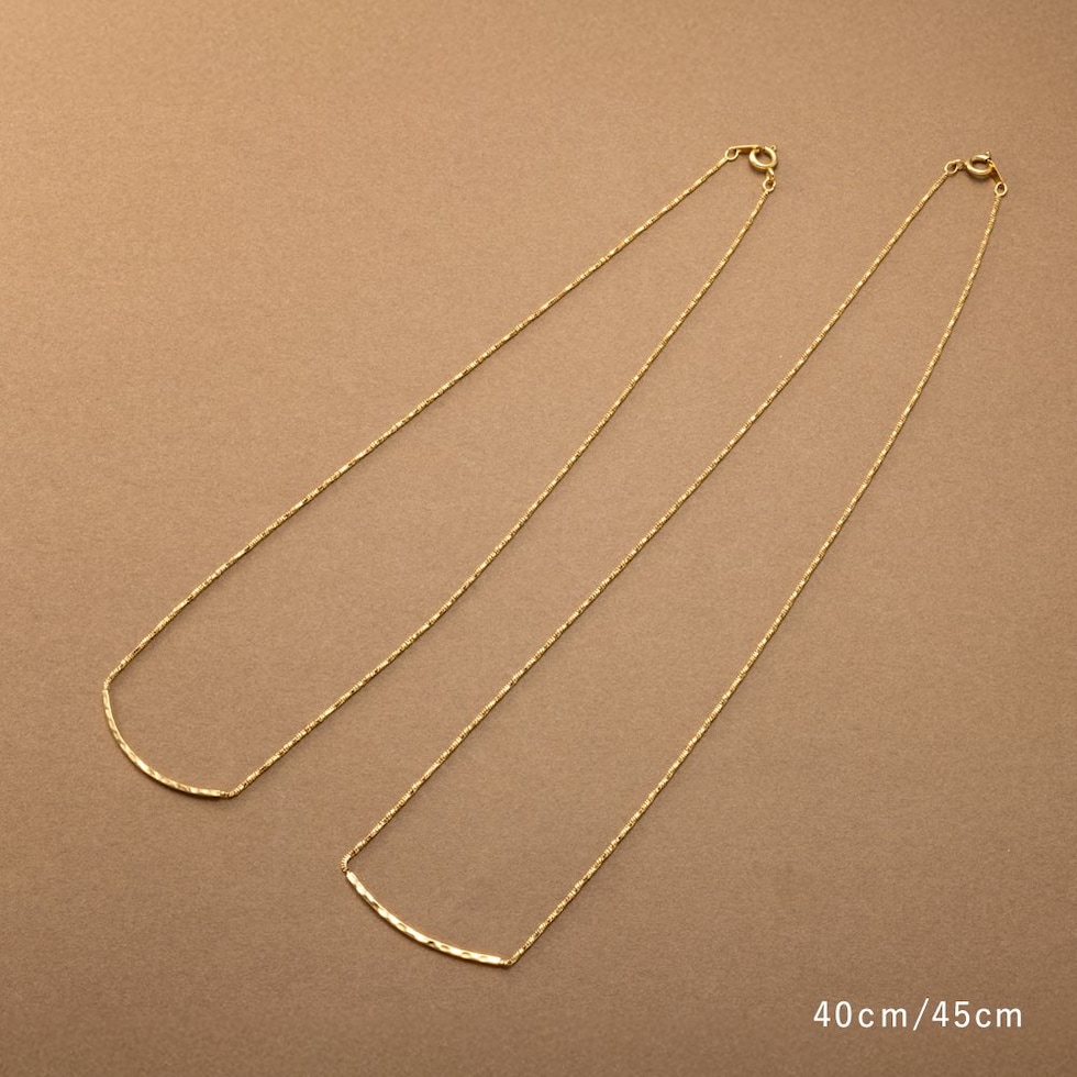 カーブバーのステンレス製華奢ネックレス。表面にたたき加工を施したカーブバーと繊細に煌めく華奢チェーンが肌馴染みの良いスキンジュエリー。女性特有の“曲線美”を惹き出す洗練デザインでデコルテをより美しく仕上げて。