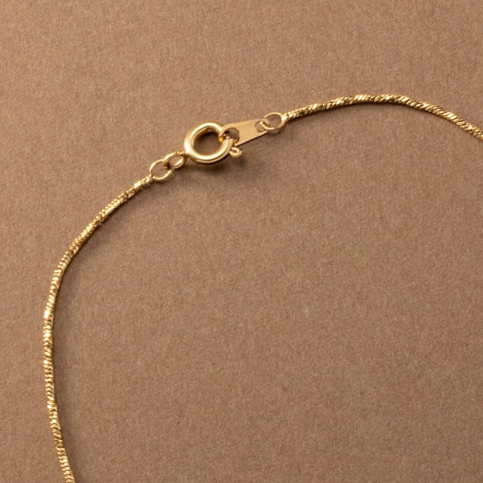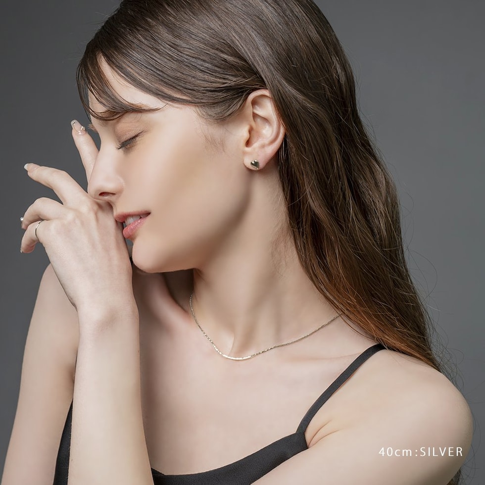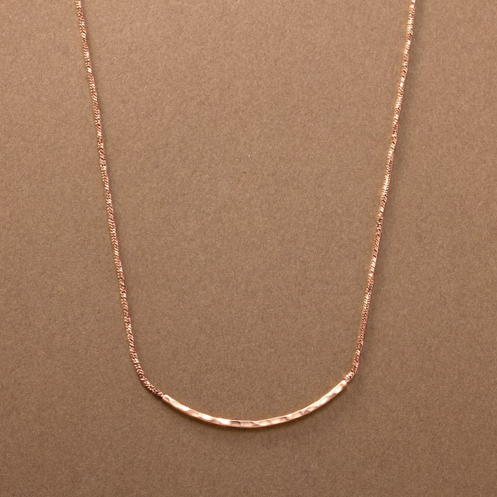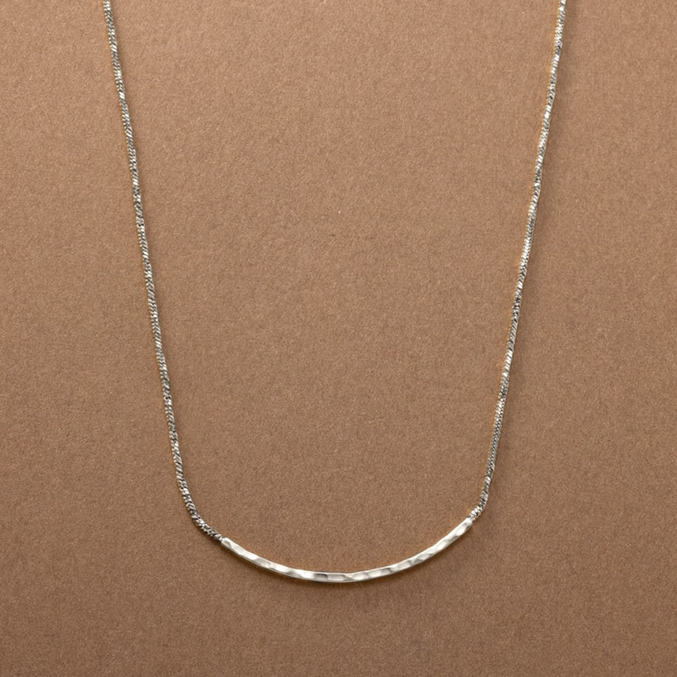 カーブバーのステンレス製華奢ネックレス。表面にたたき加工を施したカーブバーと繊細に煌めく華奢チェーンが肌馴染みの良いスキンジュエリー。女性特有の“曲線美”を惹き出す洗練デザインでデコルテをより美しく仕上げて。