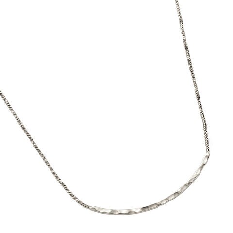 カーブバーのステンレス製華奢ネックレス。表面にたたき加工を施したカーブバーと繊細に煌めく華奢チェーンが肌馴染みの良いスキンジュエリー。女性特有の“曲線美”を惹き出す洗練デザインでデコルテをより美しく仕上げて。
