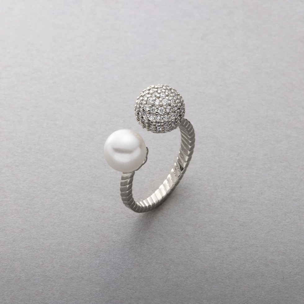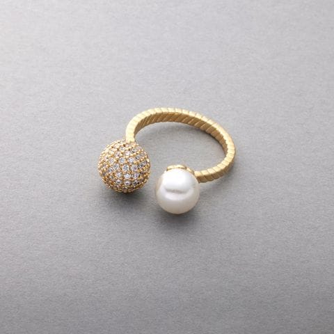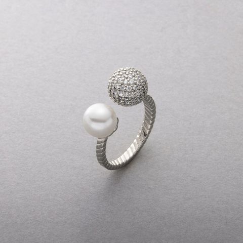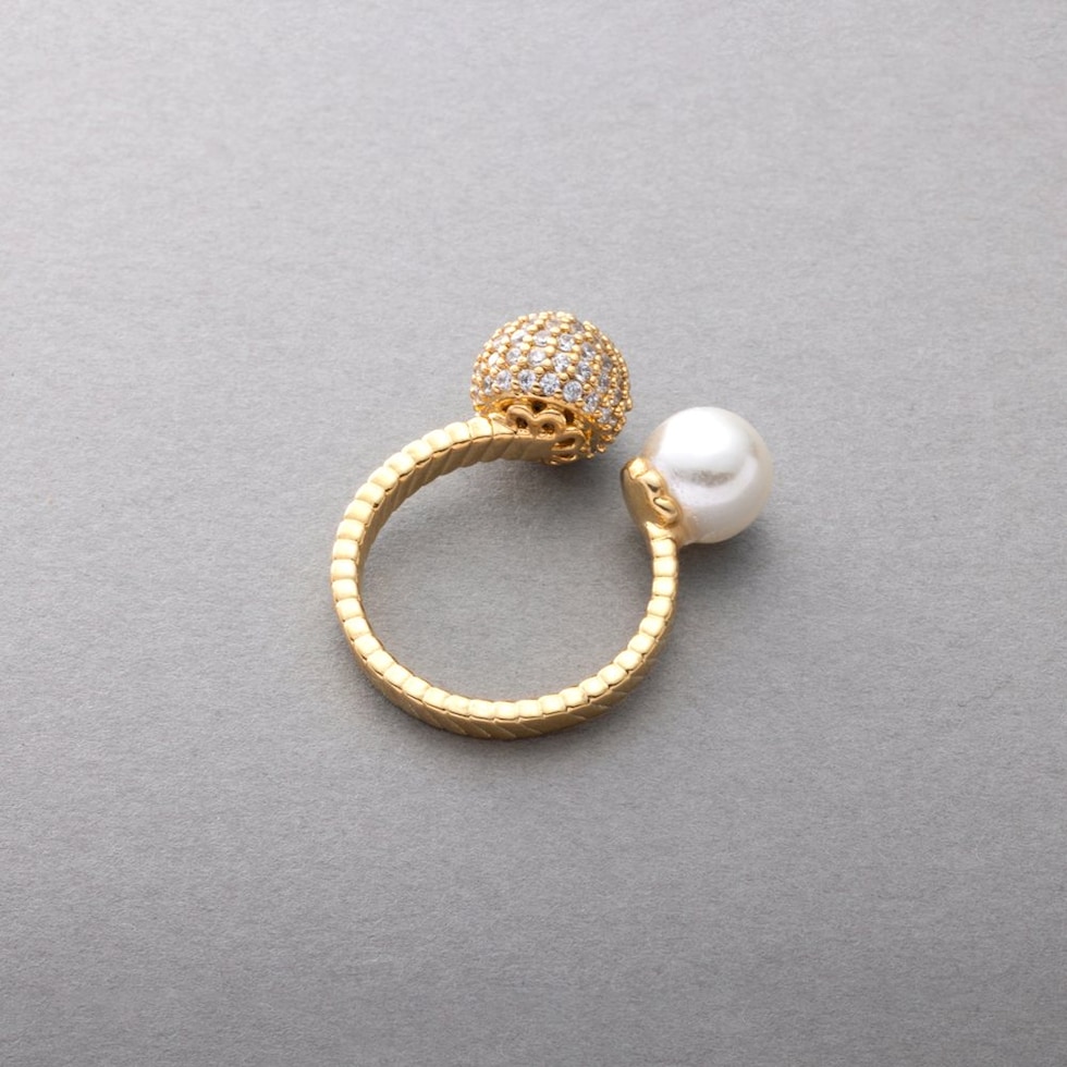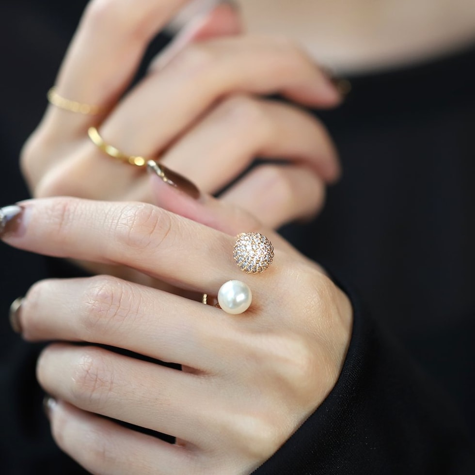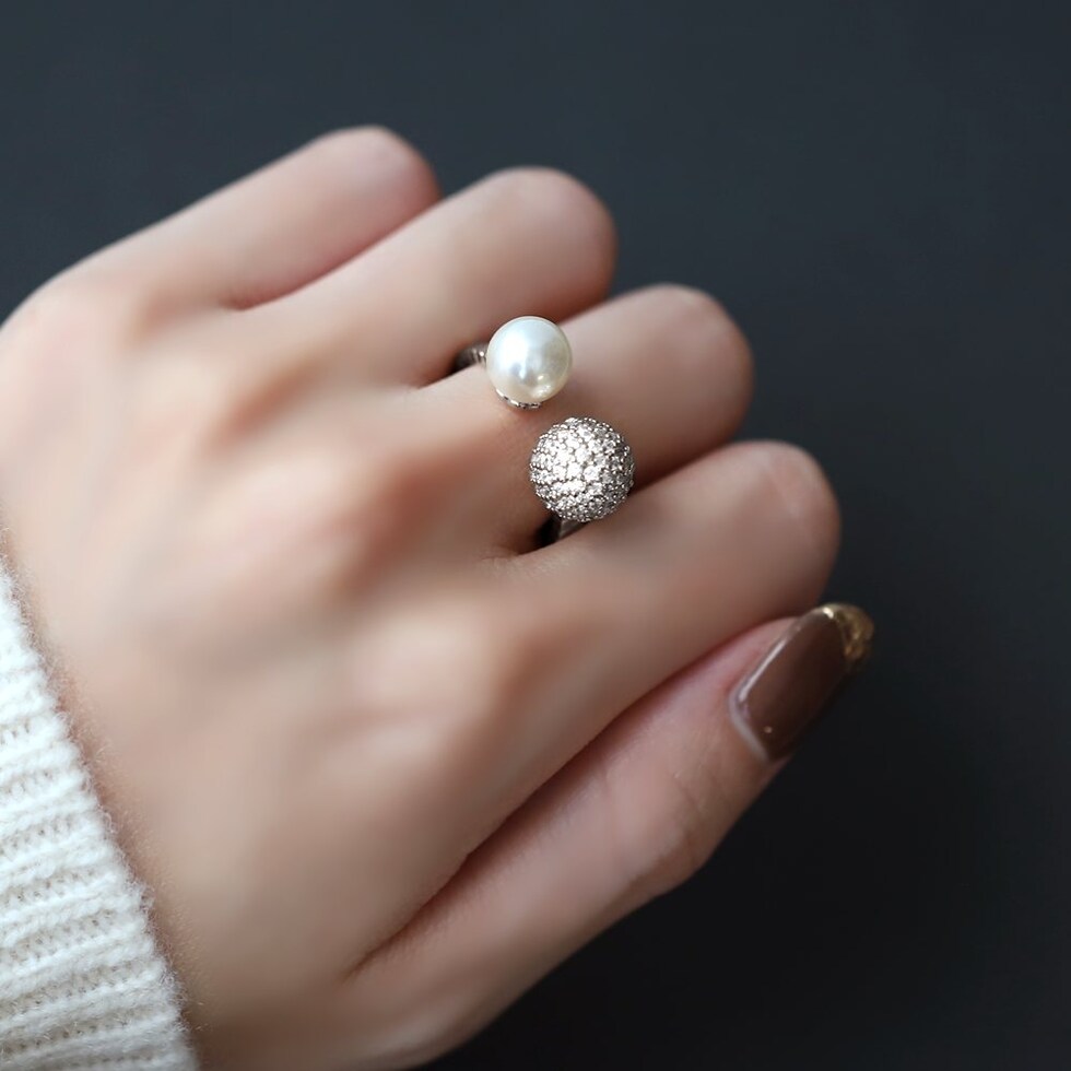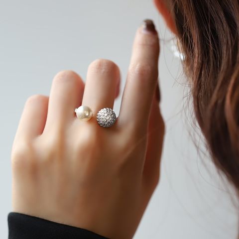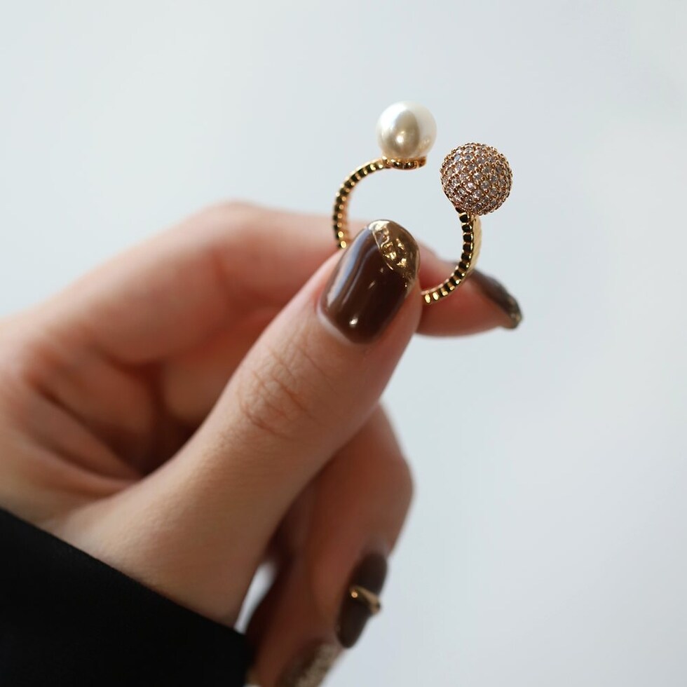 艶めくパールと繊細に煌めくパヴェボールのフォークリング。パールとビジューを組み合わせたデザインリングは、女性らしい上品な雰囲気を演出。立体感あるフォルムと繊細な煌めきが手元を華やかに魅せてくれます。フリーサイズのオープンリングだから、どの指にも幅広く使えそう◎低アレルギーのニッケルフリー素材を使用しているので、長時間の着用も安心です。