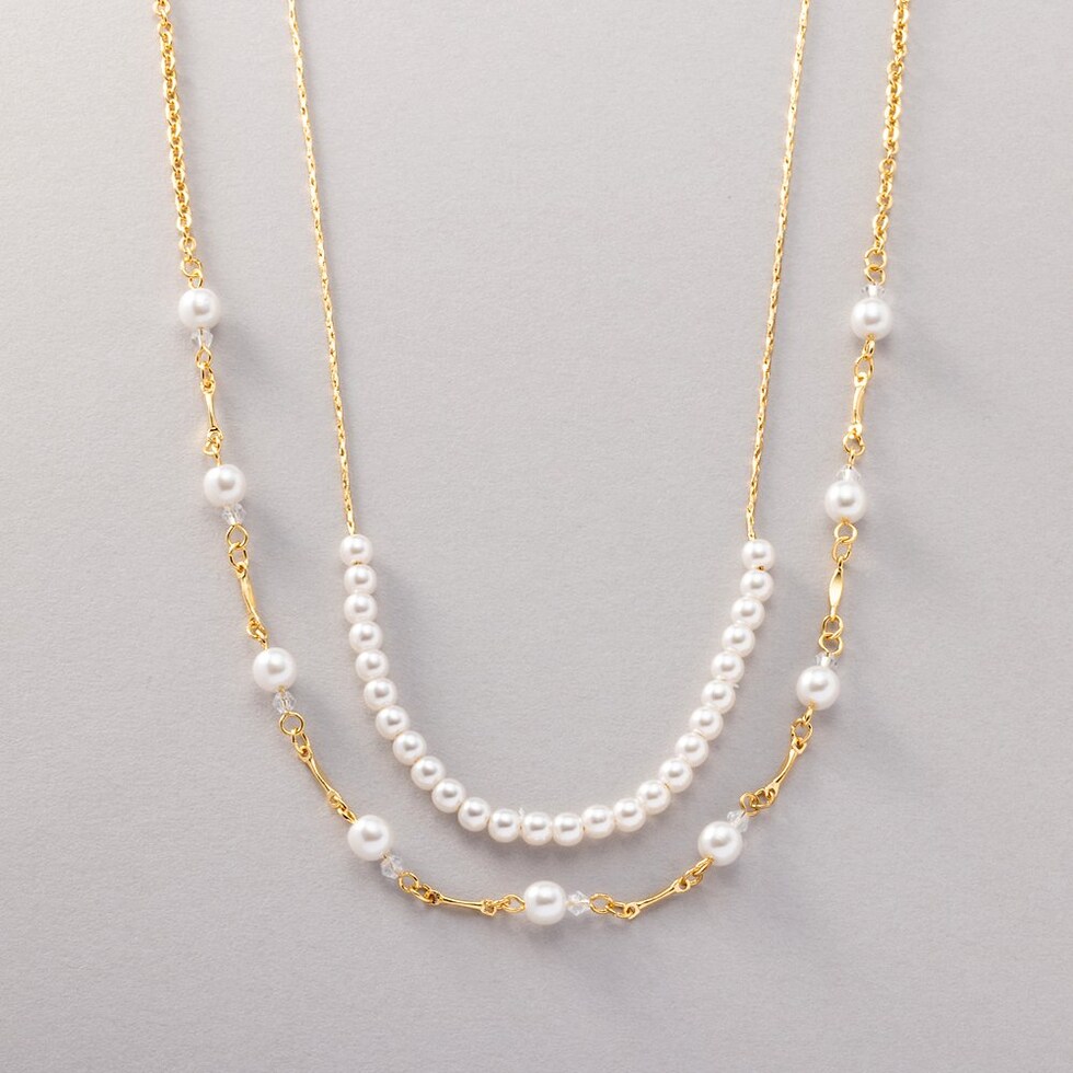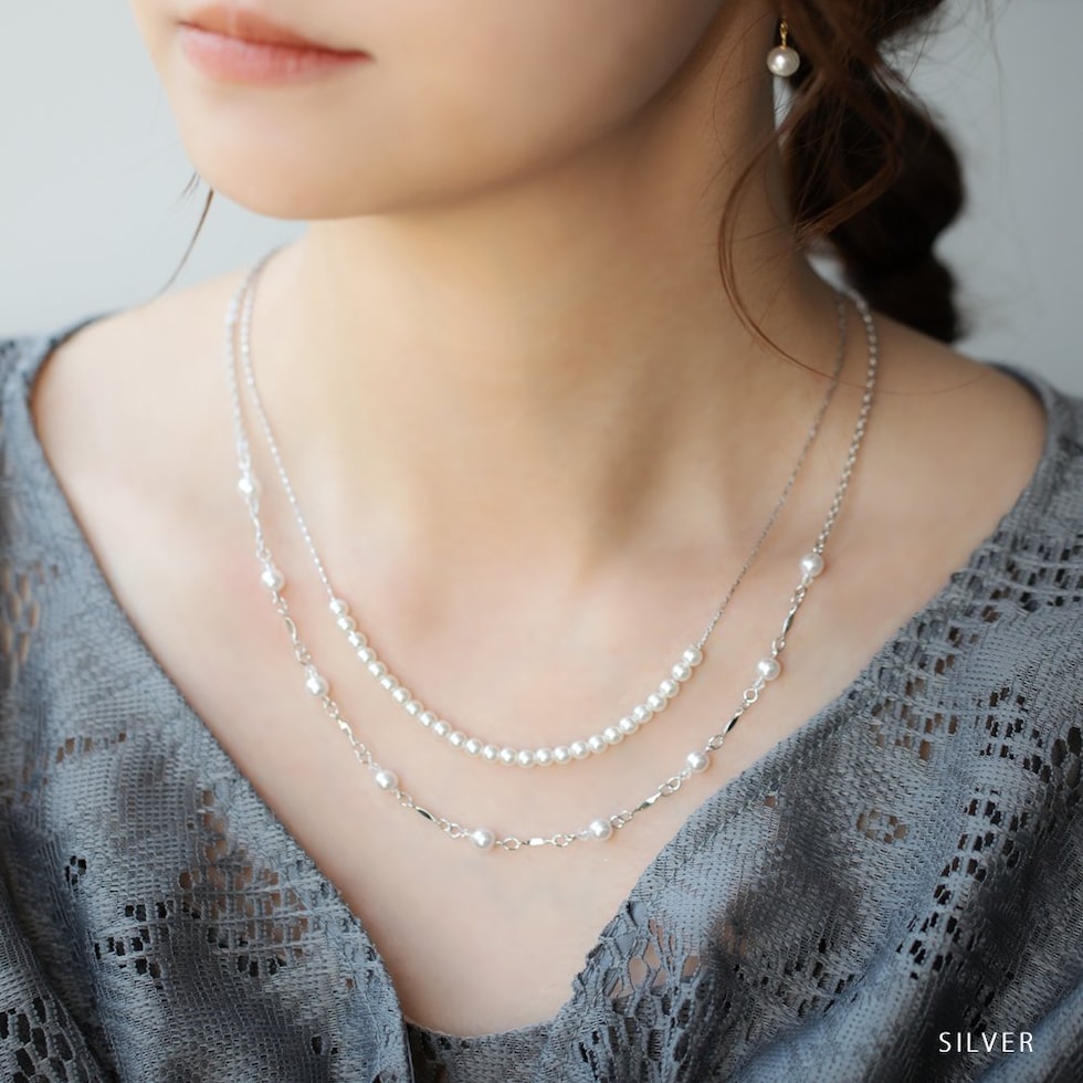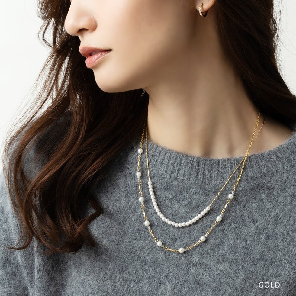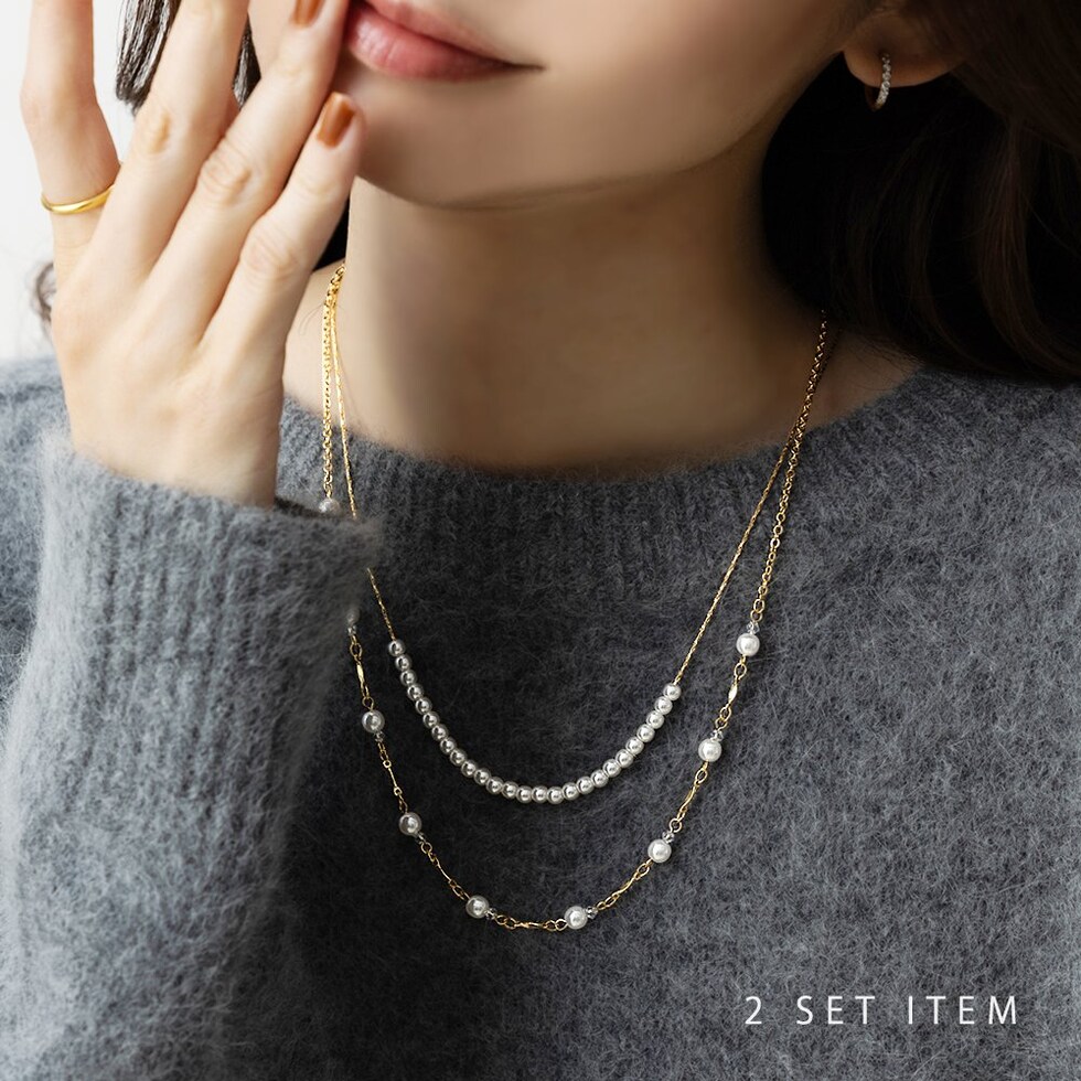 小粒パールを贅沢に使用した2SETネックレス。華やかながらも小粒パールが主張しすぎず、単品でもセットでもアレンジ豊富だから幅広く使えそう◎お呼ばれシーンにはもちろんきれいめコーデのアクセントにもgood。