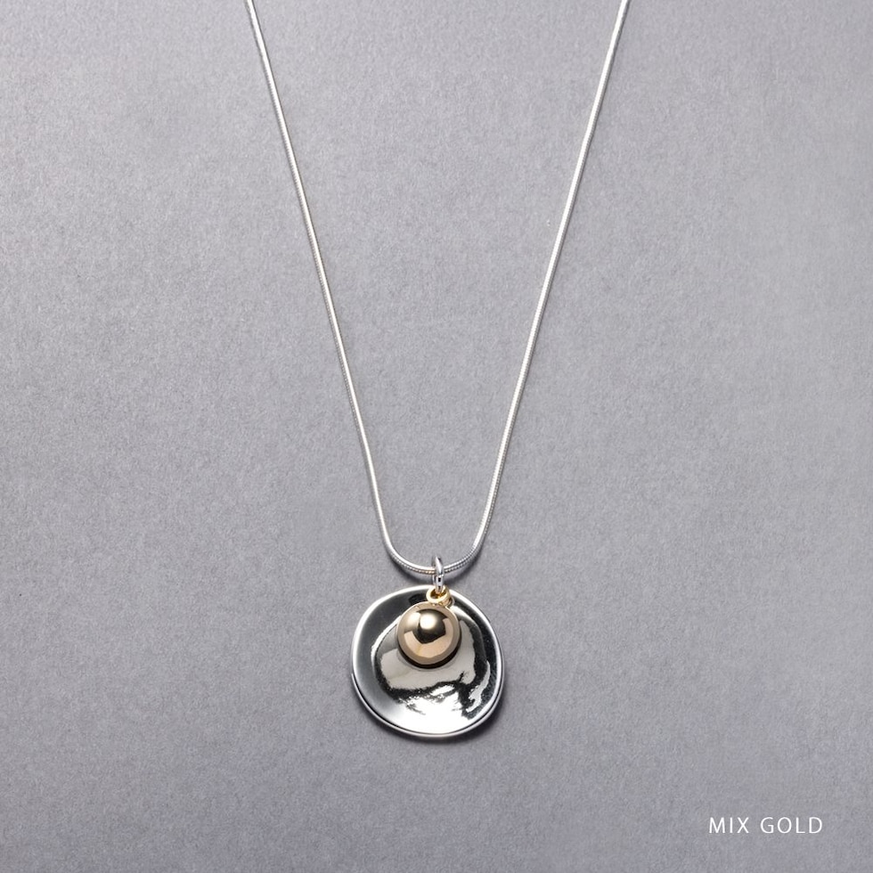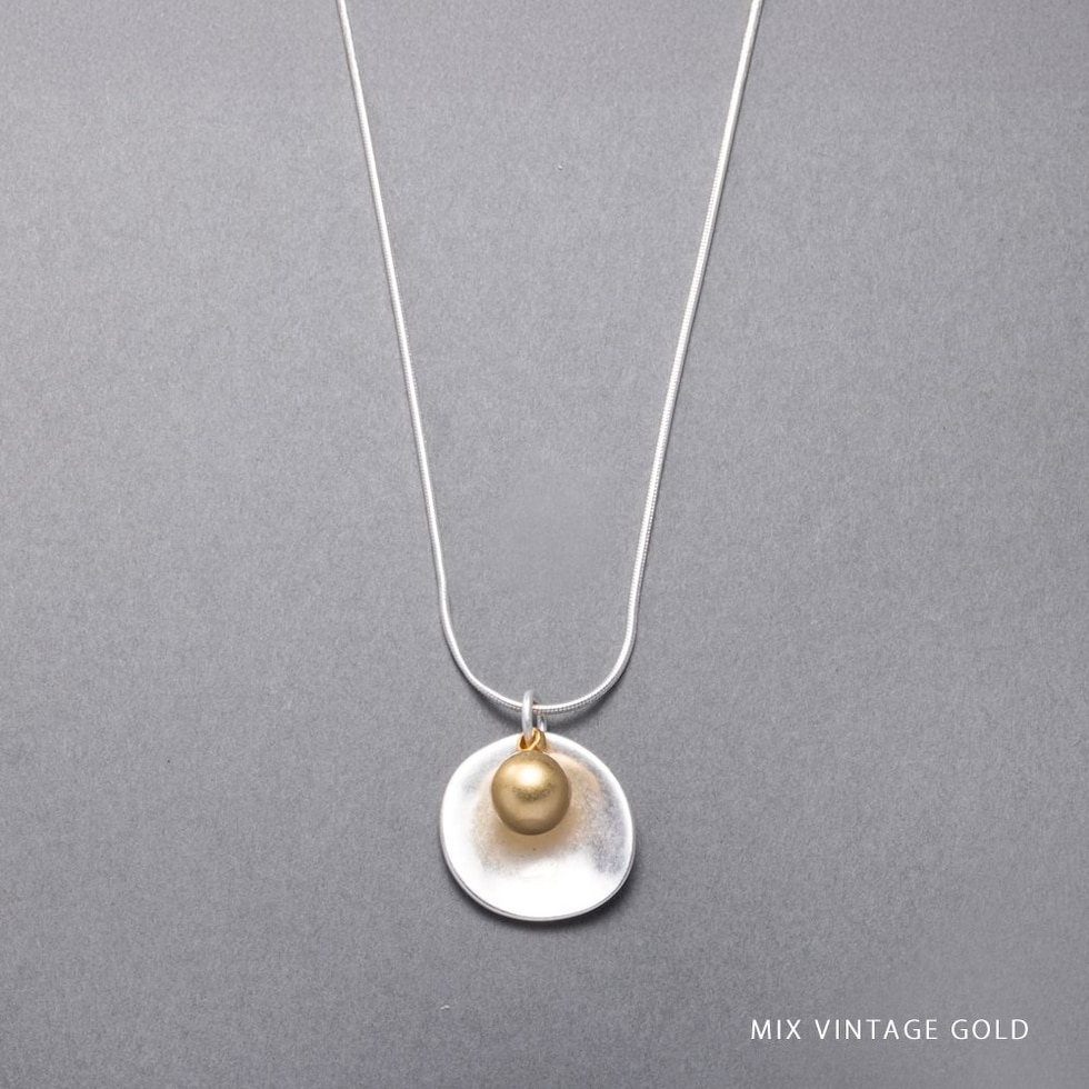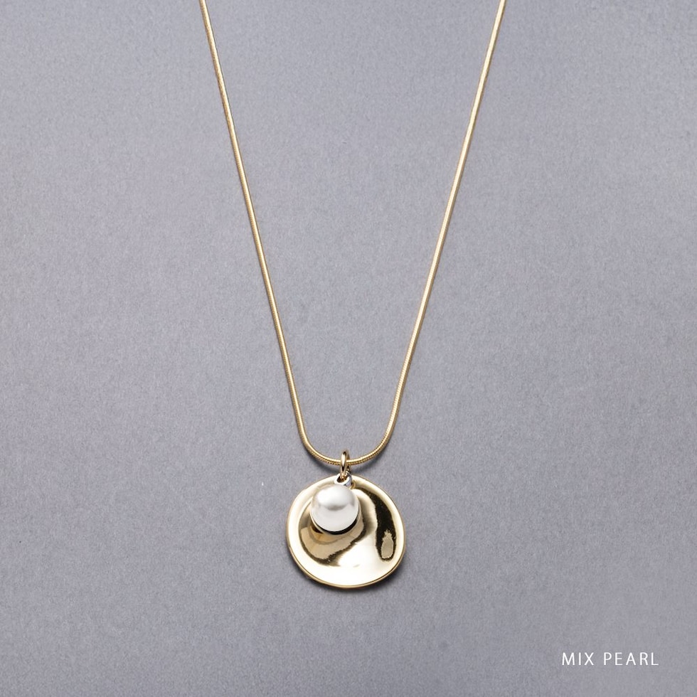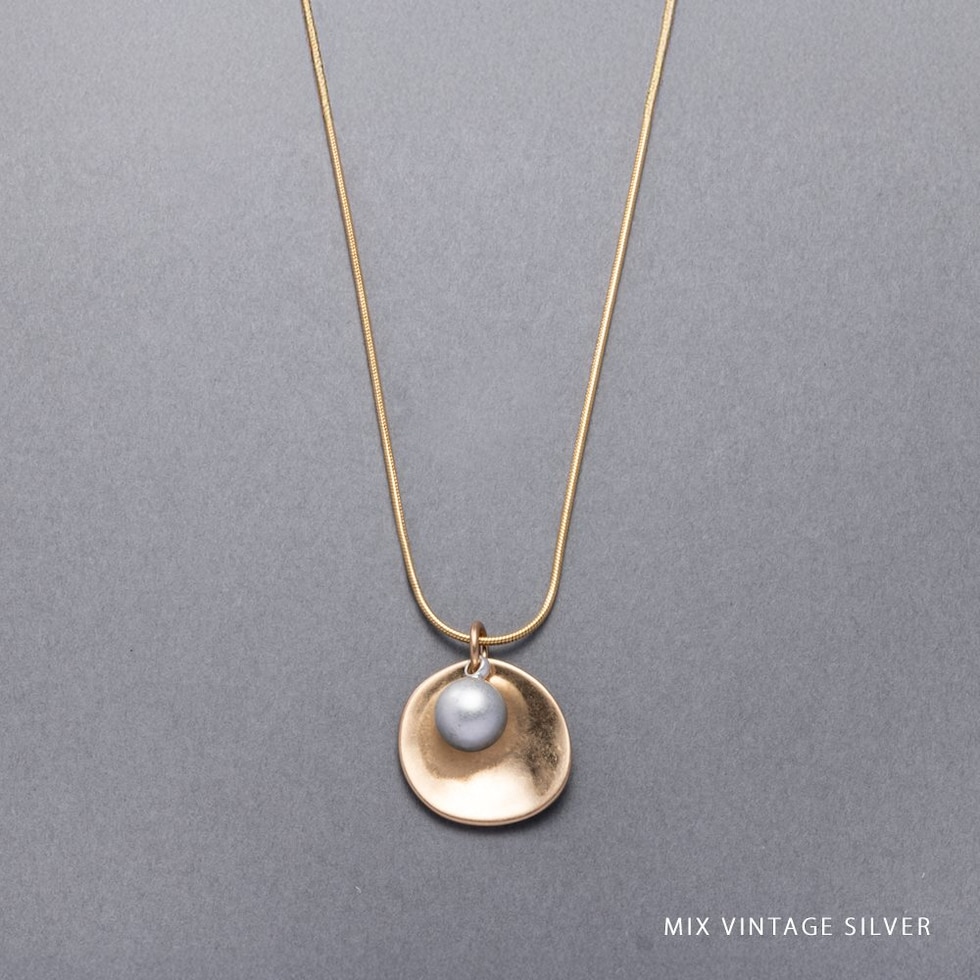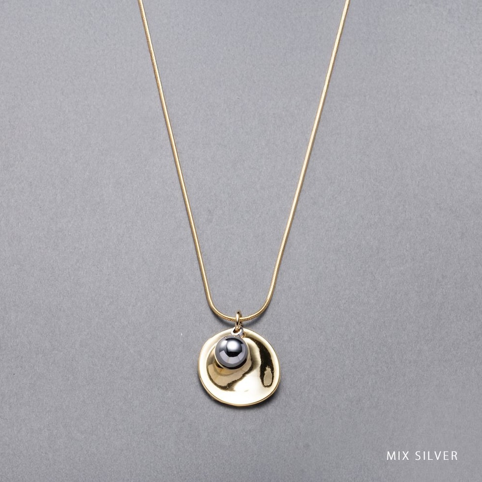 ニュアンスプレートとメタルスフィア/パールをMIXしたロングネックレス。艶とヴィンテージの質感から選べる2type展開です。スネークチェーンでスッキリと仕上げたアイテムはコーデが物足りない時のワンポイントに最適◎